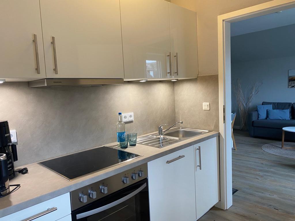 Die separate Küche ist modern ausgestattet und vollständig eingerichtet – mit Spülmaschine, Mikrowelle, Kaffeemaschine, Wasserkocher und allem, was es für eine unkomplizierte Selbstversorgung braucht. Kochen darf hier leicht sein, nicht aufwendig.