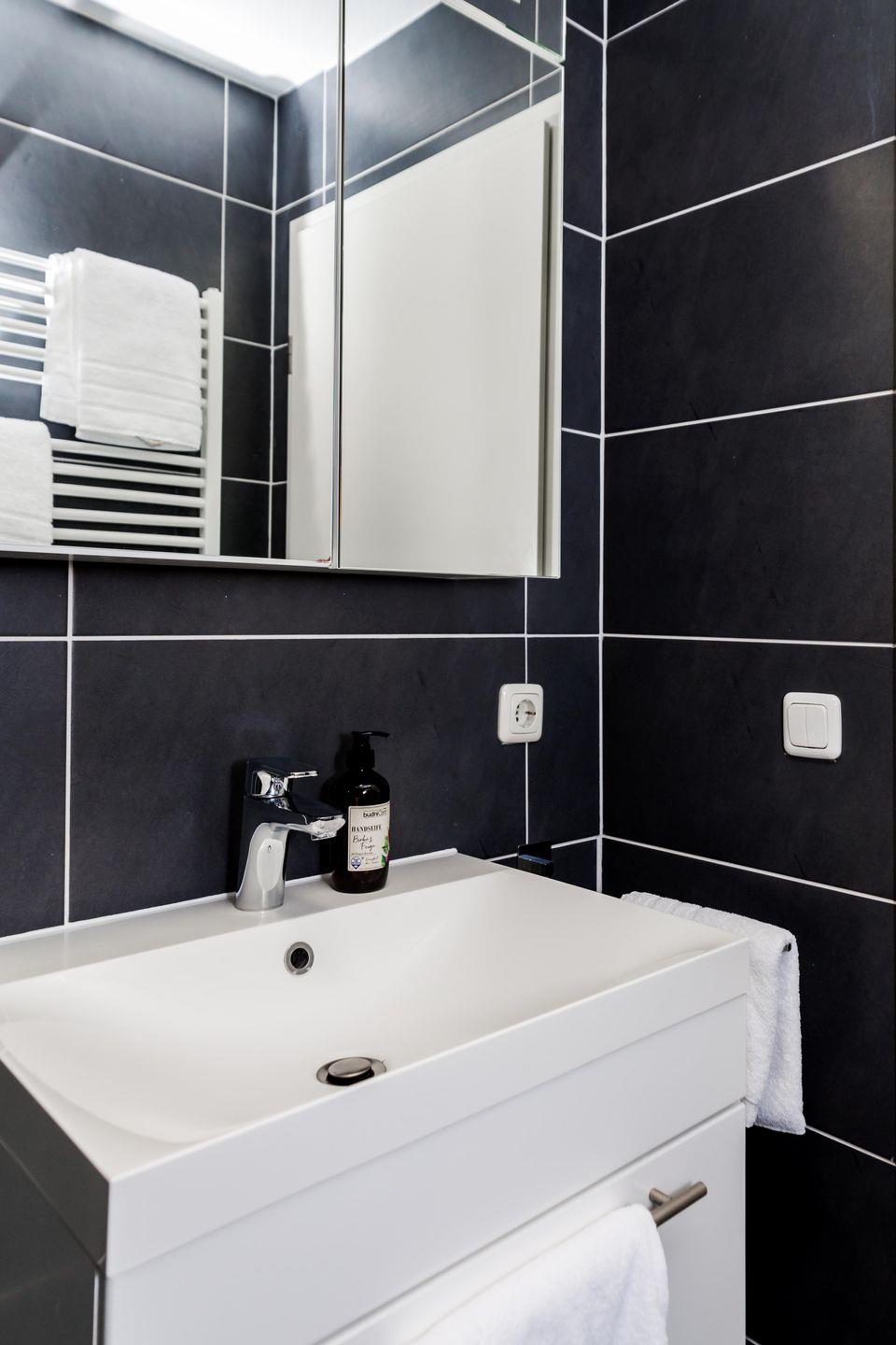 Der Wohnbereich ist offen gestaltet und lichtdurchflutet. Helle Farben, klare Linien und eine gemütliche Sofaecke schaffen einen Raum, in dem man gern verweilt – morgens bei einer Tasse Kaffee, abends bei einem Glas Wein. Der Tisch im Wohnbereich ist ein schöner Ort für gemeinsame Mahlzeiten, Gespräche oder einen ruhigen Start in den Tag. Die voll ausgestattete Küche bietet alles, was es für eine unkomplizierte Selbstversorgung braucht – praktisch, gut organisiert und angenehm integriert.