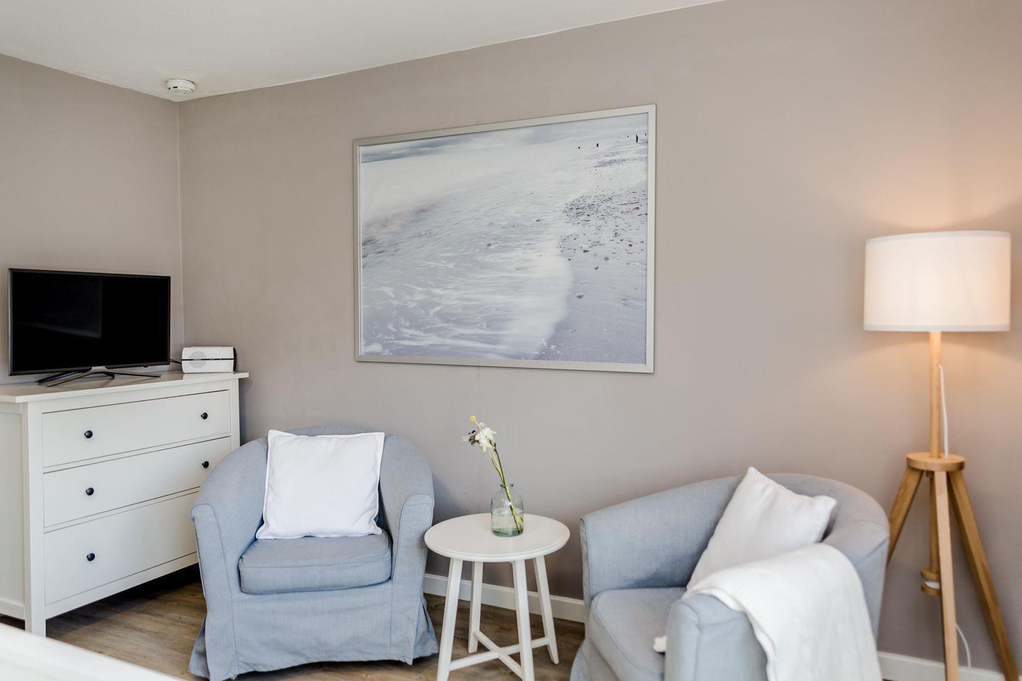 Ein besonderes Plus ist der eigene Gartenbereich, der dem Appartement exklusiv zur Verfügung steht. Hier lässt sich Zeit draußen verbringen – im Strandkorb, bei einem Frühstück in der Morgensonne oder einfach für eine ruhige Pause an der frischen Nordseeluft. Ein geschützter Ort, der den Aufenthalt angenehm ergänzt, ohne sich in den Vordergrund zu drängen.