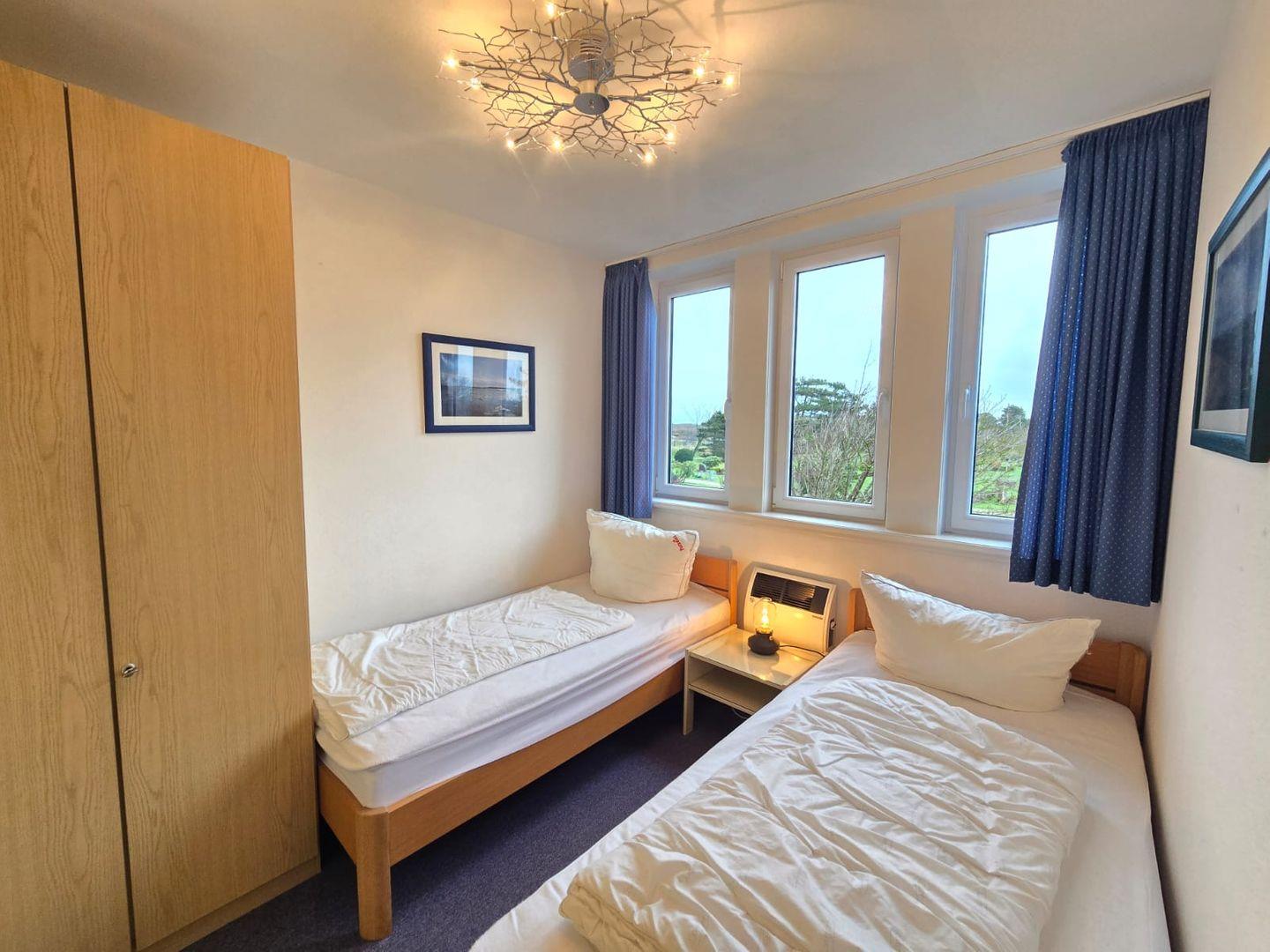Die beiden Schlafzimmer sind elegant eingerichtet und verfügen jeweils über zwei komfortable Einzelbetten. Die ruhige Lage der Zimmer und die hochwertigen Matratzen garantieren erholsamen Schlaf und einen frischen Start in den Tag. Das Badezimmer ist modern gestaltet und verfügt über eine Dusche, ein Waschbecken sowie einen stilvollen Spiegelschrank.