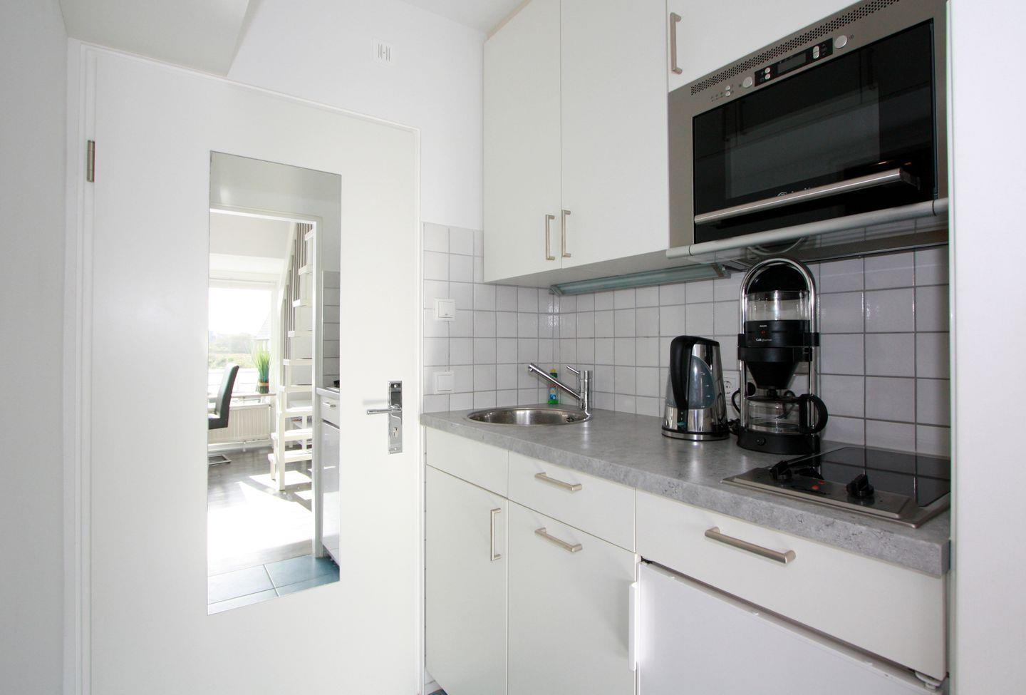 Die moderne Ausstattung des Apartments umfasst eine offene Küche, die direkt in den gemütlichen Wohnbereich integriert ist. Hier finden Sie einen Ceranherd, einen Kühlschrank mit Gefrierfach, eine Mikrowelle, eine Spülmaschine sowie alle notwendigen Küchenutensilien, Geschirr und Besteck für die Zubereitung und den Genuss von Mahlzeiten im eigenen Zuhause auf Zeit. Der Essbereich mit Esstisch bietet Platz für genussvolle Stunden, während Sie im Wohnbereich mit komfortabler Sofaecke und Sessel entspannen können.