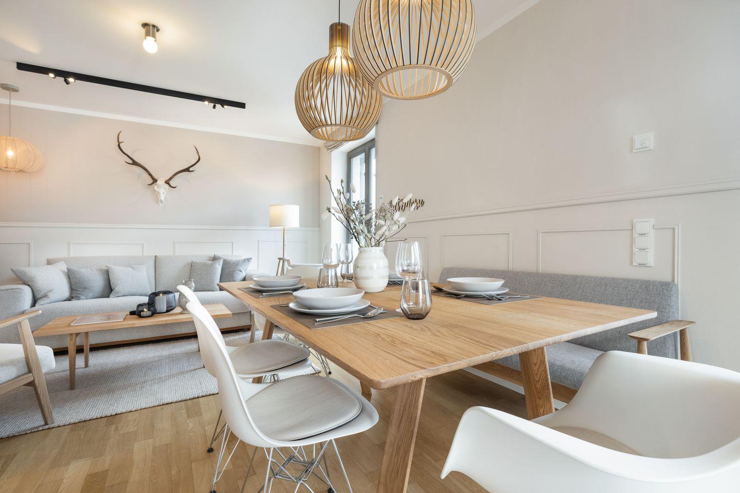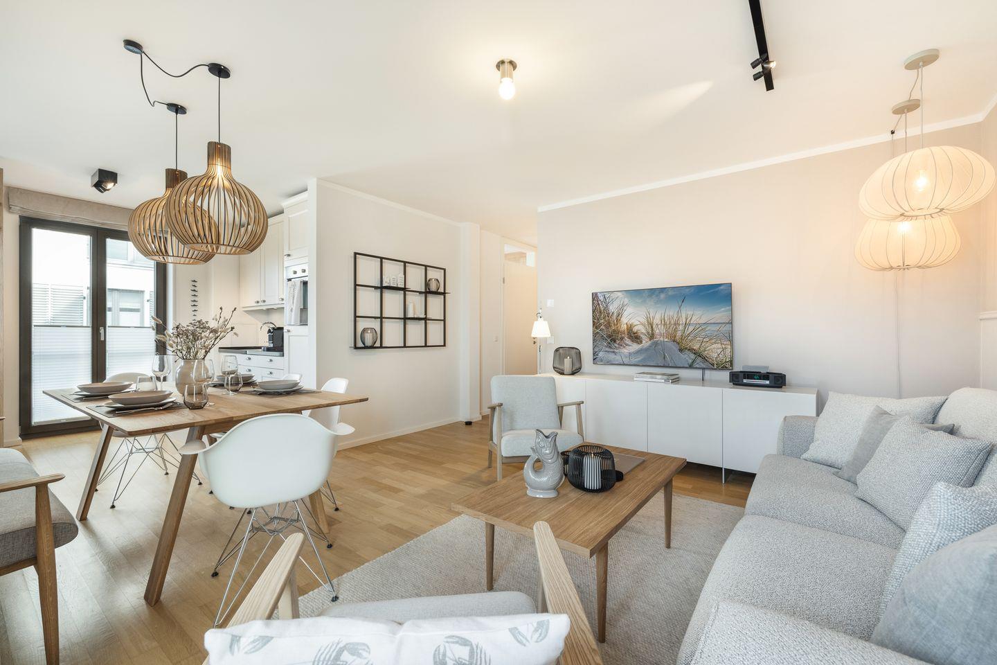 Die Wohnung erstreckt sich über 65 m² und umfasst zwei behagliche Schlafzimmer, ein modernes Wohnzimmer und ein stilvolles Badezimmer. Die offene Küche mit vollwertiger Ausstattung ist für Kochliebhaber. Hier finden Sie alles, was Sie benötigen, darunter einen Kühlschrank, Backofen, Spülmaschine, Kaffeemaschine und eine Nespresso-Espressomaschine. Genießen Sie Ihre kulinarischen Kreationen im Essbereich oder auf dem Balkon.