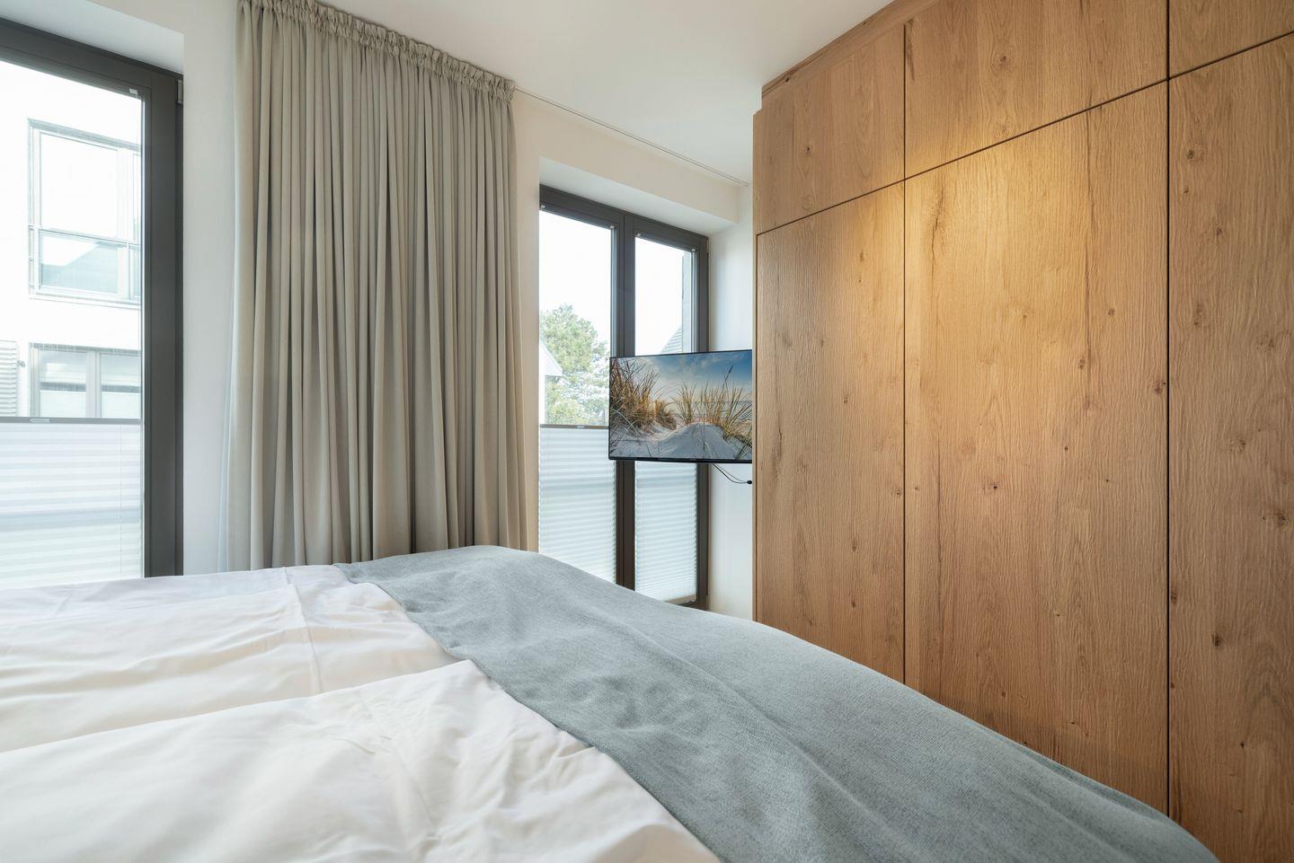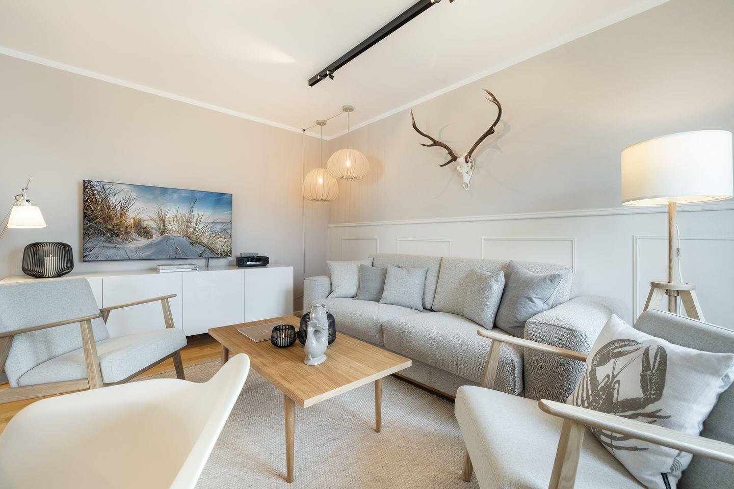 Das Wohnzimmer lädt zum Entspannen ein, ausgestattet mit einem gemütlichen Sofa und einem Fernseher, ideal für entspannte Abende nach einem aufregenden Tag am Meer.