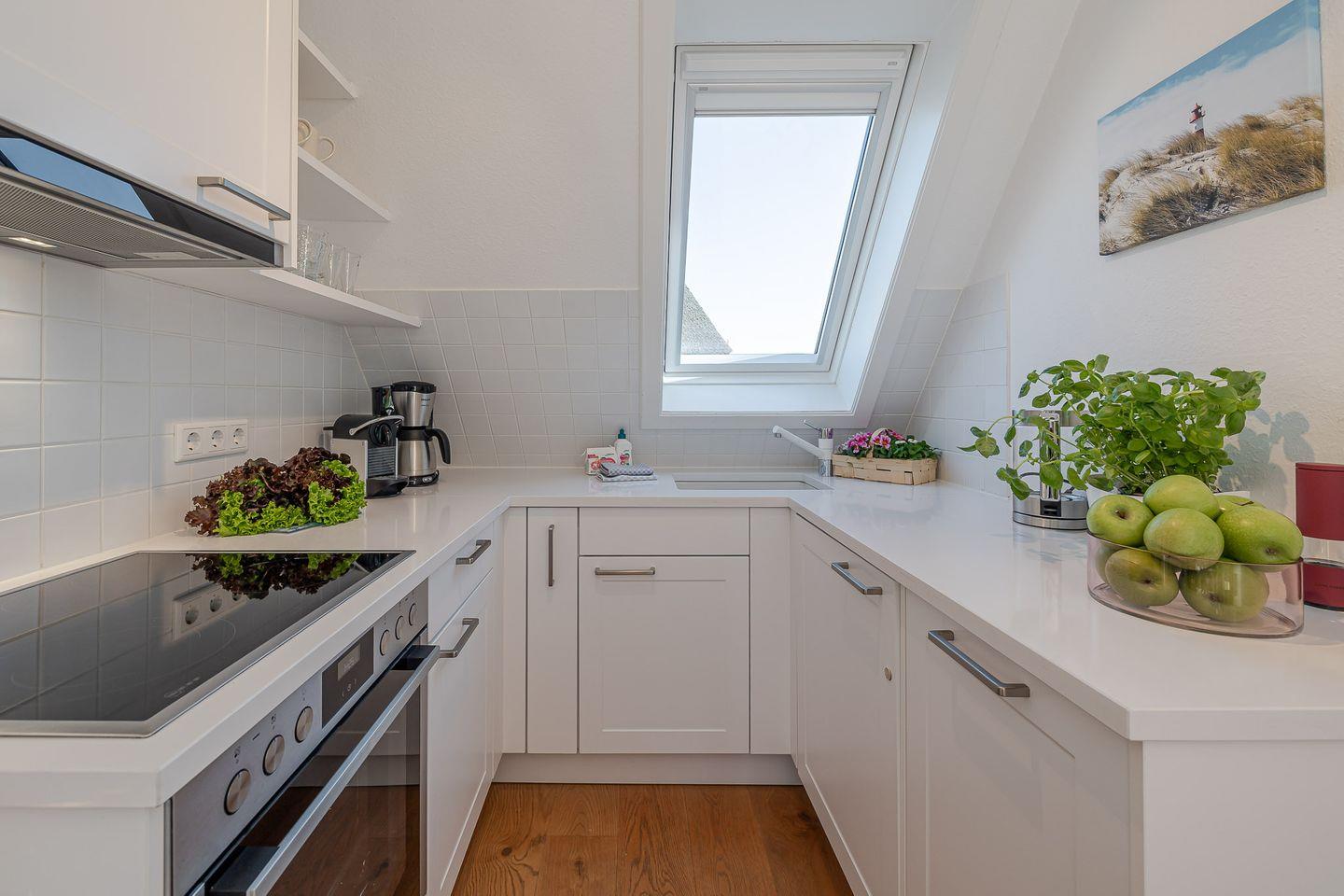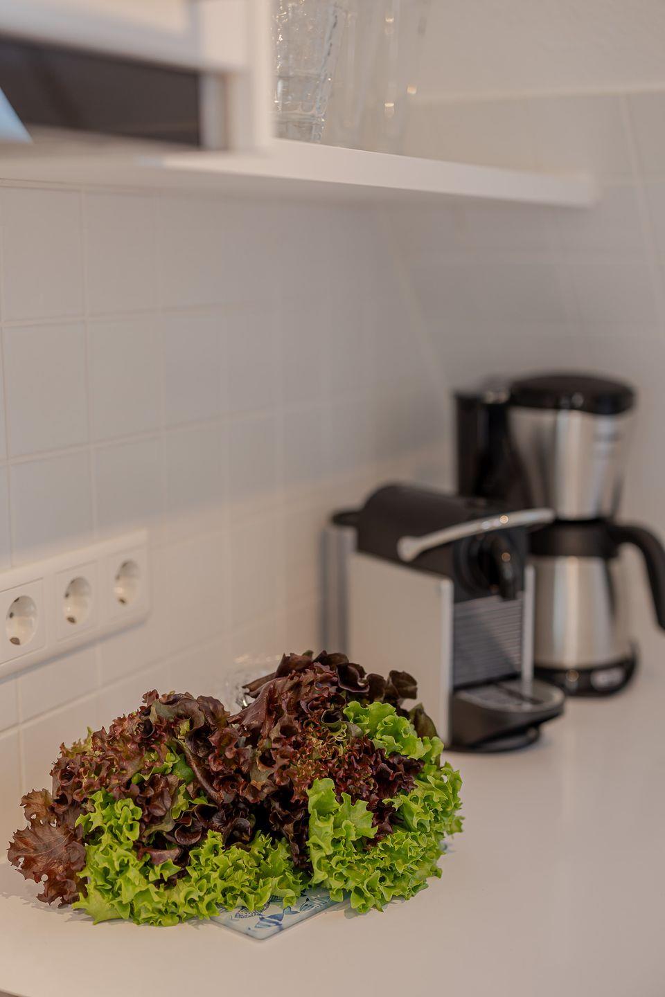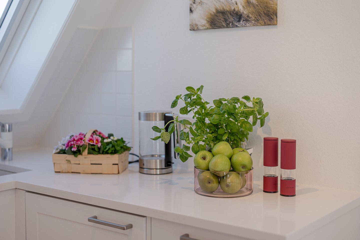 Die offene Küche fügt sich harmonisch in den Wohnbereich ein und bietet alles, was man braucht, um im Urlaub mit Leichtigkeit und Freude zu kochen. Ob ein ausgiebiges Frühstück zu zweit, ein liebevoll zubereitetes Abendessen oder ein schneller Snack nach einem Tag am Meer – hier ist alles da, was das Herz begehrt. Es macht Freude, gemeinsam den Tisch zu decken, den Duft von frischem Kaffee einzuatmen und sich Zeit zu nehmen – für Genuss, Gespräche und kleine Urlaubsrituale.