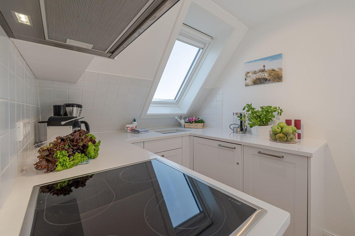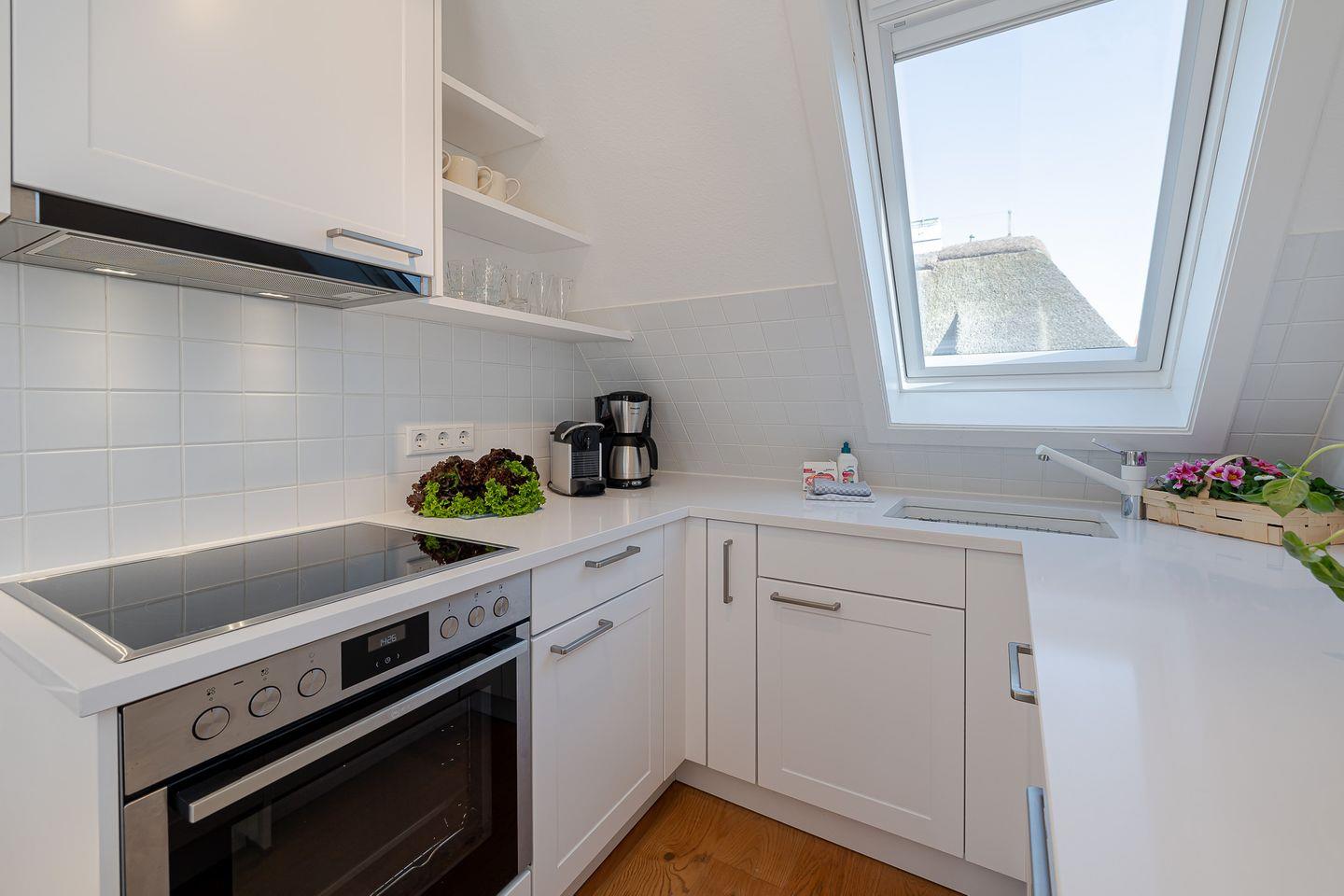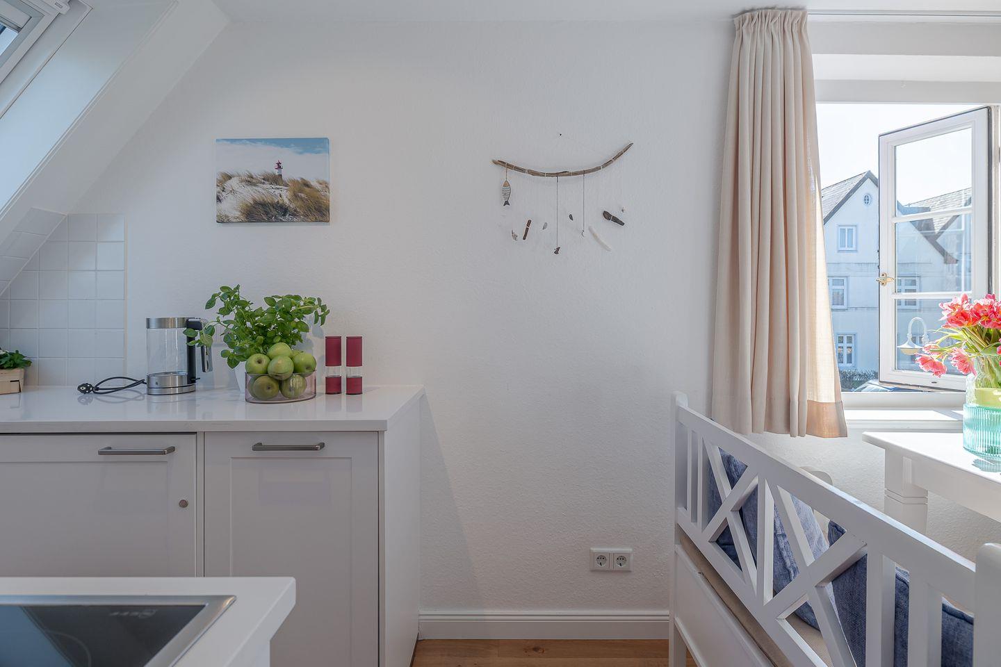 Die offene Küche fügt sich harmonisch in den Wohnbereich ein und bietet alles, was man braucht, um im Urlaub mit Leichtigkeit und Freude zu kochen. Ob ein ausgiebiges Frühstück zu zweit, ein liebevoll zubereitetes Abendessen oder ein schneller Snack nach einem Tag am Meer – hier ist alles da, was das Herz begehrt. Es macht Freude, gemeinsam den Tisch zu decken, den Duft von frischem Kaffee einzuatmen und sich Zeit zu nehmen – für Genuss, Gespräche und kleine Urlaubsrituale.