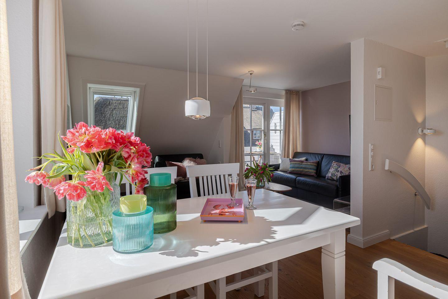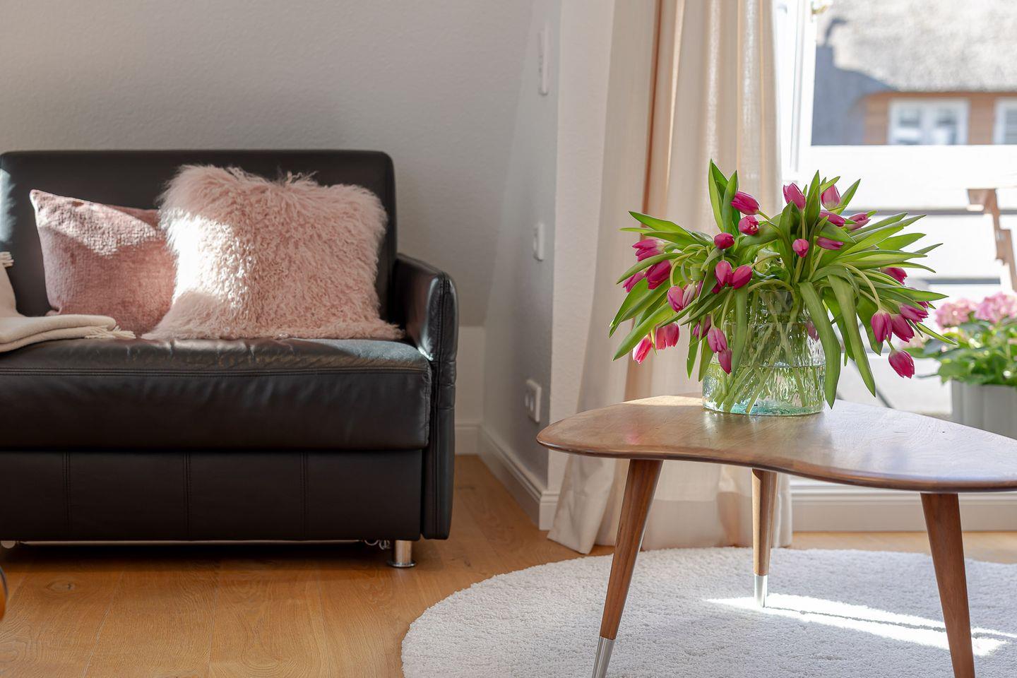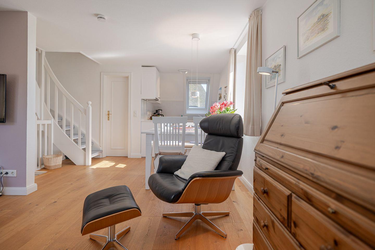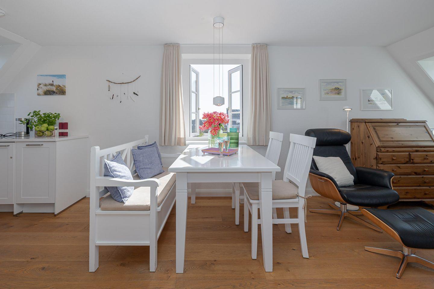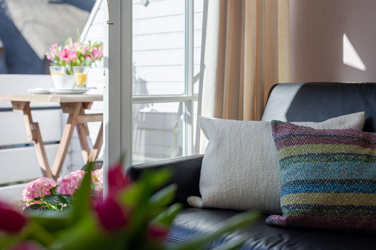 Der angrenzende Essbereich ist hell und freundlich – ideal für lange Frühstücke, gesellige Abendessen oder ein Glas Wein bei Kerzenschein. Im Wohnzimmer lädt ein großes, weiches Sofa dazu ein, die Seele baumeln zu lassen – sei es mit einem guten Buch, bei einem entspannten Filmabend oder einfach in netter Runde. Durch das geöffnete Fenster strömt die frische Nordseeluft herein, und auf dem geschützten Balkon lässt sich der Tag wunderbar bei einer Tasse Tee oder einem Glas Wein ausklingen. Liebevolle Details, harmonische Farben und eine warme Atmosphäre machen es leicht, sich sofort willkommen und geborgen zu fühlen.