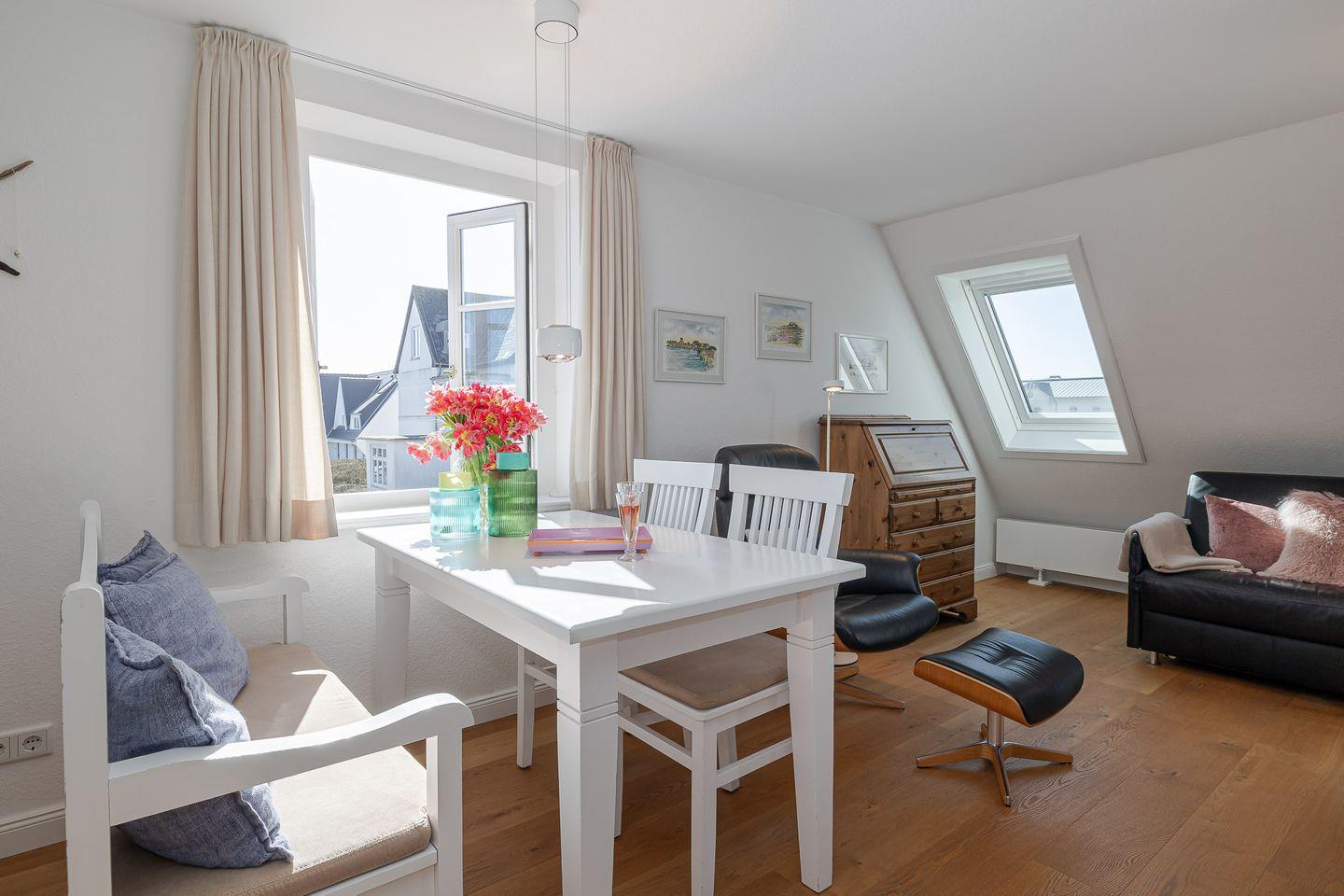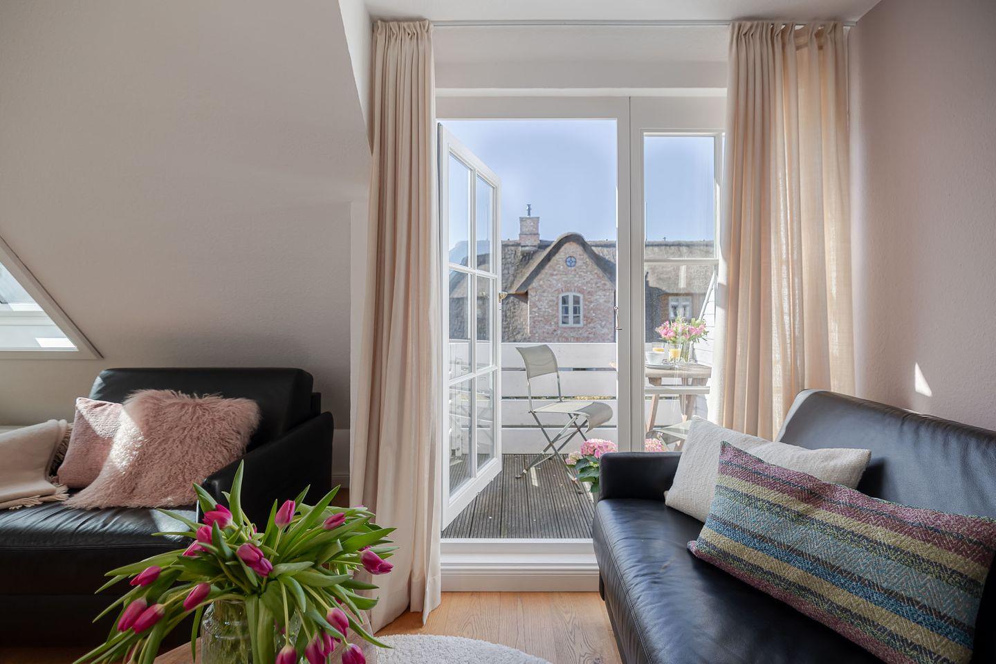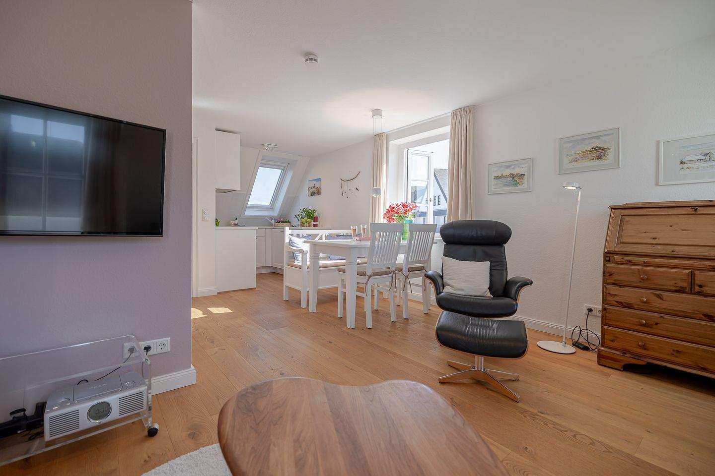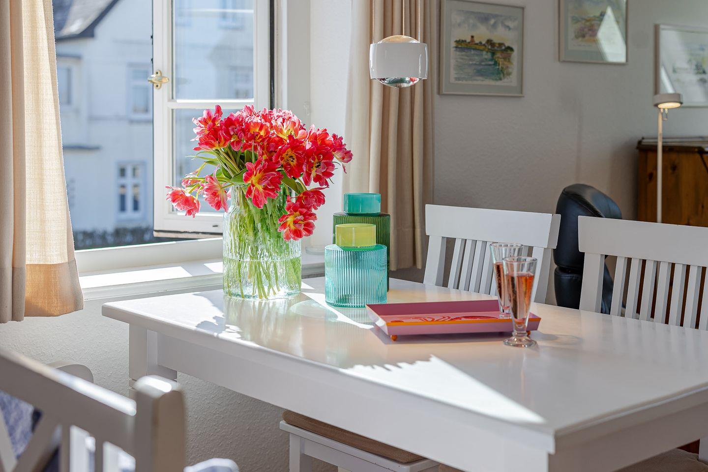 Der angrenzende Essbereich ist hell und freundlich – ideal für lange Frühstücke, gesellige Abendessen oder ein Glas Wein bei Kerzenschein. Im Wohnzimmer lädt ein großes, weiches Sofa dazu ein, die Seele baumeln zu lassen – sei es mit einem guten Buch, bei einem entspannten Filmabend oder einfach in netter Runde. Durch das geöffnete Fenster strömt die frische Nordseeluft herein, und auf dem geschützten Balkon lässt sich der Tag wunderbar bei einer Tasse Tee oder einem Glas Wein ausklingen. Liebevolle Details, harmonische Farben und eine warme Atmosphäre machen es leicht, sich sofort willkommen und geborgen zu fühlen.