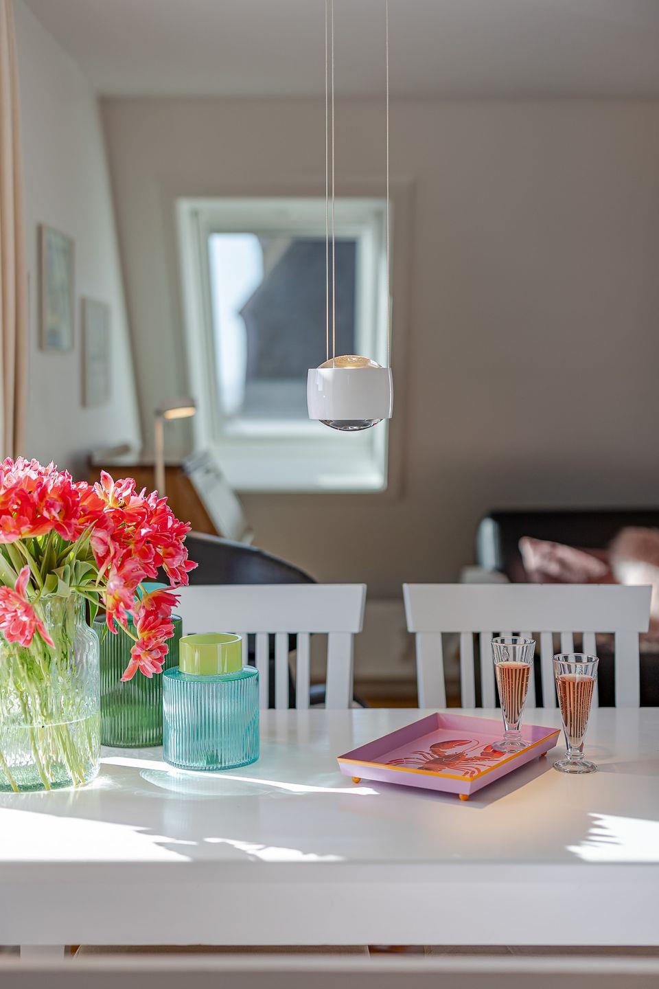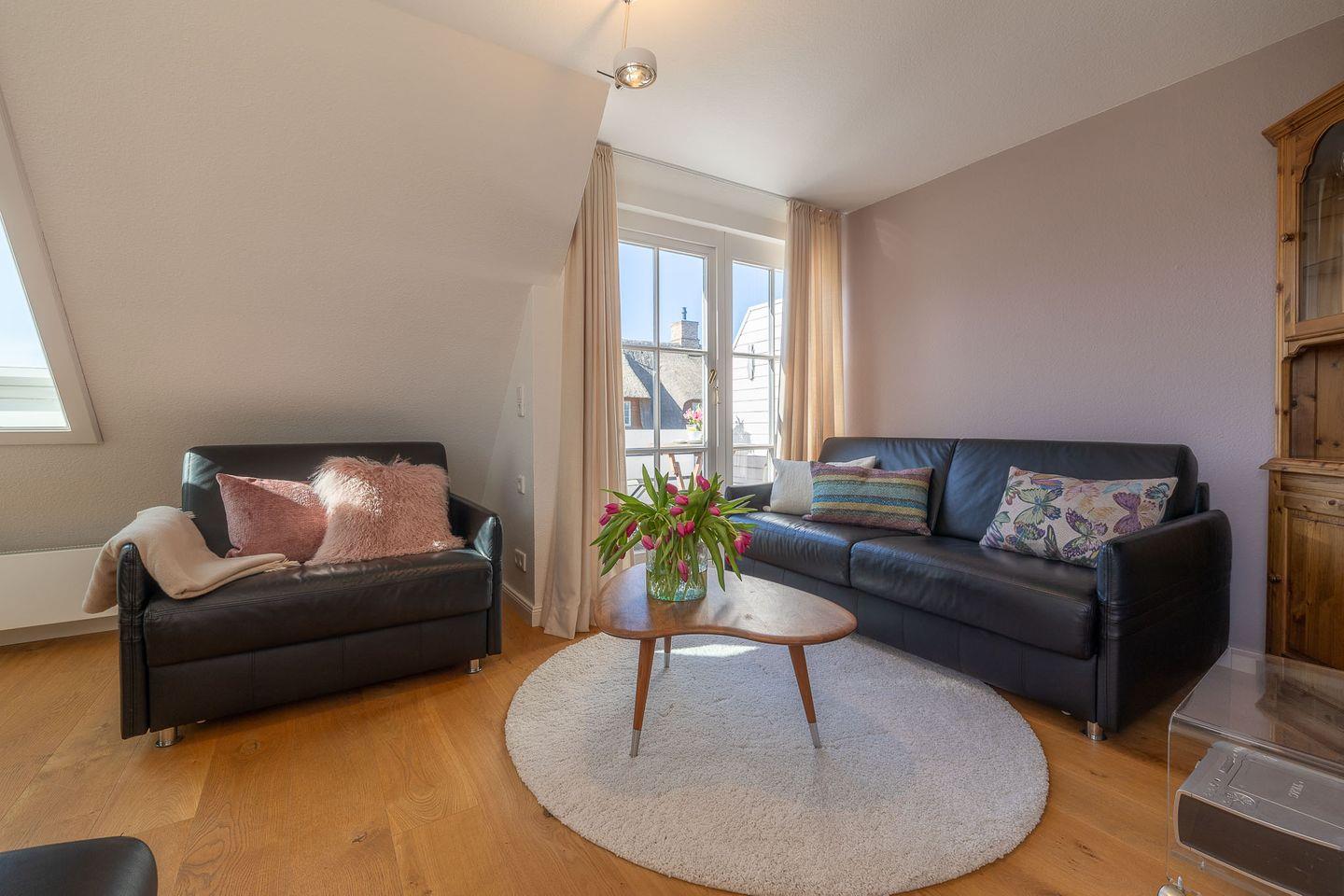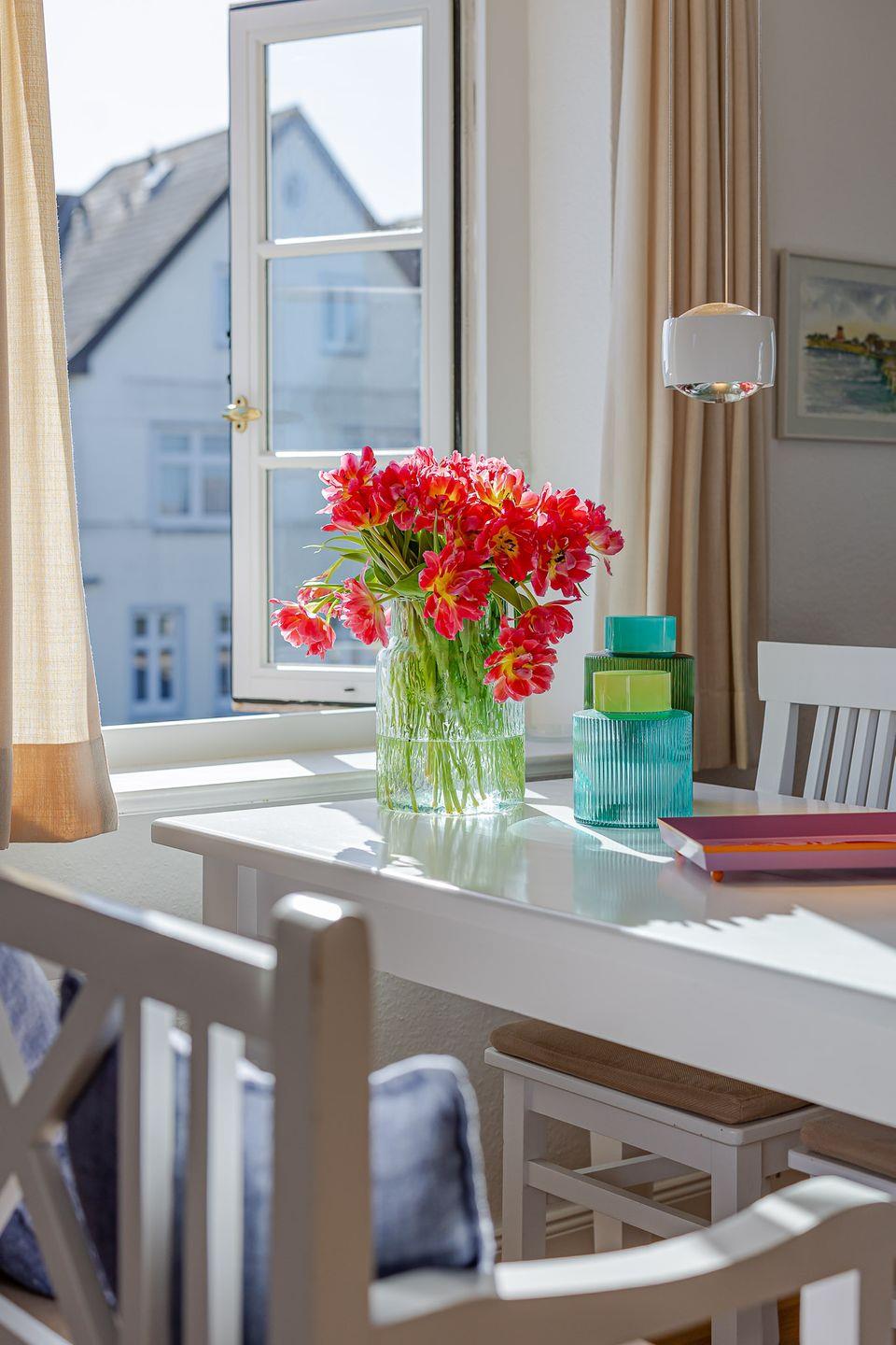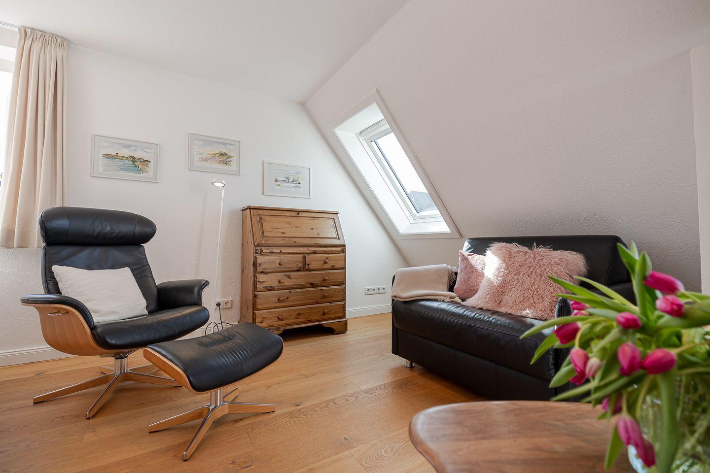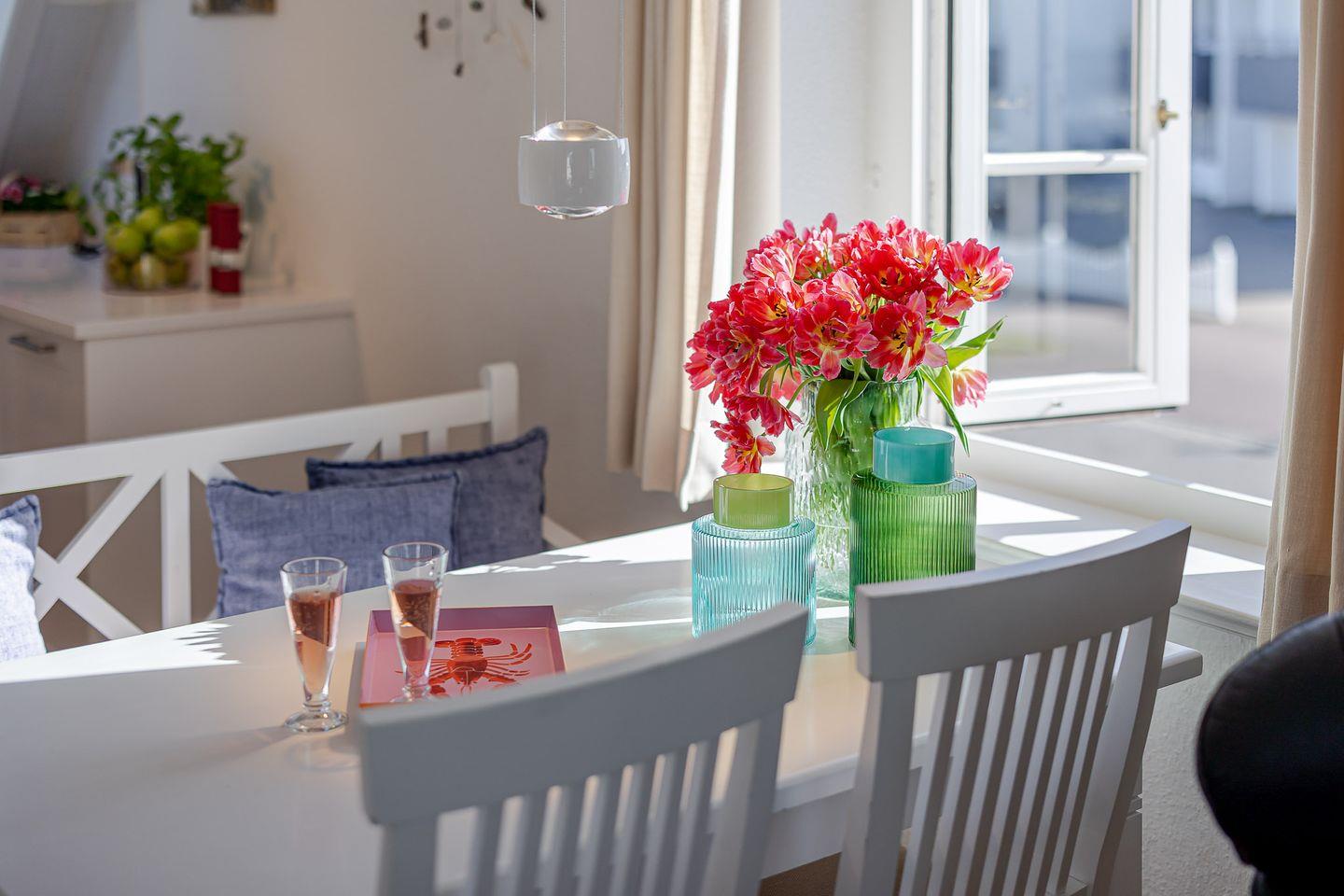 Der angrenzende Essbereich ist hell und freundlich – ideal für lange Frühstücke, gesellige Abendessen oder ein Glas Wein bei Kerzenschein. Im Wohnzimmer lädt ein großes, weiches Sofa dazu ein, die Seele baumeln zu lassen – sei es mit einem guten Buch, bei einem entspannten Filmabend oder einfach in netter Runde. Durch das geöffnete Fenster strömt die frische Nordseeluft herein, und auf dem geschützten Balkon lässt sich der Tag wunderbar bei einer Tasse Tee oder einem Glas Wein ausklingen. Liebevolle Details, harmonische Farben und eine warme Atmosphäre machen es leicht, sich sofort willkommen und geborgen zu fühlen.