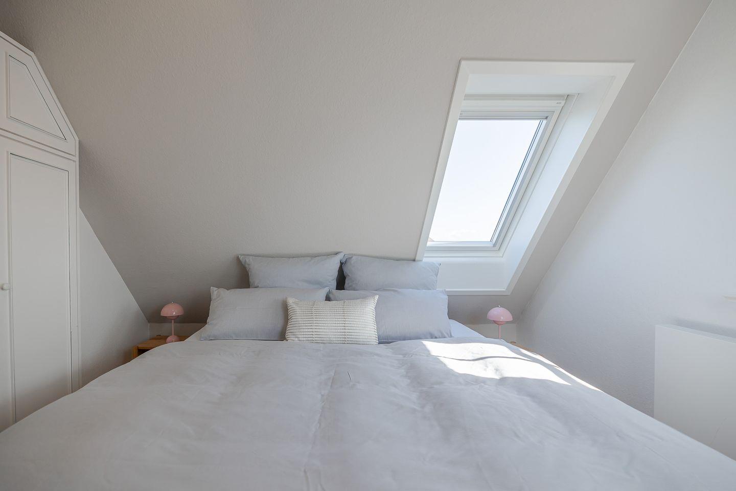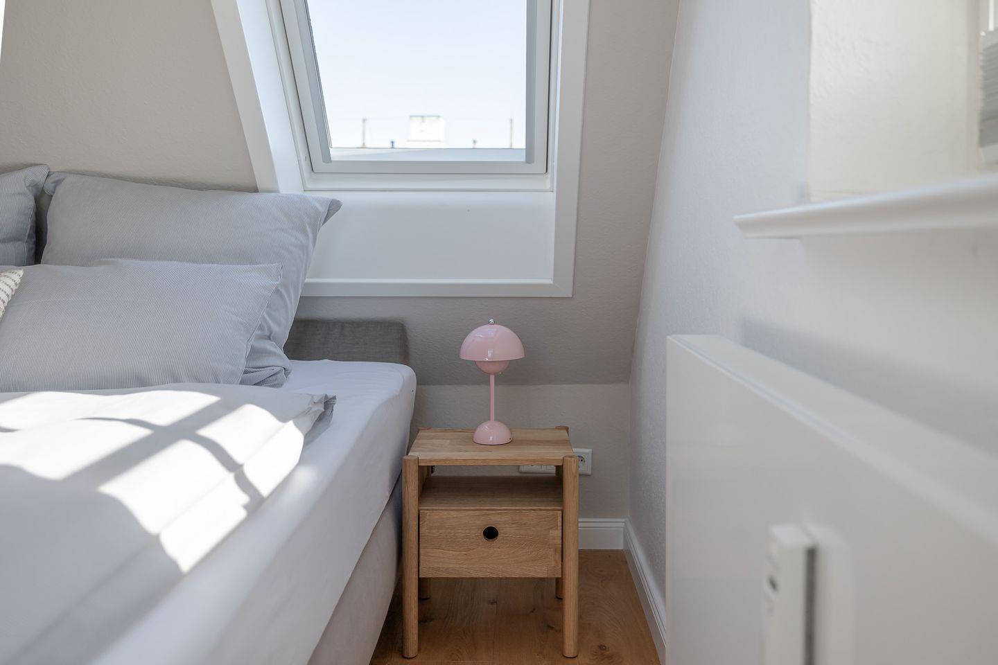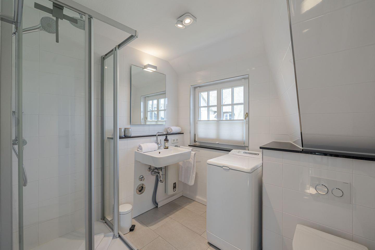 Das Schlafzimmer ist gemütlich und mit viel Gefühl eingerichtet – ein ruhiger Rückzugsort mit komfortablem Doppelbett und warmem Parkettboden, in dem man sich sofort wohlfühlt. Das helle Bad bietet eine moderne Dusche und lädt dazu ein, nach einem langen Strandtag erfrischt und entspannt in den Abend zu starten. Eine Waschmaschine mit Trocknerfunktion steht Ihnen zur eigenen Nutzung zur Verfügung – ein kleines Extra, das den Aufenthalt noch angenehmer macht.