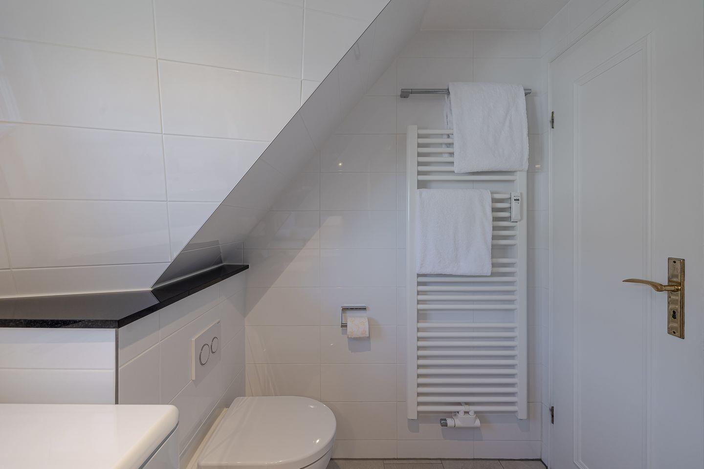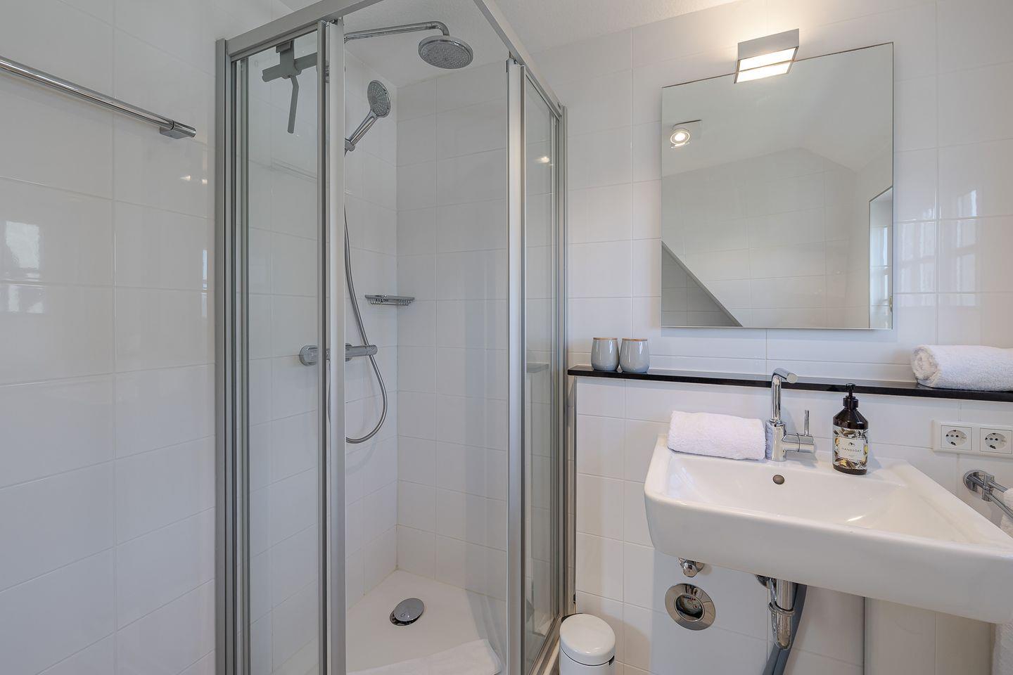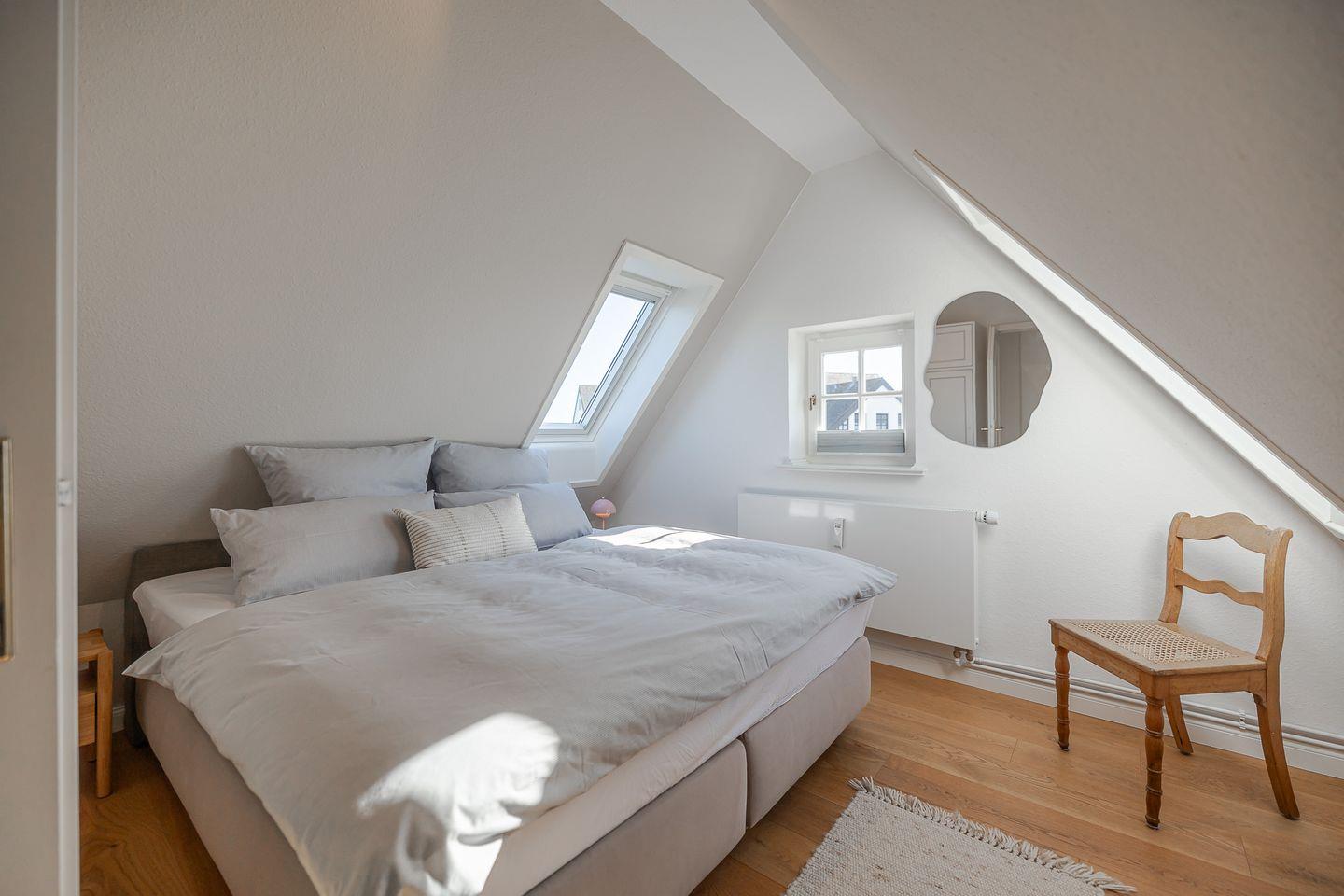 Das Schlafzimmer ist gemütlich und mit viel Gefühl eingerichtet – ein ruhiger Rückzugsort mit komfortablem Doppelbett und warmem Parkettboden, in dem man sich sofort wohlfühlt. Das helle Bad bietet eine moderne Dusche und lädt dazu ein, nach einem langen Strandtag erfrischt und entspannt in den Abend zu starten. Eine Waschmaschine mit Trocknerfunktion steht Ihnen zur eigenen Nutzung zur Verfügung – ein kleines Extra, das den Aufenthalt noch angenehmer macht.