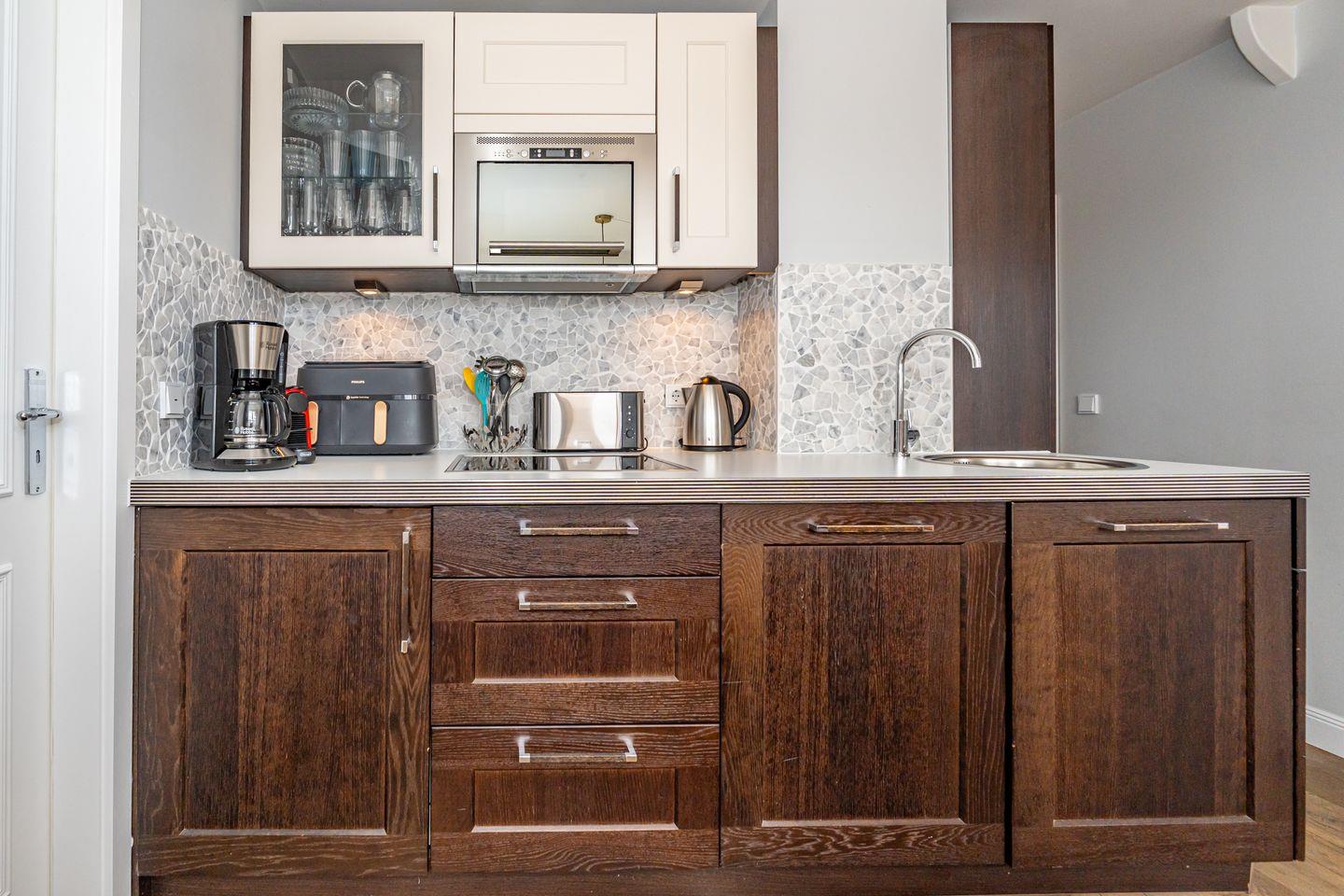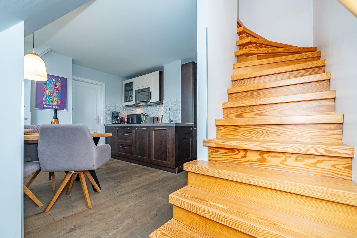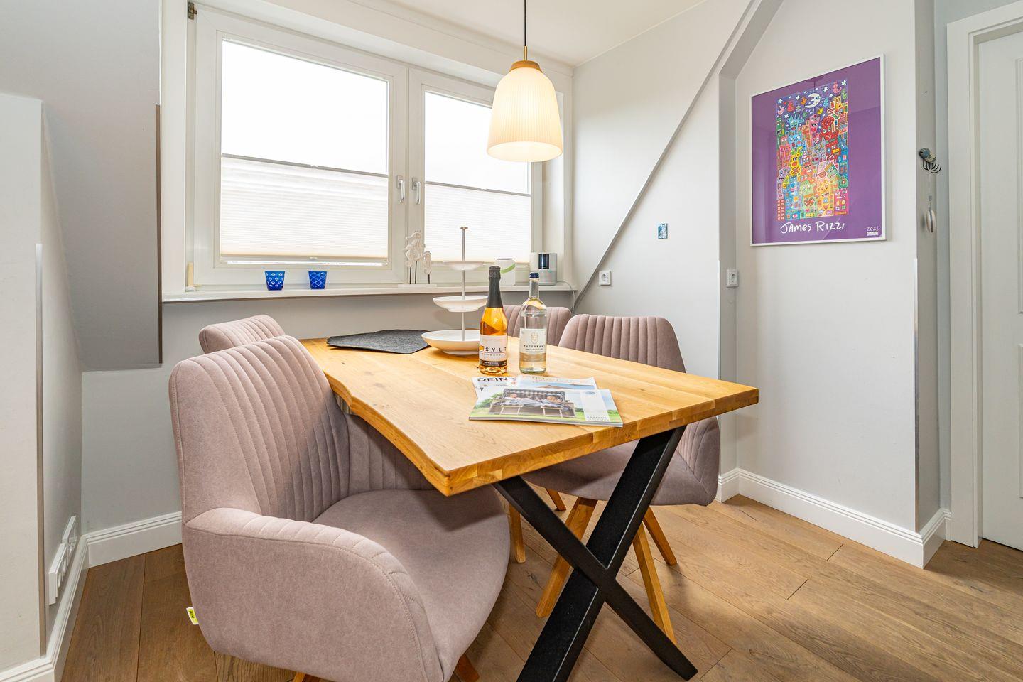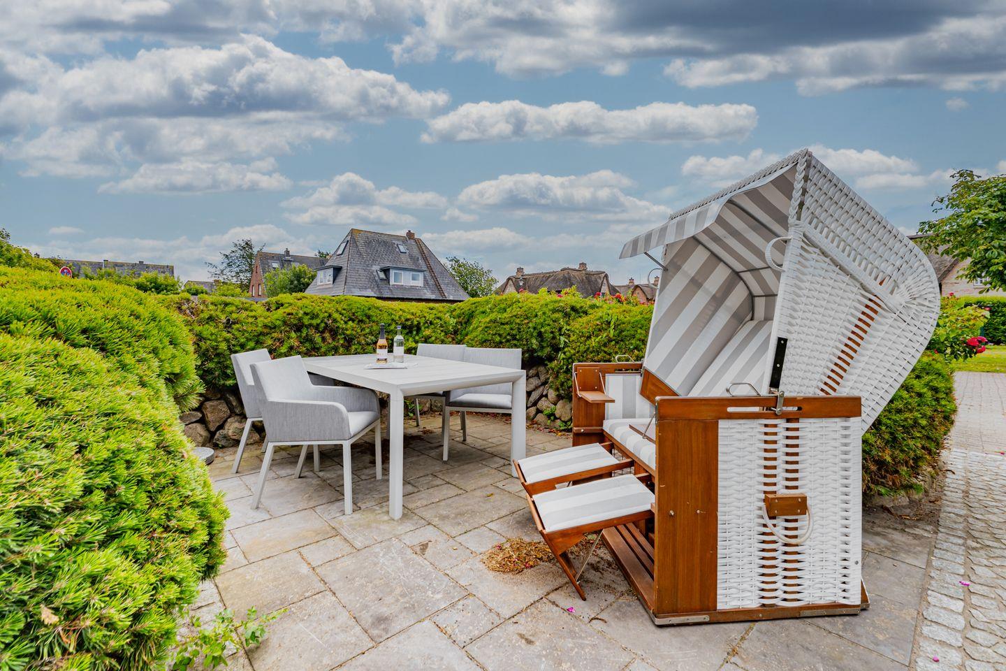 Die großzügige Küche ist vollständig eingerichtet und ermöglicht Ihnen eine flexible Selbstversorgung während Ihres Urlaubs. Ob ein Frühstück im Kreise der Familie oder ein gemeinsames Abendessen – hier genießen Sie kulinarische Momente ganz nach Ihren Wünschen. In Ihrer eigenen Sonnenkuhle mit Strandkorb können Sie den Tag an der frischen Nordseeluft mit einem Glas Wein ausklingen lassen.