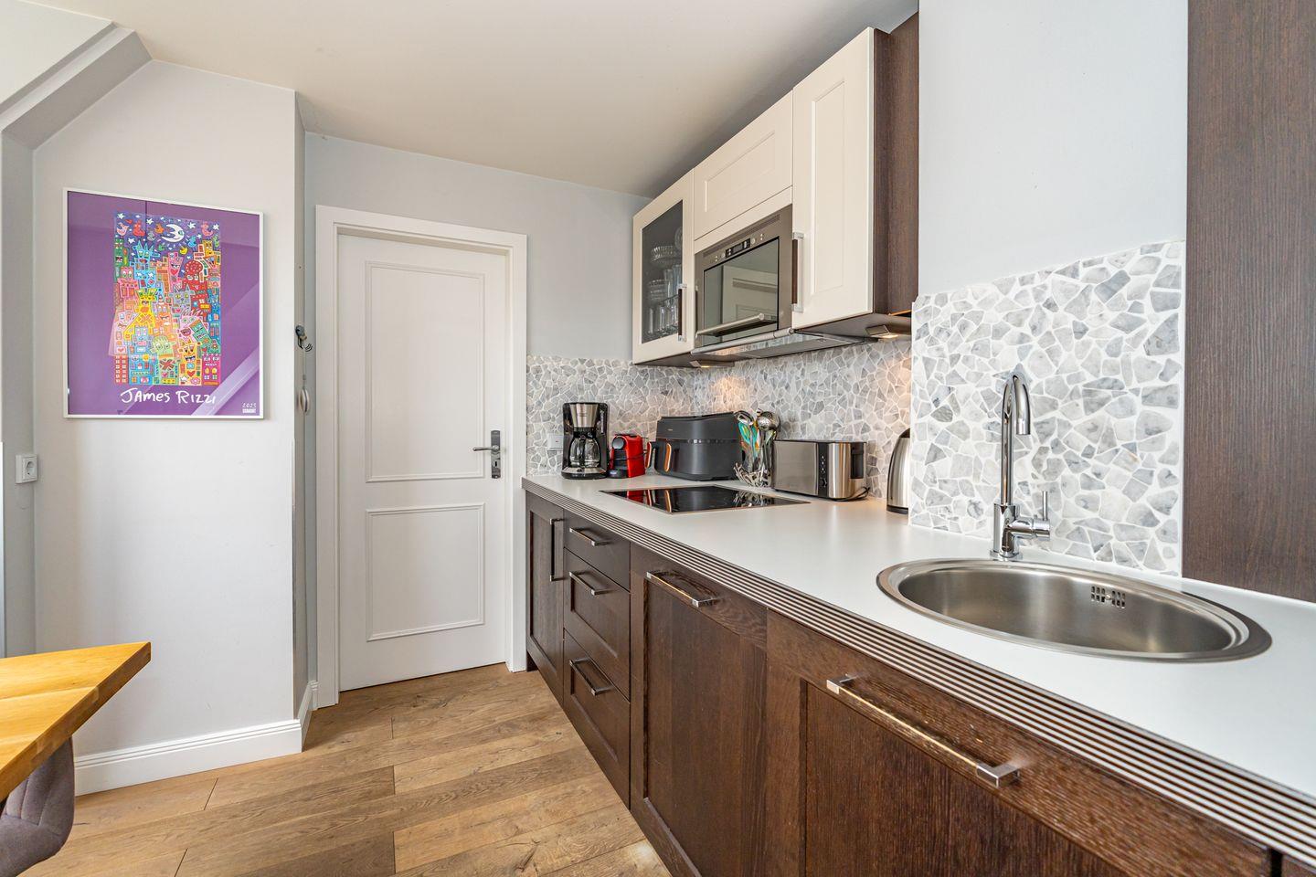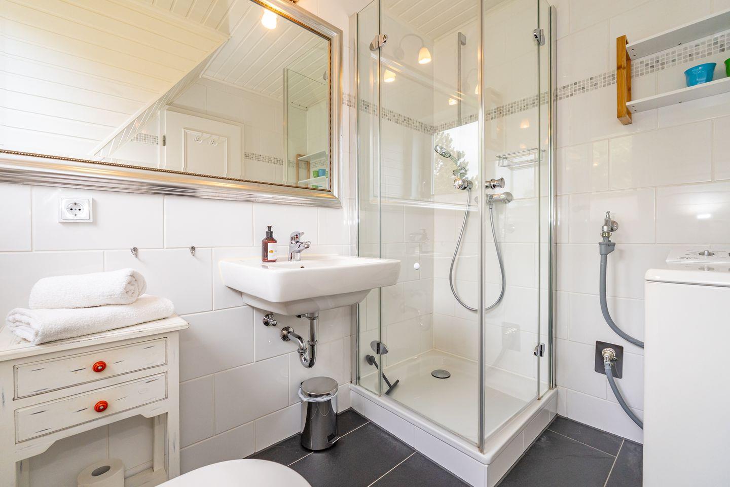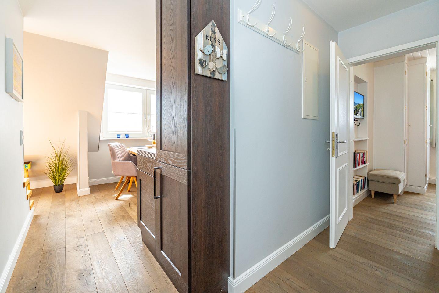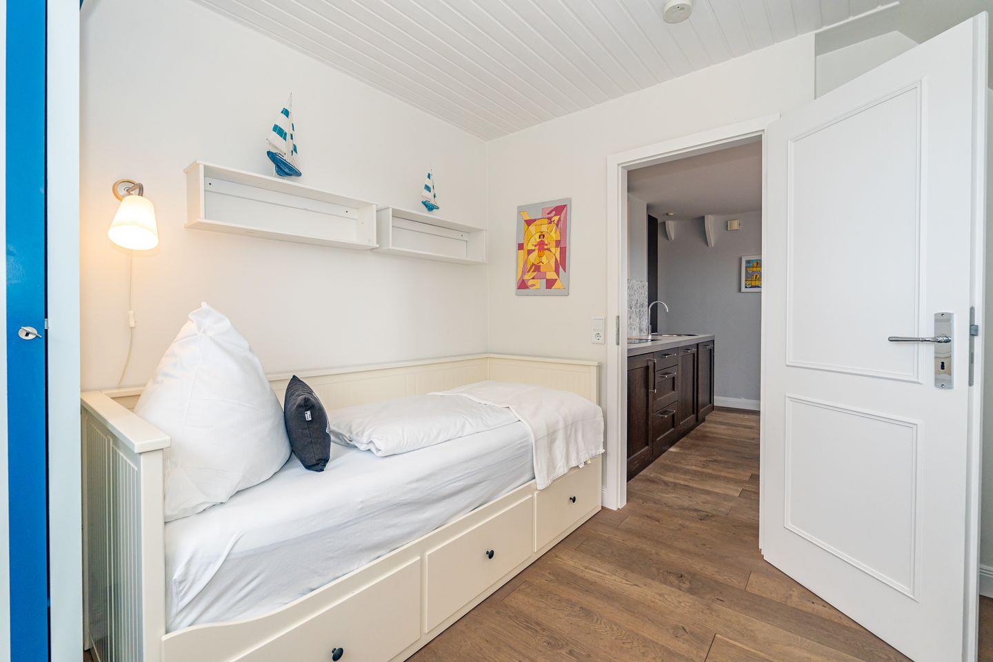 Die großzügige Küche ist vollständig eingerichtet und ermöglicht Ihnen eine flexible Selbstversorgung während Ihres Urlaubs. Ob ein Frühstück im Kreise der Familie oder ein gemeinsames Abendessen – hier genießen Sie kulinarische Momente ganz nach Ihren Wünschen. In Ihrer eigenen Sonnenkuhle mit Strandkorb können Sie den Tag an der frischen Nordseeluft mit einem Glas Wein ausklingen lassen.