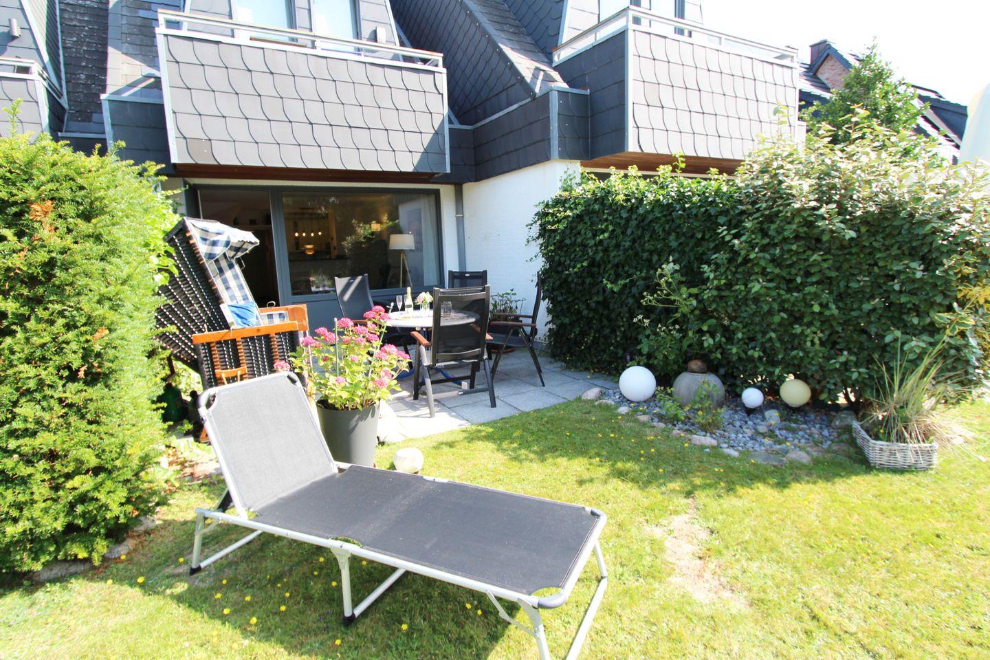 Die idyllische Terrasse mit Südausrichtung bietet den optimalen Erholungsfaktor. Entspannen Sie auf den bequemen Gartenmöbeln in der Sylter Sonne. Der Strandkorb steht Ihnen von April bis Oktober zur Verfügung.