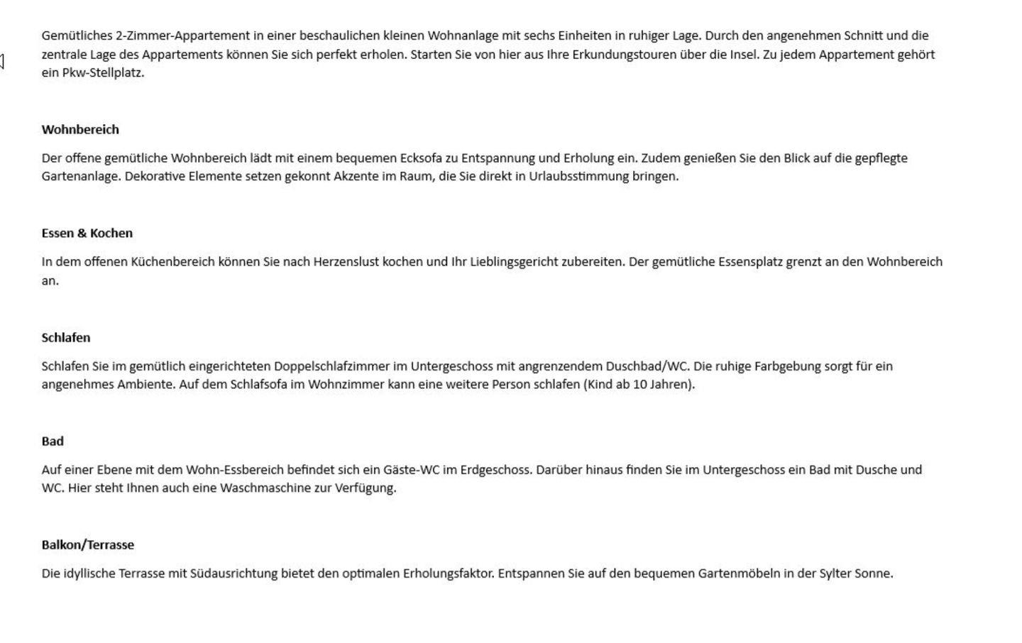Gemütliches 2-Zimmer-Appartement in einer beschaulichen kleinen Wohnanlage mit sechs Einheiten in ruhiger Lage. Durch den angenehmen Schnitt und die zentrale Lage des Appartements können Sie sich perfekt erholen. Starten Sie von hier aus Ihre Erkundungstouren über die Insel. Zu jedem Appartement gehört ein Pkw-Stellplatz.
