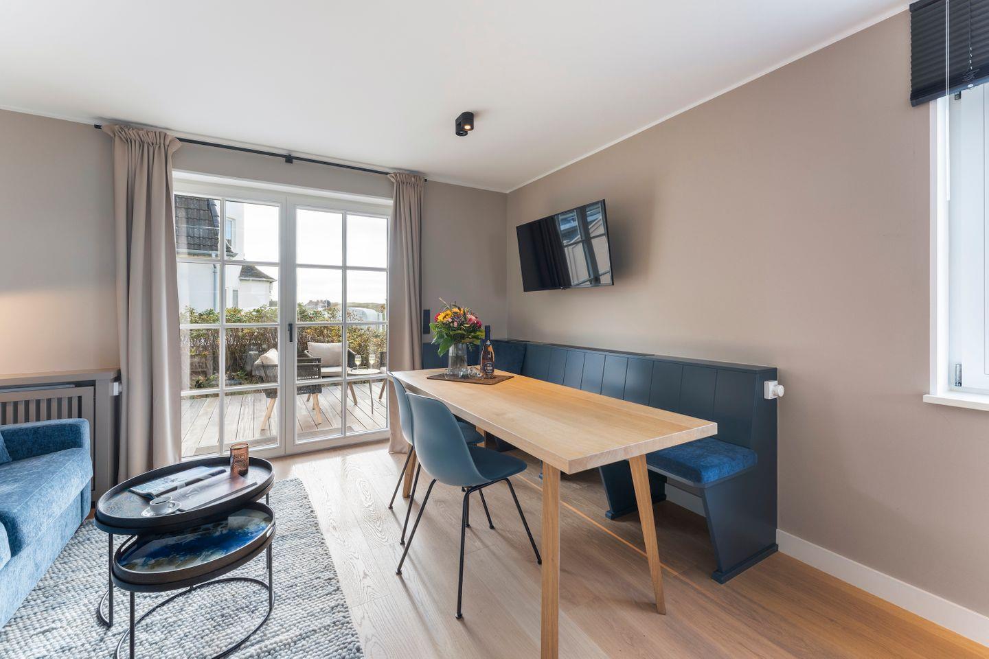 Die nach Süden ausgerichtete, möblierte Terrasse bietet einen wunderbaren Blick auf die Dünen. Genießen Sie hier einen frisch gebrühten Kaffee am Morgen oder ein Glas Wein in der Abendsonne – begleitet vom Rauschen der Nordsee in der Ferne.