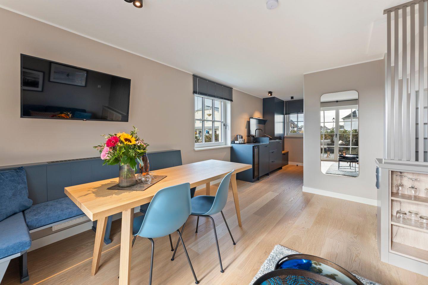Die offene Pantry-Küche ist perfekt ausgestattet, um ein schnelles Frühstück oder einen kleinen Snack zuzubereiten: mit Induktionskochfeld, Weinkühlschrank, Geschirrspüler, Kühlschrank mit Gefrierfach und einer Nespresso-Maschine. Der angrenzende Essbereich ist wie gemacht für entspannte Mahlzeiten in geselliger Runde.