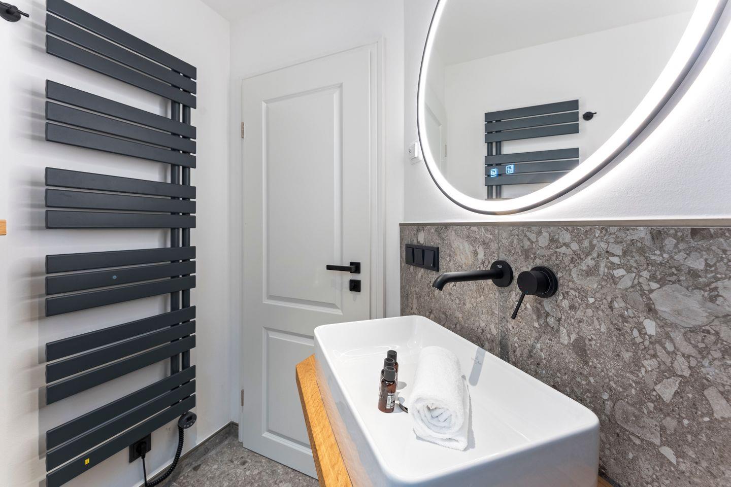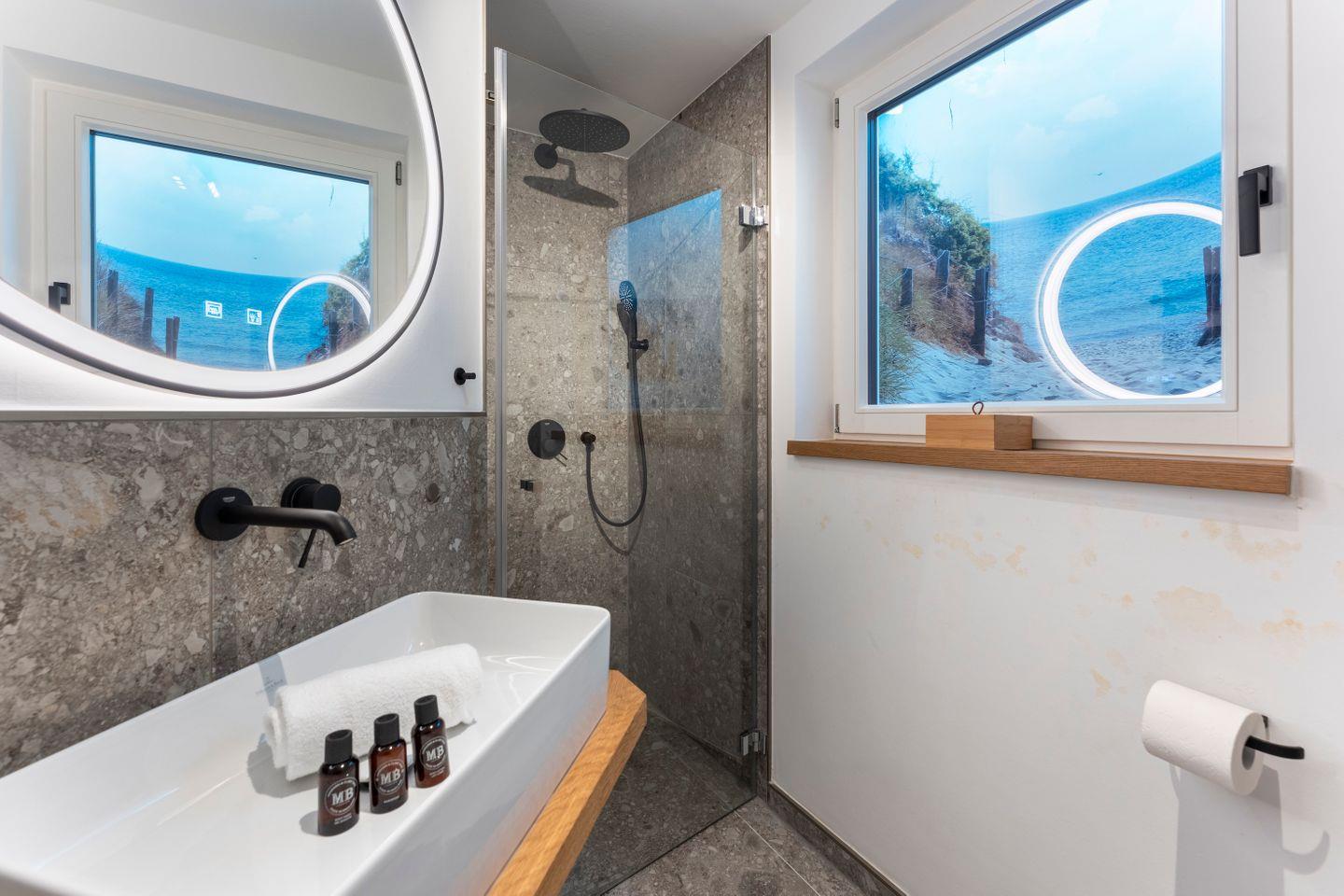 Das großzügige Badezimmer mit moderner Dusche rundet das Komfortangebot ab und sorgt für frische Momente nach einem langen Strandtag.