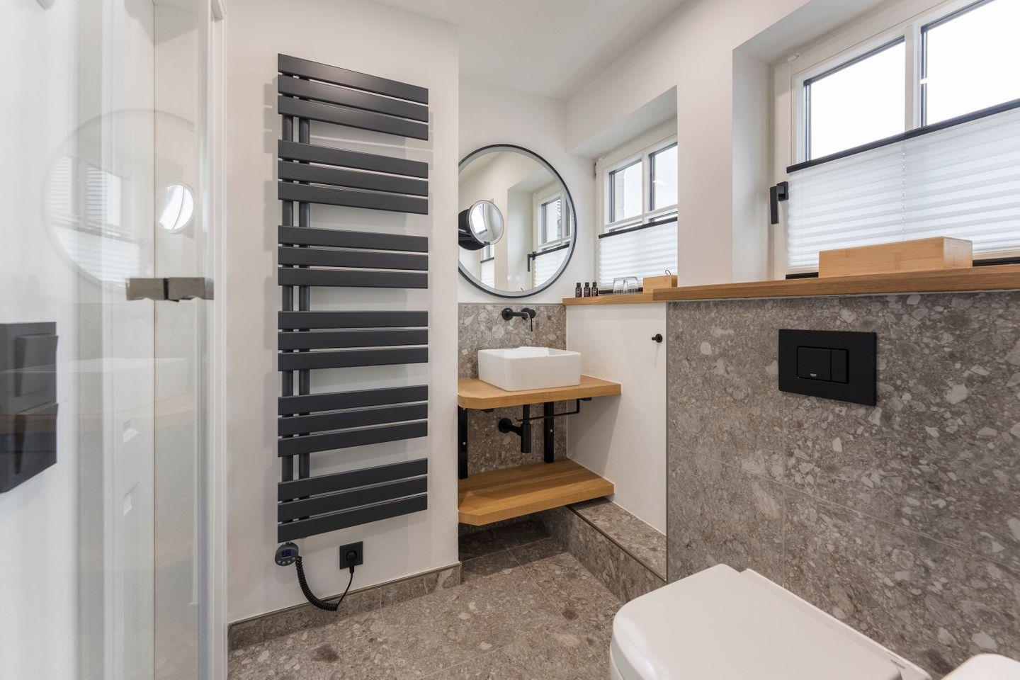 Das geräumige Badezimmer mit Dusche bietet Ihnen alles, was Sie für einen angenehmen Start in den Tag oder entspannte Momente am Abend benötigen.