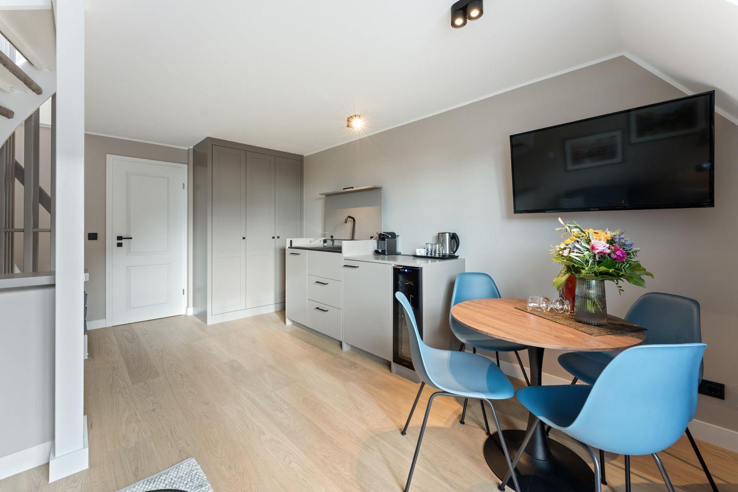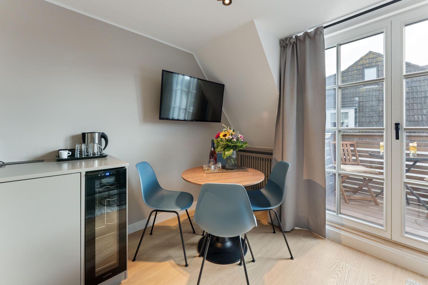 Im offen gestalteten Wohnbereich erwartet Sie eine entspannte Atmosphäre mit bequemer Schlafcouch (140x200 cm) und Flat-TV. Die harmonisch integrierte Pantry-Küche ist perfekt für kleine Mahlzeiten oder ein ausgiebiges Frühstück. Ausgestattet mit Induktionskochfeld, Weinkühlschrank, Geschirrspüler, Kühlschrank mit Gefrierfach und Nespresso-Maschine lässt sie keine Wünsche offen.