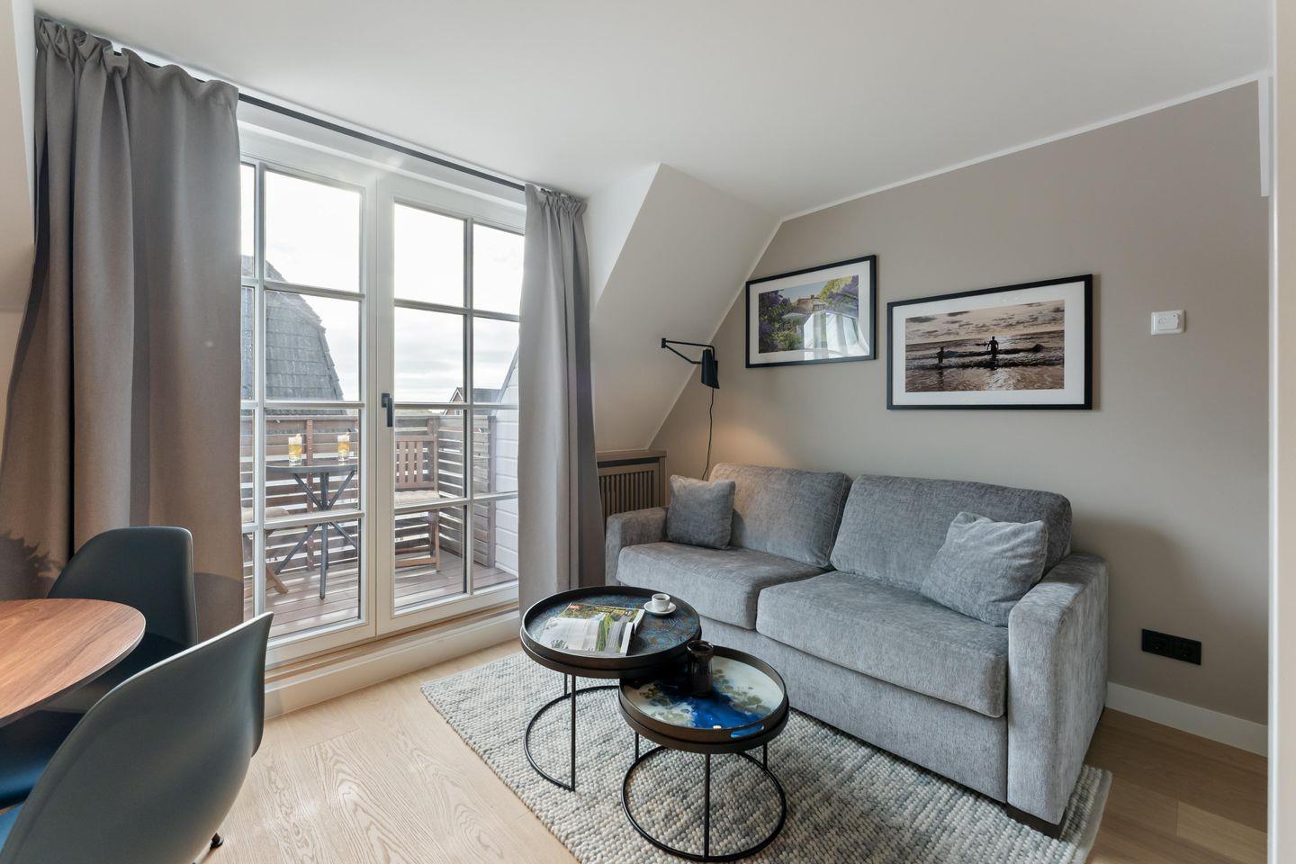 Diese charmante Ferienwohnung auf zwei Ebenen ist der ideale Rückzugsort für Paare oder Alleinreisende, die Sylt in vollen Zügen genießen möchten. Mit stilvollem, urbanem Design und durchdachter Ausstattung bietet sie auf ca. 46 qm alles, was das Urlaubsherz begehrt – inklusive Balkon mit seitlichem Meerblick und fußläufiger Nähe zum Strand.