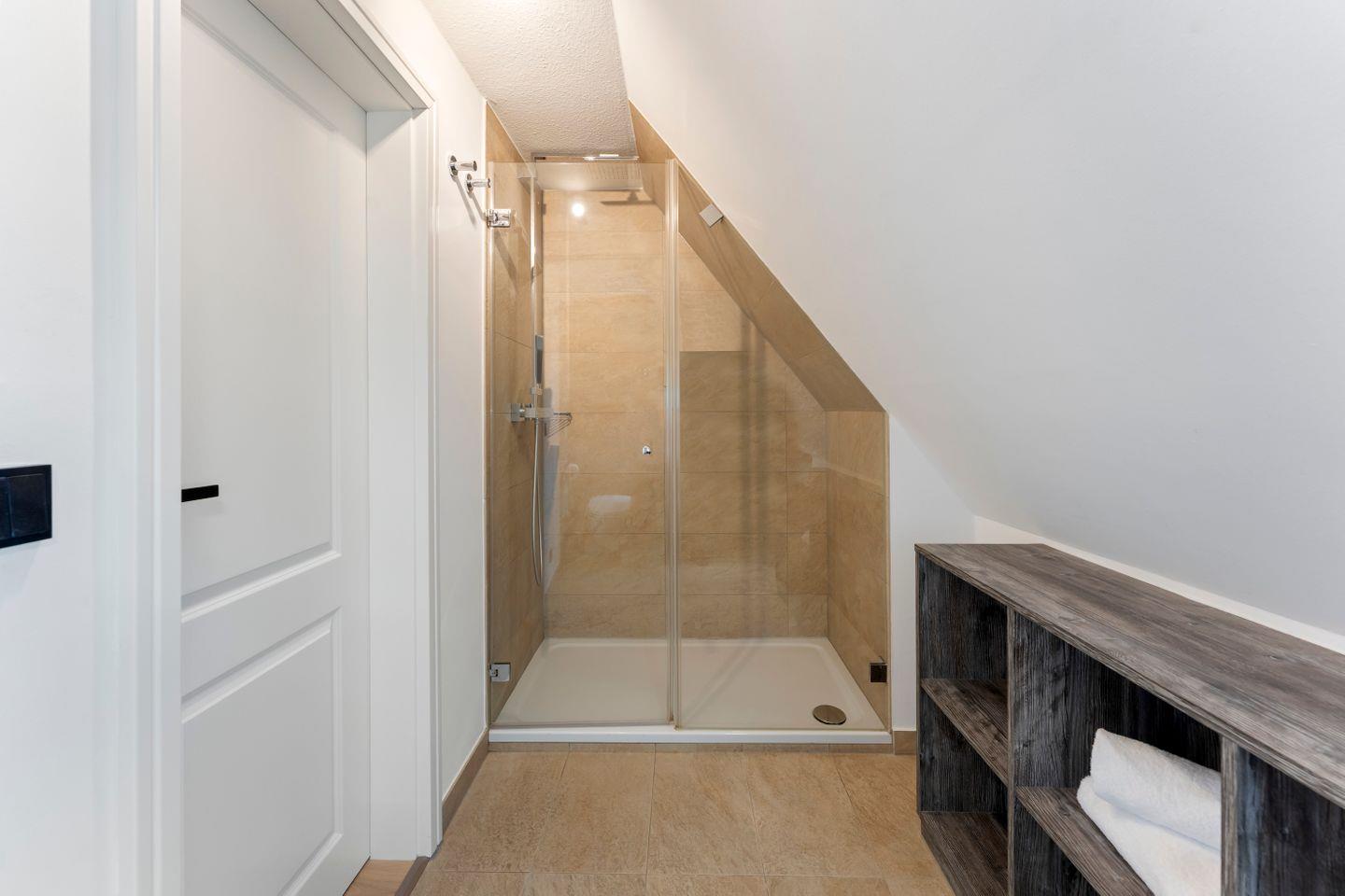 Das geräumige Badezimmer überzeugt mit einer modernen Dusche und viel Platz – ideal, um sich nach einem Strandtag aufzufrischen oder den Tag ganz entspannt zu beginnen.