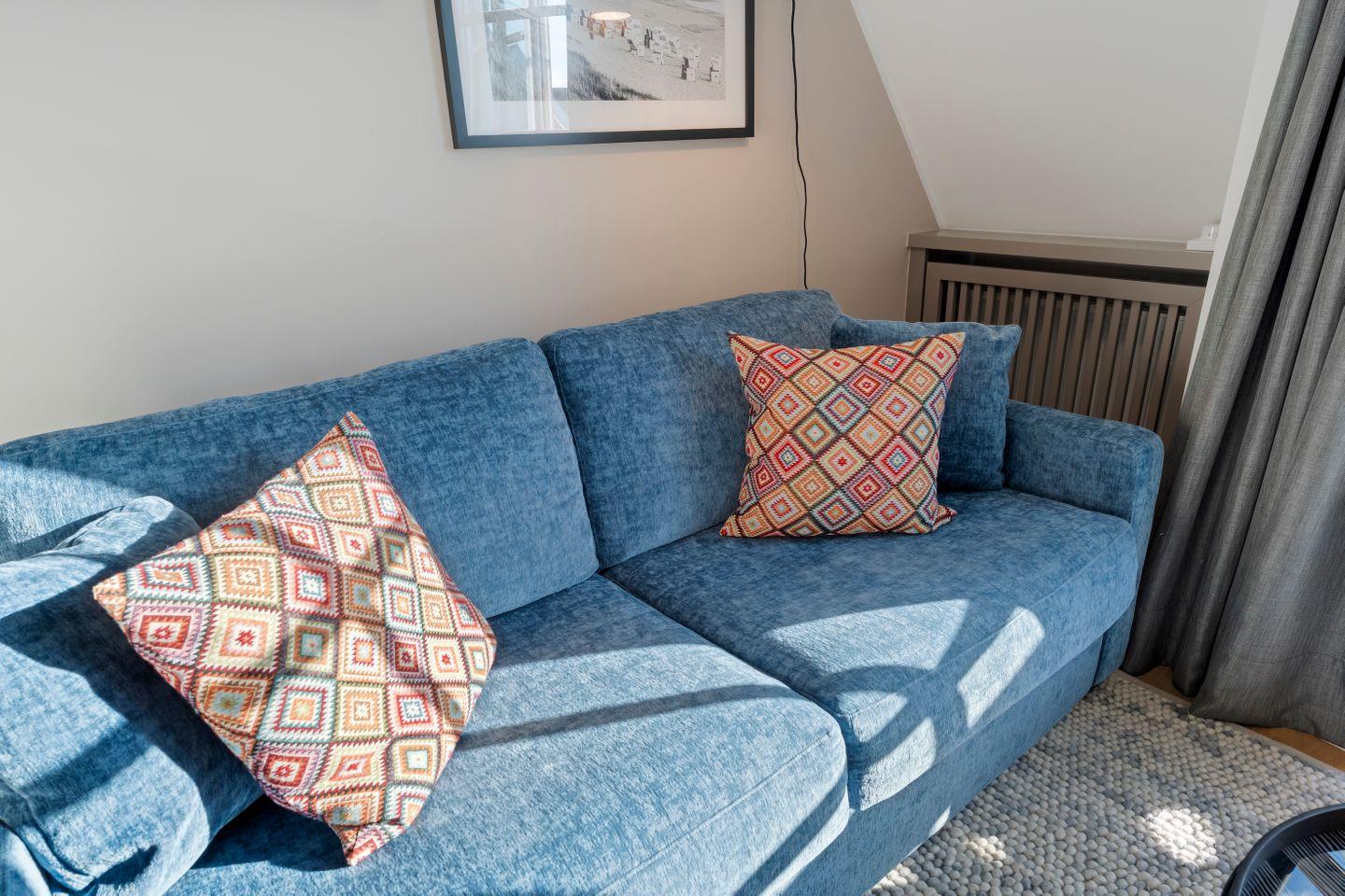 Im Wohnbereich empfängt Sie ein gemütliches Sofa, das sich bei Bedarf zur Schlafcouch (140x200 cm) verwandeln lässt – perfekt für entspannte Filmabende vor dem Flat-TV. Bodentiefe Fenster führen auf den möblierten Balkon in Südausrichtung. Von hier aus genießen Sie einen traumhaften Blick auf das Meer – ideal für einen Sundowner oder ein gutes Buch in der Nachmittagssonne.