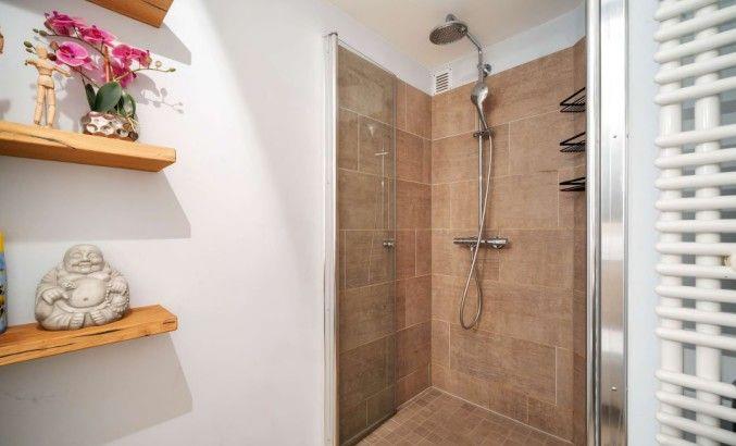 Die beiden Schlafzimmer im Untergeschoss liegen angenehm ruhig. Ein Schlafzimmer mit Doppelbett, ein weiteres mit Etagenbett – klar, gemütlich und bewusst zurückhaltend, damit man gut abschalten kann. Das Badezimmer ist modern und hochwertig ausgeführt und fügt sich stimmig in das Gesamtbild der Wohnung ein.