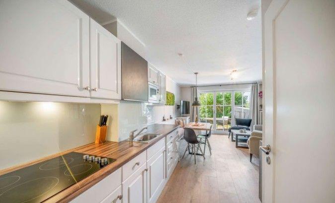 Auf zwei Ebenen und rund 60 m² bietet das Küstennest Raum für bis zu vier Personen. Der Wohnbereich ist offen, lichtdurchflutet und genau der richtige Ort für gemeinsames Ankommen – morgens mit Kaffee, nach einem Strandtag oder in den ruhigeren Abendstunden. Die Küche ist vollständig ausgestattet und selbstverständlich Teil des Raumes, funktional und hochwertig, ohne den Wohncharakter zu verlieren.