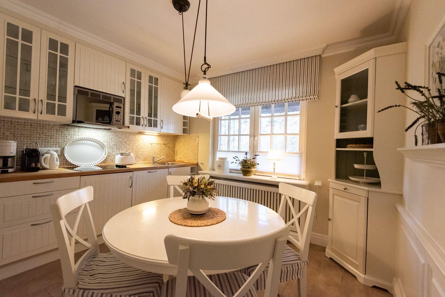 Küche: Helle und top ausgestattete Küche im Landhausstil mit einem einladendem Essplatz für bis zu 4 Personen.