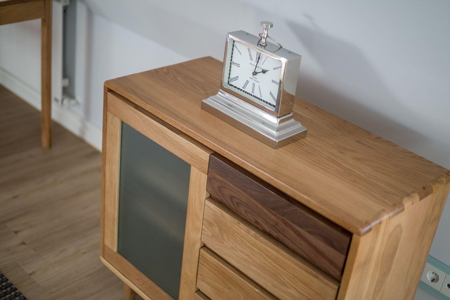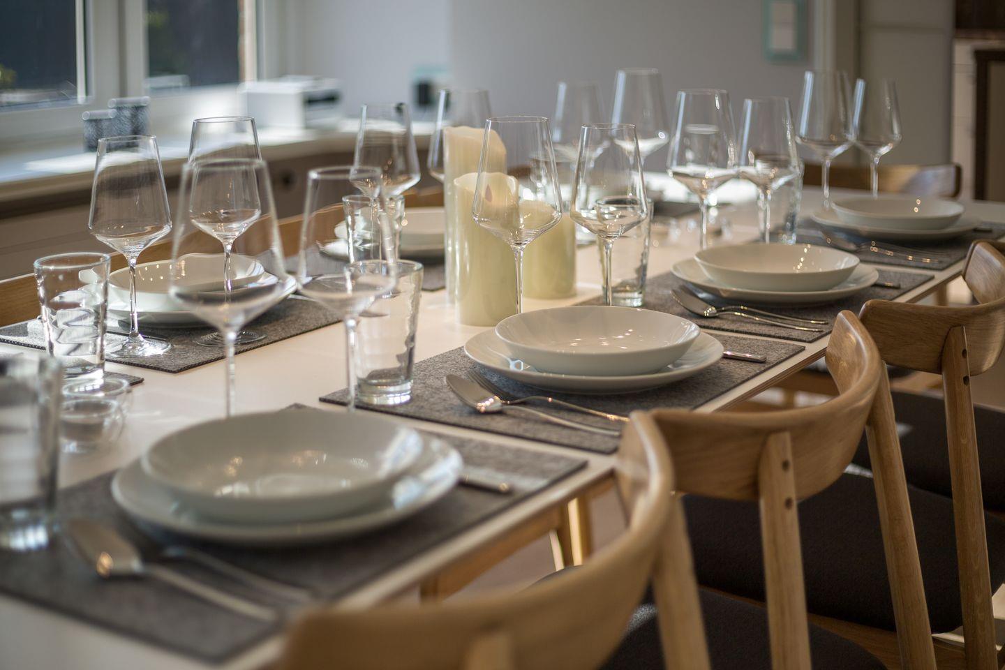 Der helle Wohnbereich im Erdgeschoss ist offen und einladend gestaltet. Große Fenster öffnen den Blick in den Garten und führen direkt auf die Terrasse. Hier entstehen ruhige Morgen mit Kaffee ebenso wie lange Abende am Esstisch oder gemütliche Stunden vor dem Kamin. Die separate Küche ist hochwertig ausgestattet und funktional durchdacht – ideal für alle, die auch im Urlaub gern gemeinsam kochen und genießen. Ergänzt wird das Erdgeschoss durch einen großzügigen Eingangsbereich, ein Gäste-WC sowie ein Schlafzimmer mit Einzelbett.