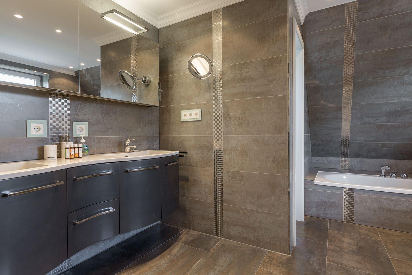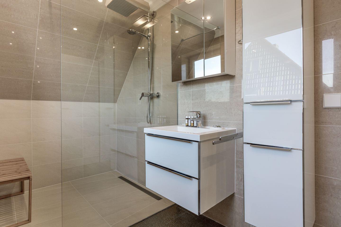 Im Obergeschoss setzen sich Raum und Komfort konsequent fort. Zwei großzügige Schlafzimmer mit Doppelbetten bieten viel Platz und Ruhe. Eines davon verfügt über ein eigenes Tageslichtbad mit Badewanne und Regendusche. Ein weiteres modernes Bad mit Dusche ist vom Flur aus erreichbar. Zusätzlich befindet sich auf dieser Ebene ein weiteres Schlafzimmer mit französischem Bett.