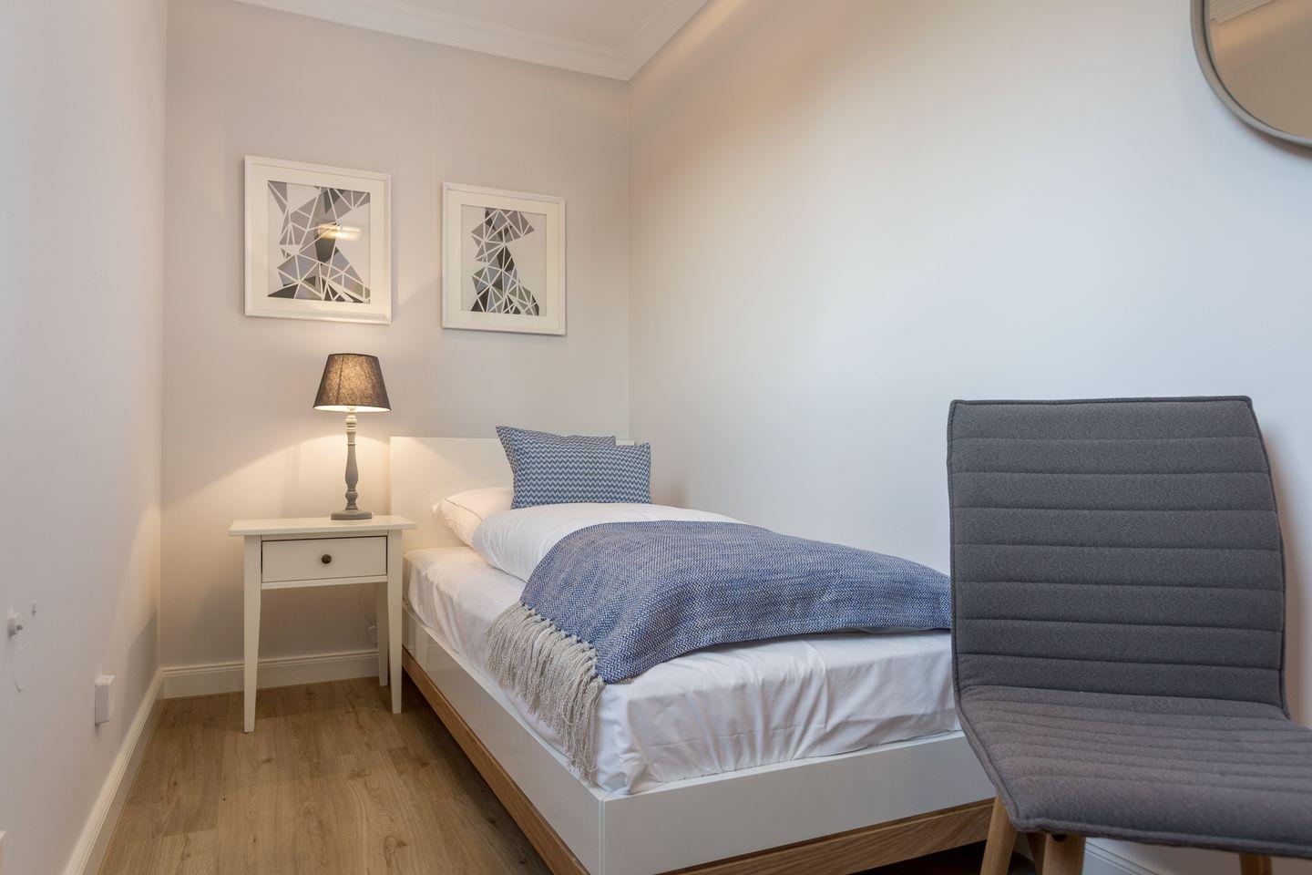 Das Dachgeschoss bildet einen ruhigen Abschluss des Hauses. Hier stehen ein Schlafzimmer mit zwei Einzelbetten sowie ein weiterer Raum mit Sofa und TV zur Verfügung – ideal als Rückzugsort für Kinder, Jugendliche oder für entspannte Stunden abseits des Trubels.