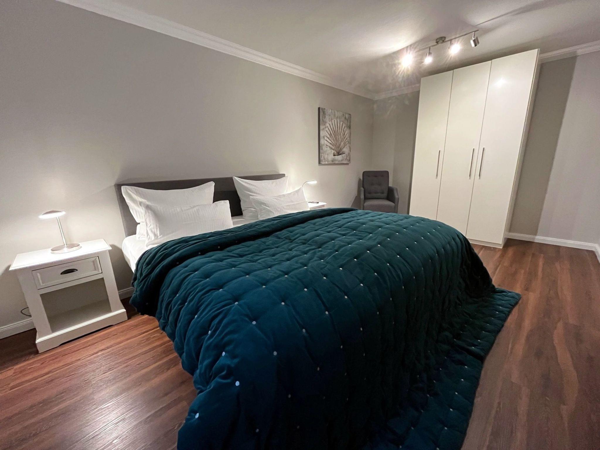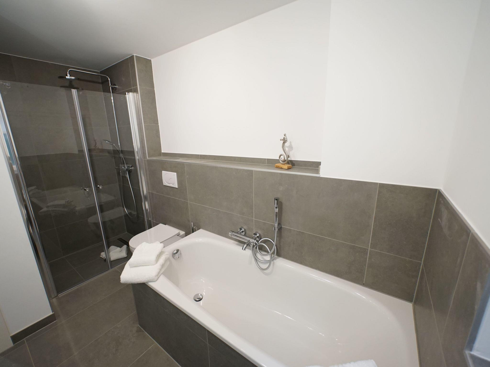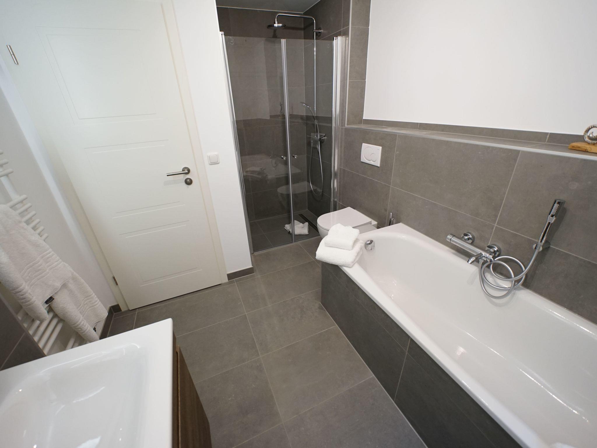 Inside the flat, two bathrooms with shower and WC as well as an additional bathtub ensure comfort and convenience. A pod coffee machine, kettle, dishwasher and ceramic hob form the basis for home-cooked meals. The equipment is complemented by a microwave with grill function. Communal facilities such as a washing machine and tumble dryer are available in the building and offer additional comfort for your stay.
