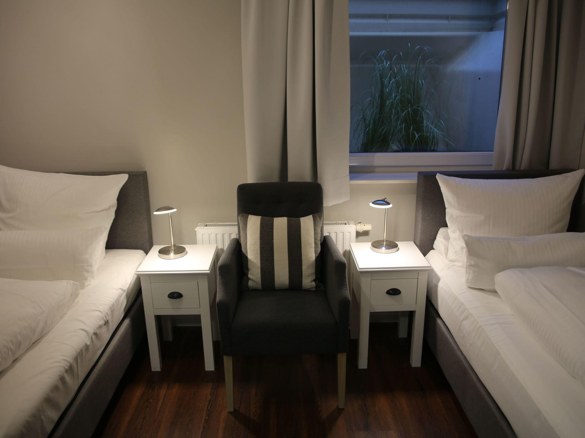 The interior of the flat leaves nothing to be desired. A washing machine and tumble dryer are available for communal use in the building, which is particularly practical for longer stays. The kitchen boasts a ceramic hob, a coffee machine for pods as well as a kettle and a dishwasher, so you are well equipped to prepare delicious meals for yourself and your loved ones. The living area includes cosy seating, a sofa bed, a TV and a CD player to guarantee relaxing evenings.