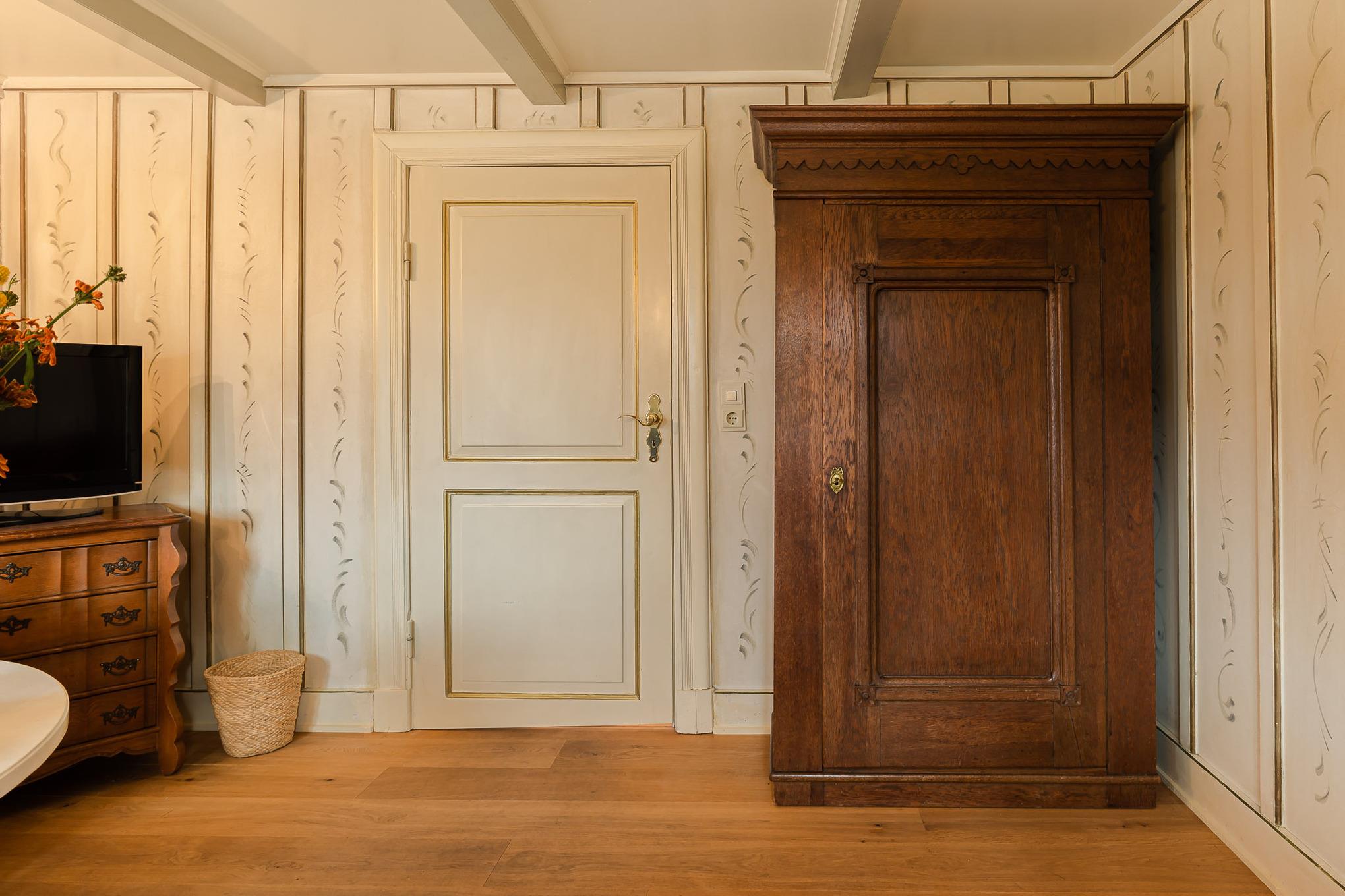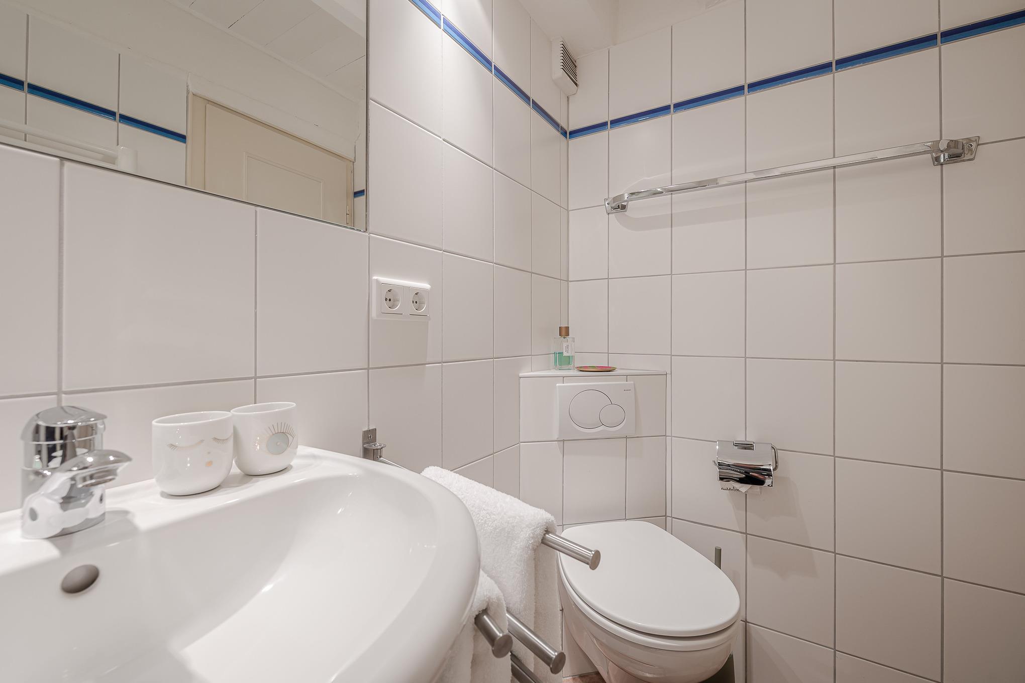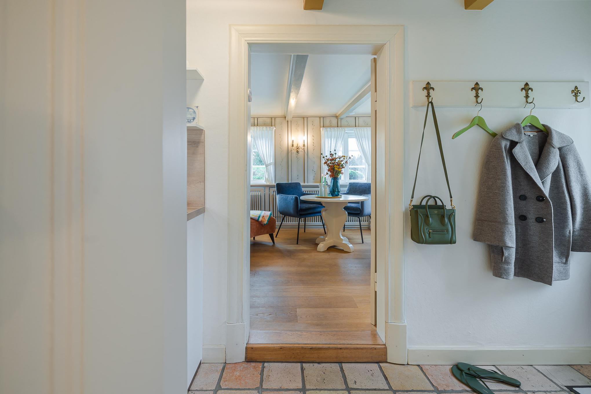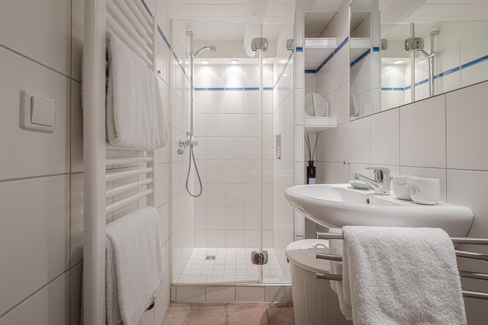 Weiter geht es zur Pantryküche – klein, fein und perfekt für den ersten Kaffee am Morgen oder eine kleine Mahlzeit zwischendurch. Direkt dahinter befindet sich das Badezimmer mit Dusche und WC. Gegenüber öffnet sich der Wohn- und Essbereich, in dem ein alter Friesenschrank mit originalem Friesengeschirr die Geschichte des Hauses lebendig hält. Hier können Sie lesen, spielen, fernsehen oder einfach den Tag ruhig ausklingen lassen. Dahinter liegt das zweite Schlafzimmer mit einem komfortablen Doppelbett für erholsame Nächte.