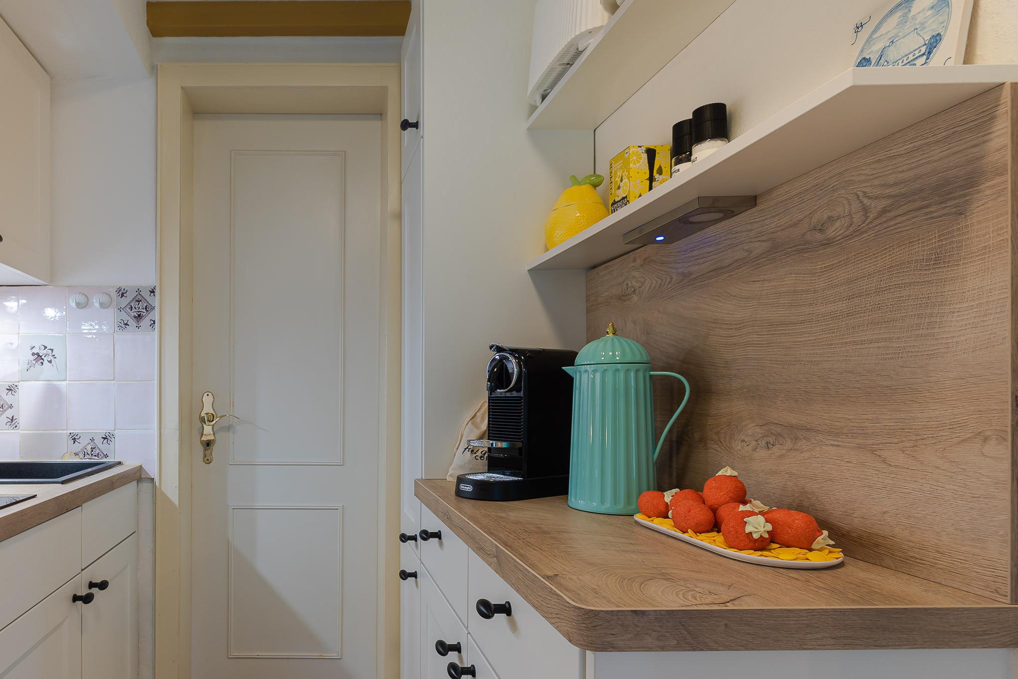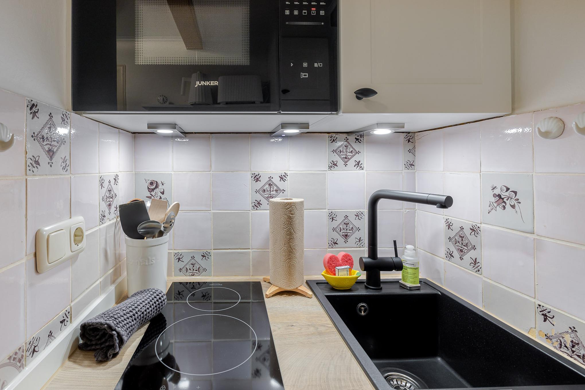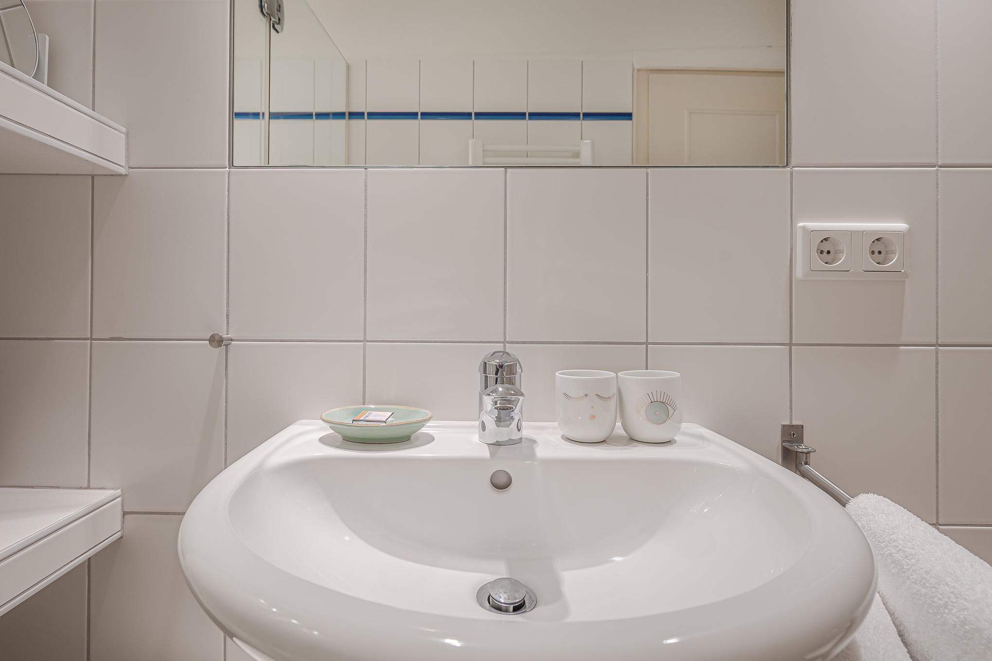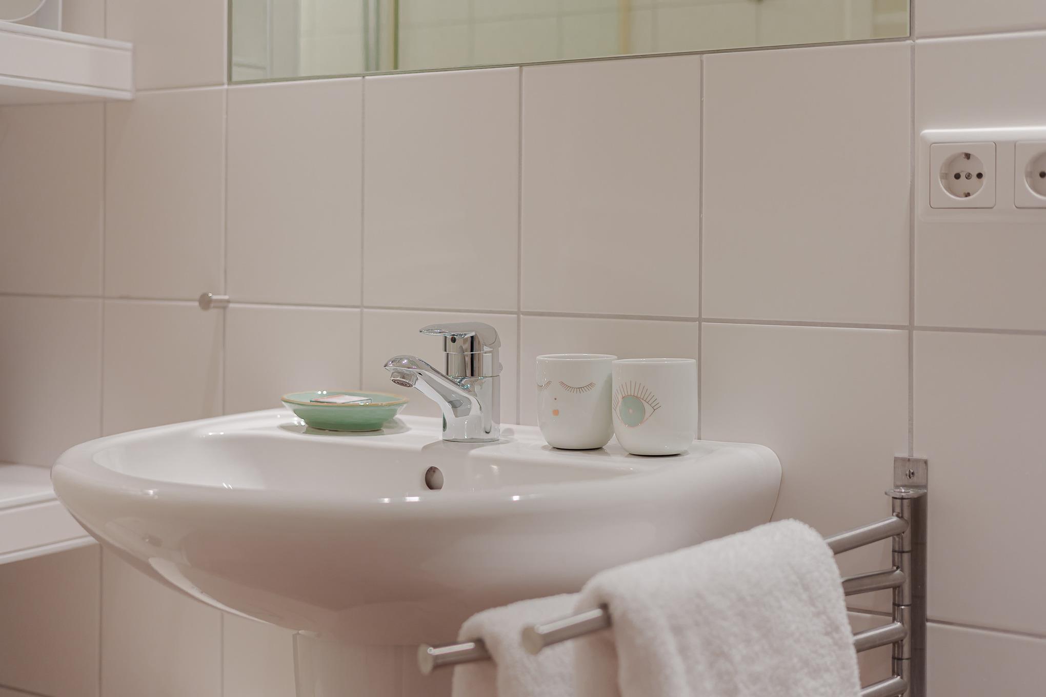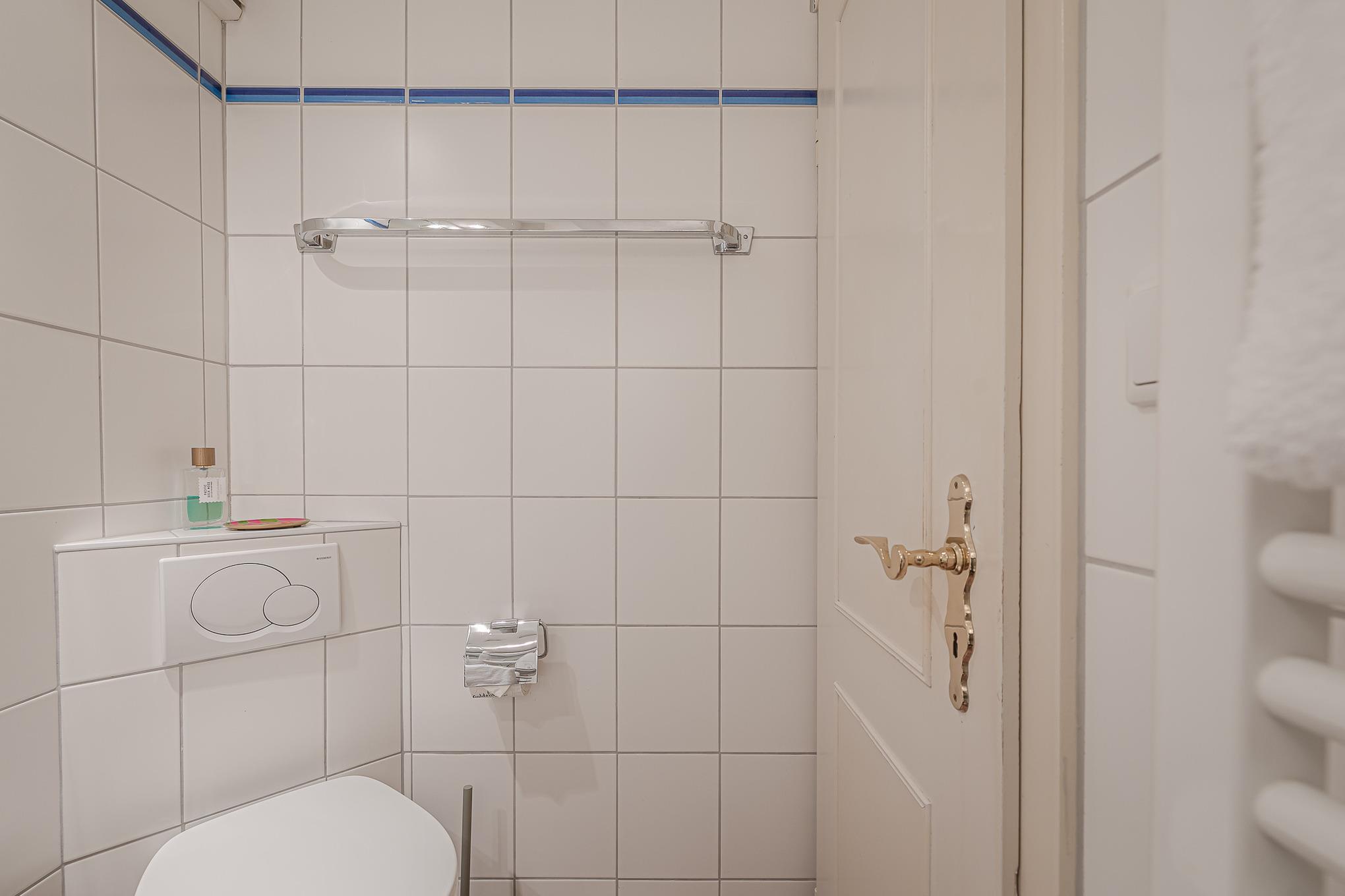 Weiter geht es zur Pantryküche – klein, fein und perfekt für den ersten Kaffee am Morgen oder eine kleine Mahlzeit zwischendurch. Direkt dahinter befindet sich das Badezimmer mit Dusche und WC. Gegenüber öffnet sich der Wohn- und Essbereich, in dem ein alter Friesenschrank mit originalem Friesengeschirr die Geschichte des Hauses lebendig hält. Hier können Sie lesen, spielen, fernsehen oder einfach den Tag ruhig ausklingen lassen. Dahinter liegt das zweite Schlafzimmer mit einem komfortablen Doppelbett für erholsame Nächte.