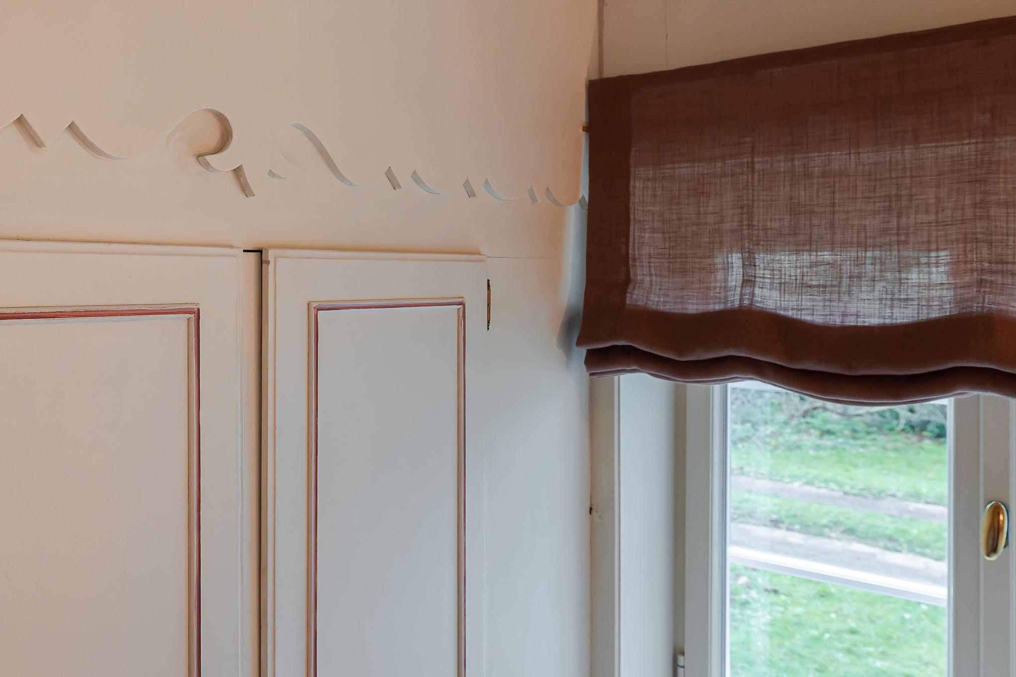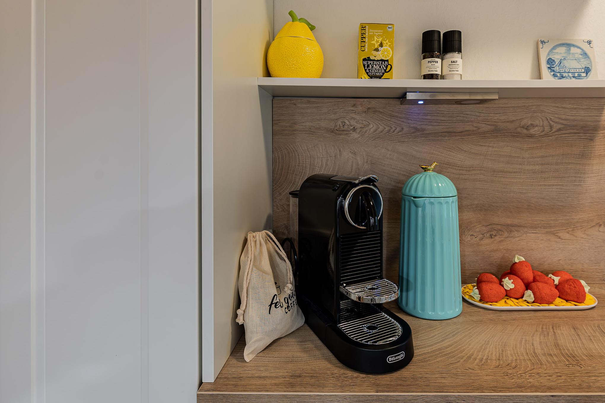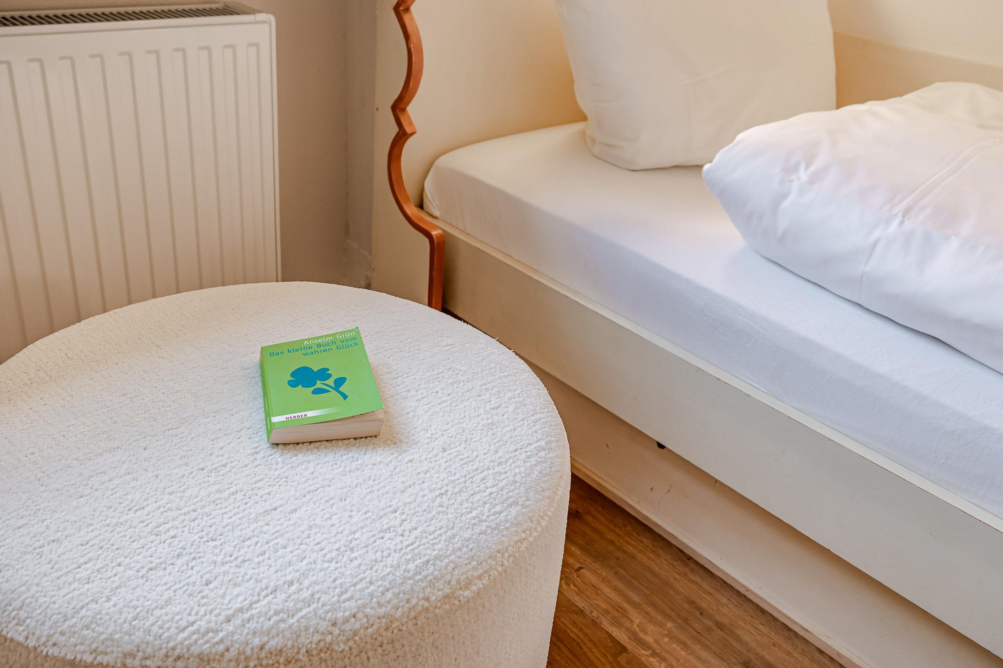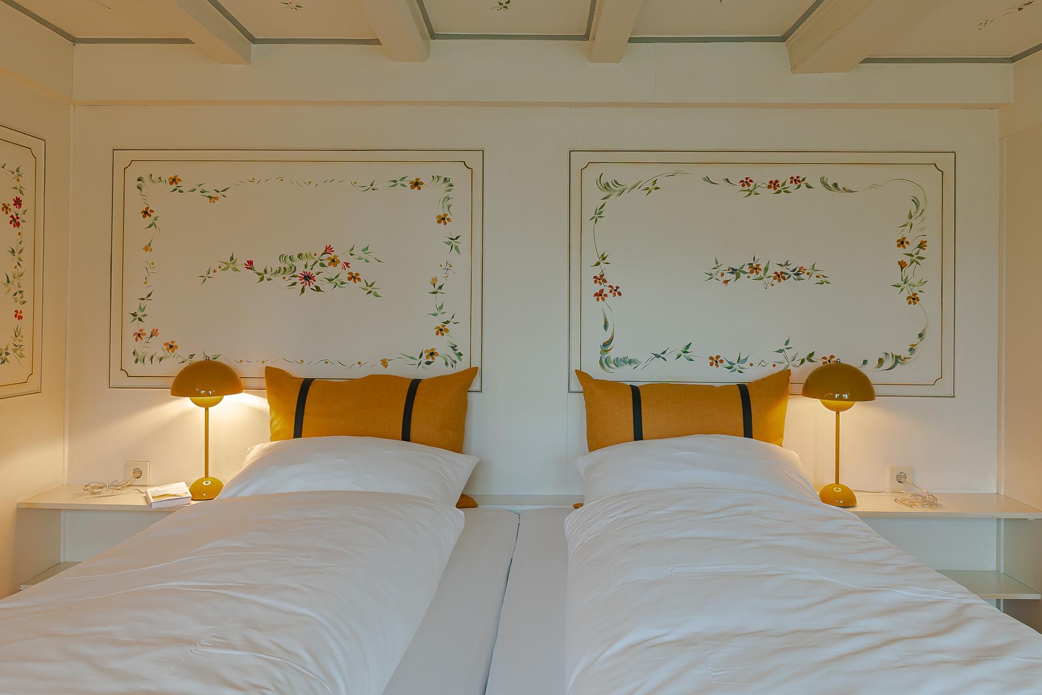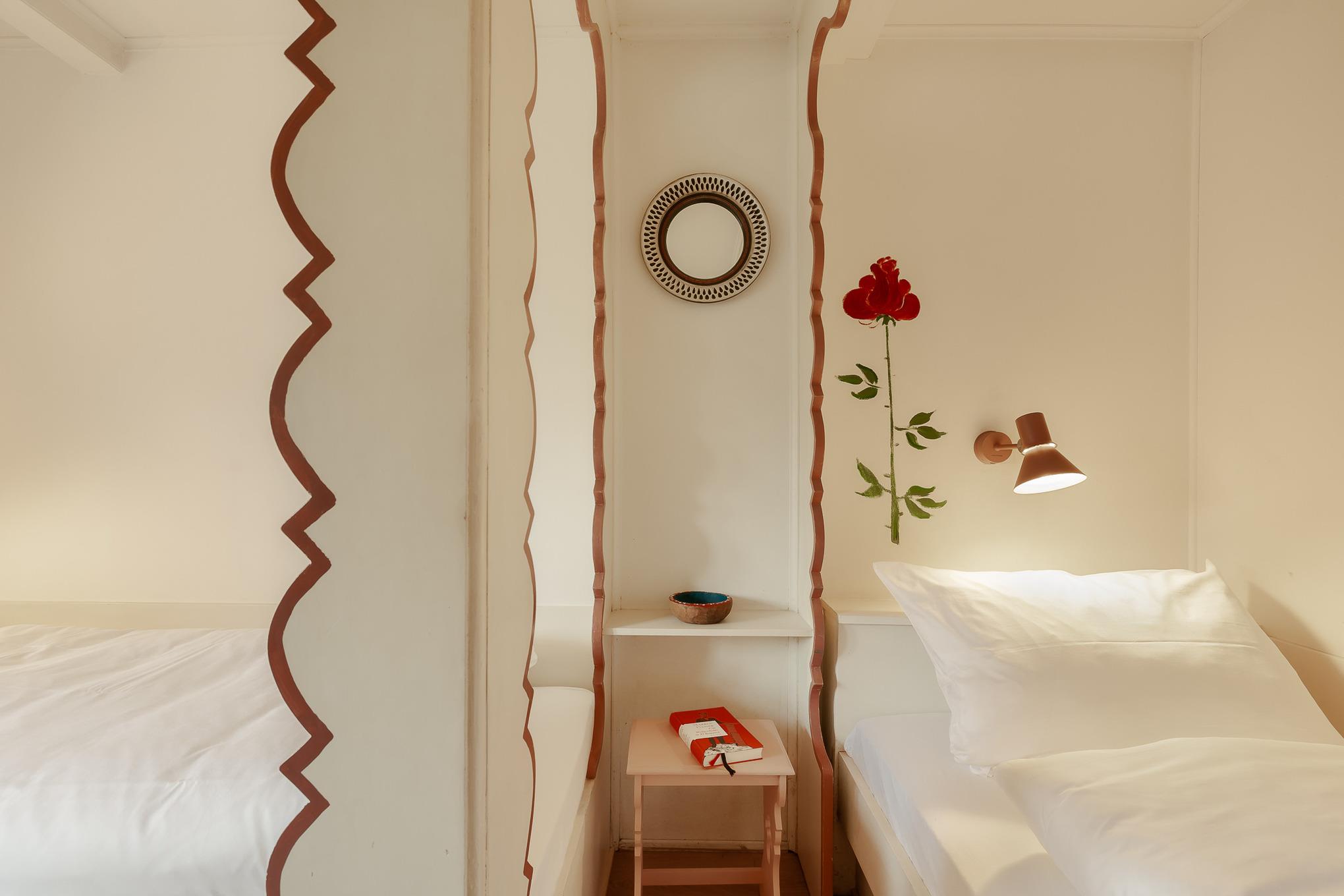 Schon beim Betreten der Wohnung empfängt Sie der fröhliche, warme Charakter von Bullerbü. Vom Flur aus gelangen Sie in das erste Schlafzimmer mit zwei gemütlichen Alkovenbetten, liebevoll ergänzt durch altrosafarbene Details. Eine handgemalte, apricotfarbene Rose an der Wand sorgt für einen besonderen, fast poetischen Akzent, während moderne Designelemente wie die Flowerpot-Lampe und ein kuscheliger Pouf dem Raum eine spielerische Leichtigkeit verleihen.