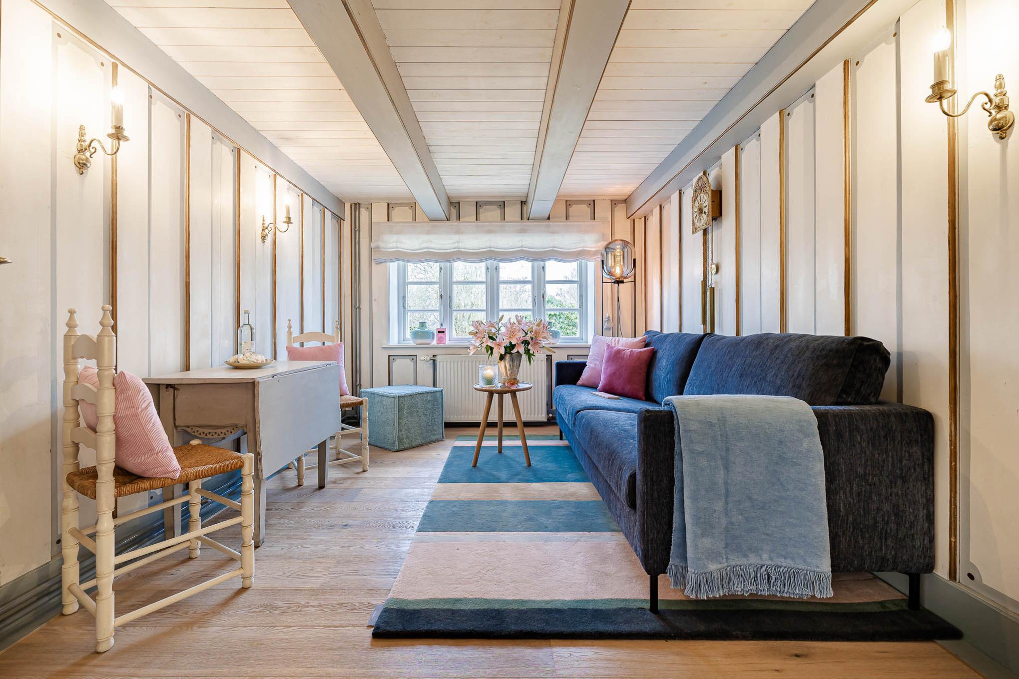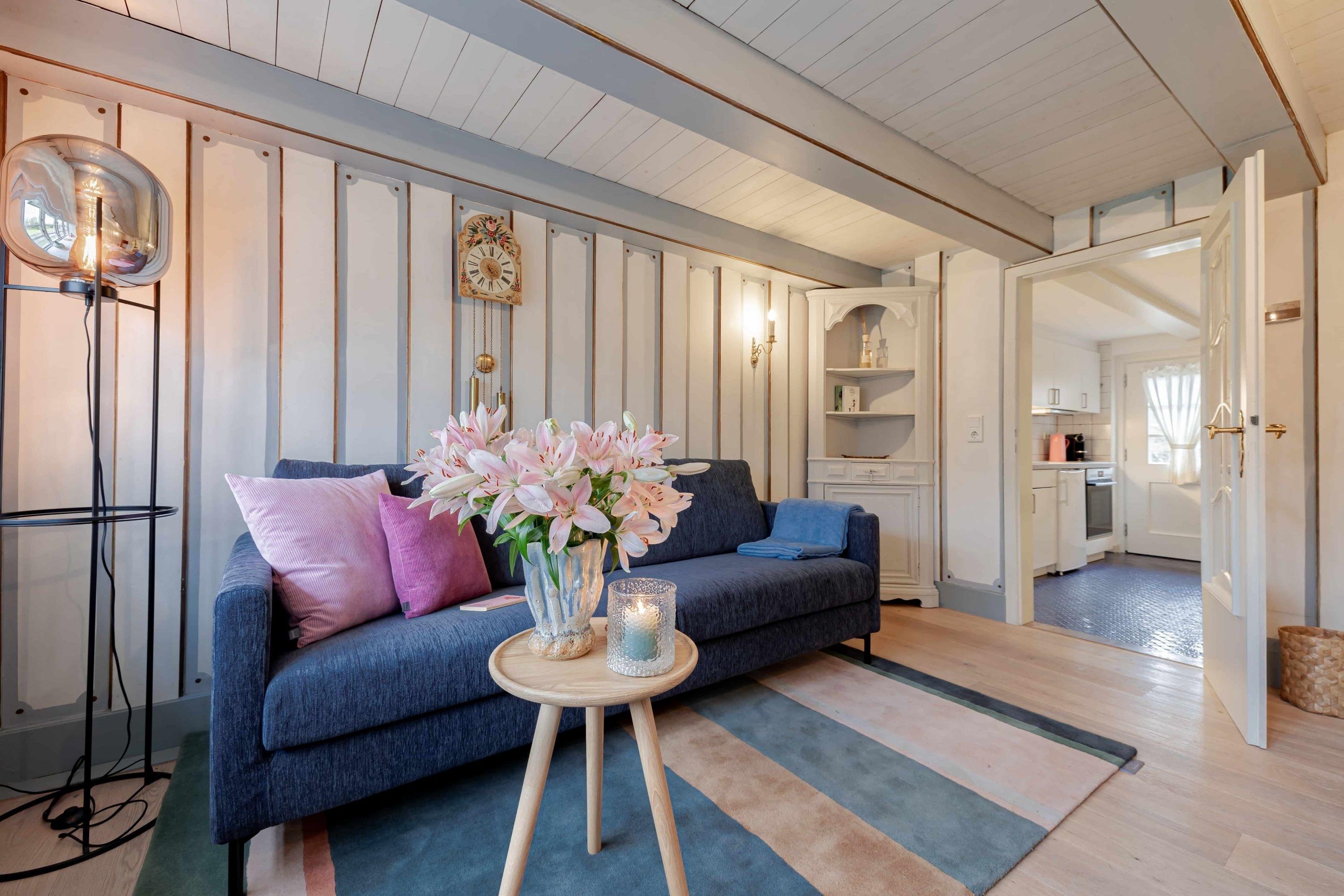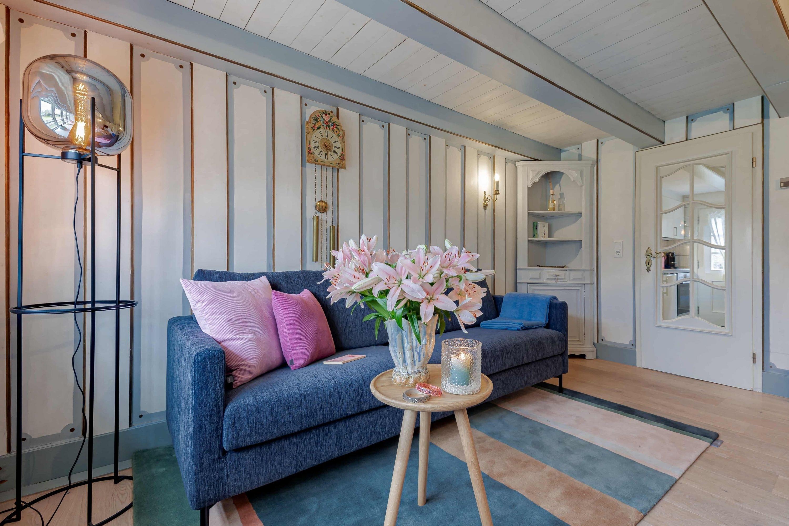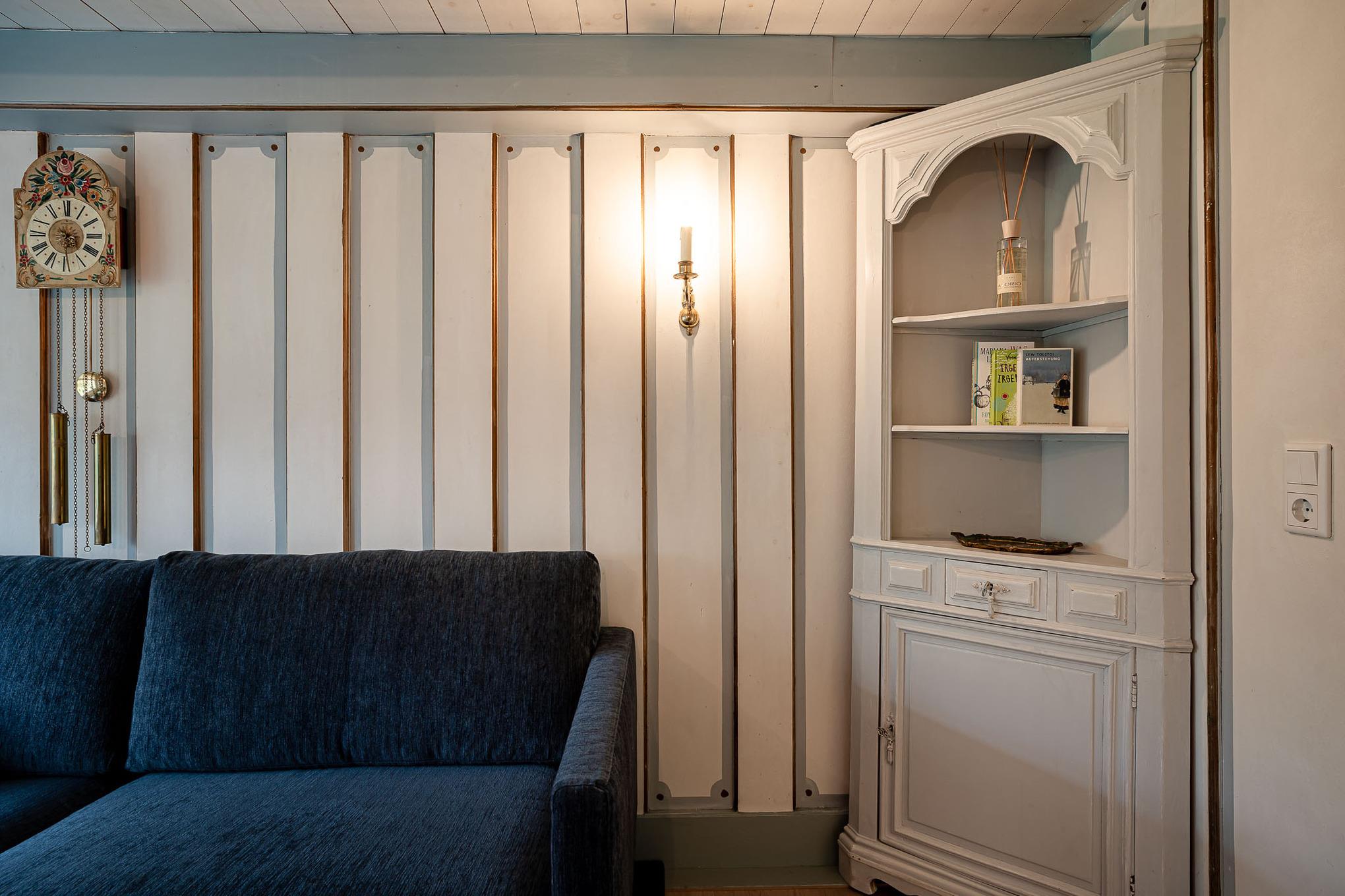 Auf zwei Stockwerken kommt die Mischung des alten Charmes und der modernen Einrichtung gut zur Geltung. Wenn Sie hereinkommen, stehen Sie direkt im Flur, wo sich auch die Küchenzeile befindet. Weiter durch können sie es sich im Wohnzimmer auf dem hellblauen Samtsofa gemütlich machen. Die wunderschöne, alte Junghans Uhr verleiht dem Raum einen ganz besonderen Charme und ist ein echter Hingucker. Auf der oberen Etage finden Sie das Schlafzimmer mit zwei gemütlichen Einzelbetten, direkt gegenüber befindet sich das Badezimmer mit Fenster und einer Dusche.