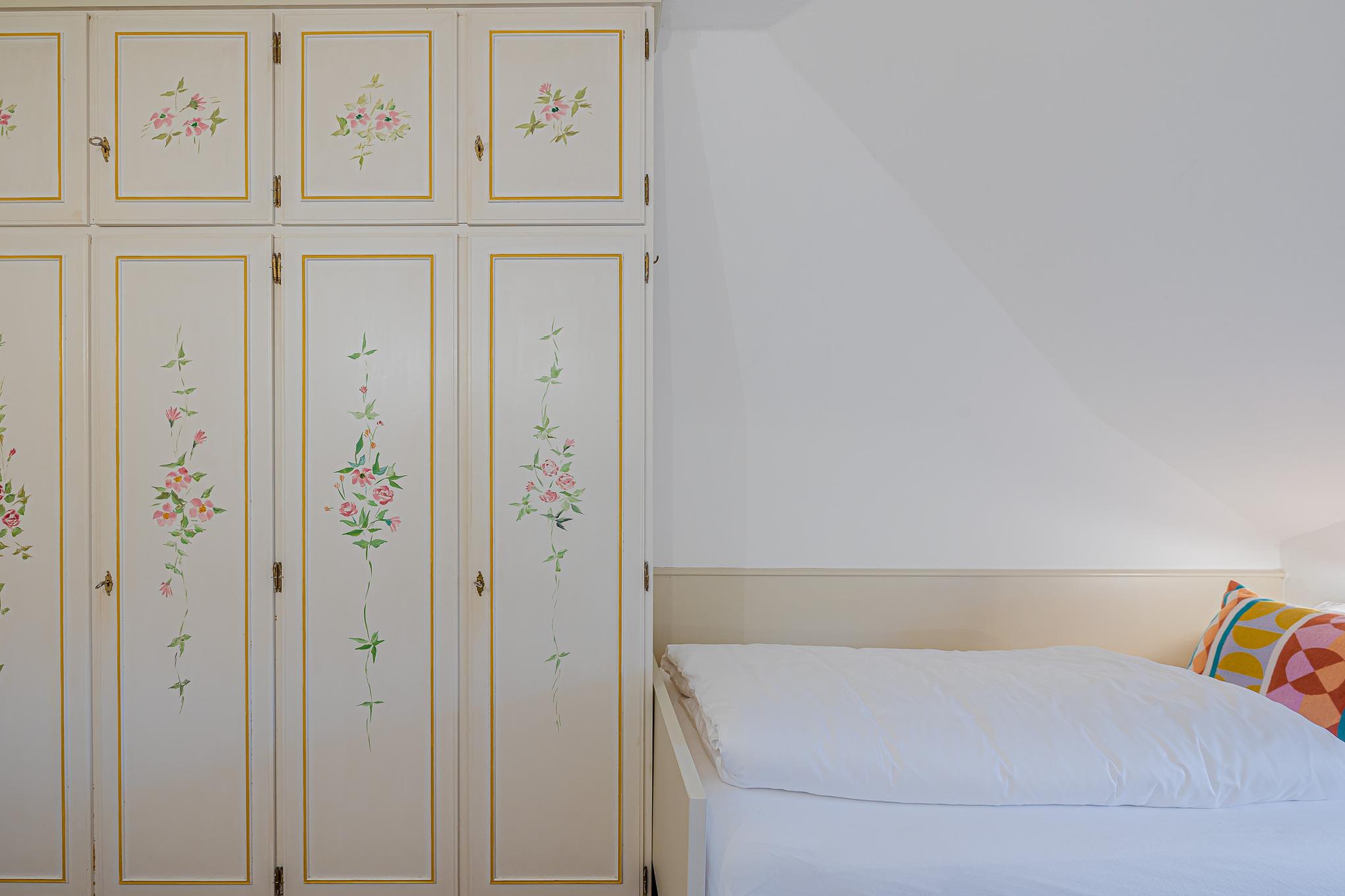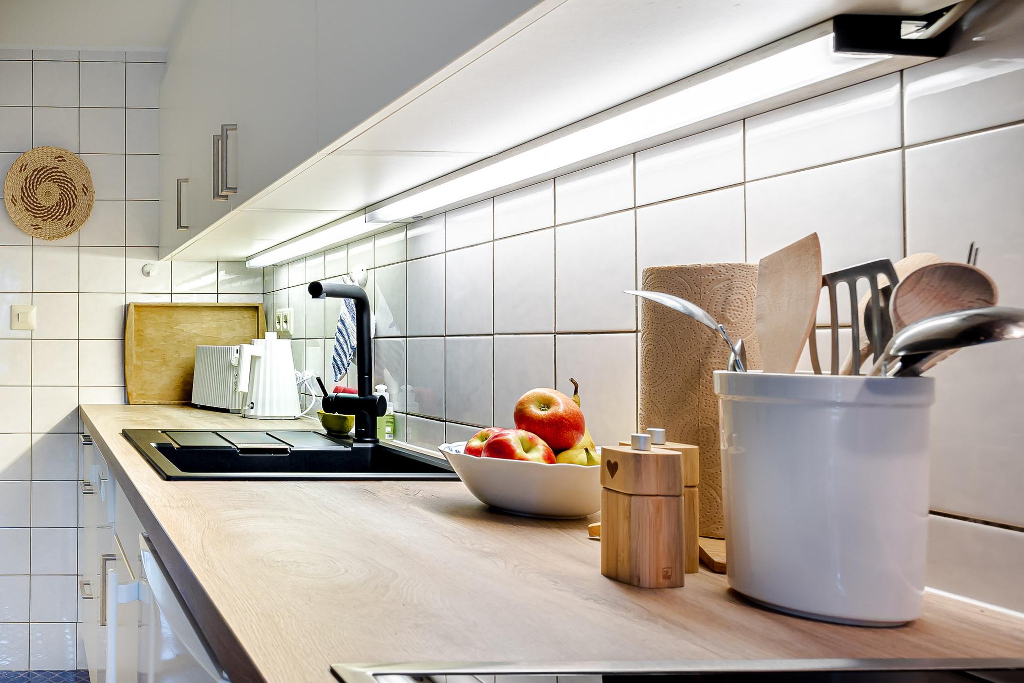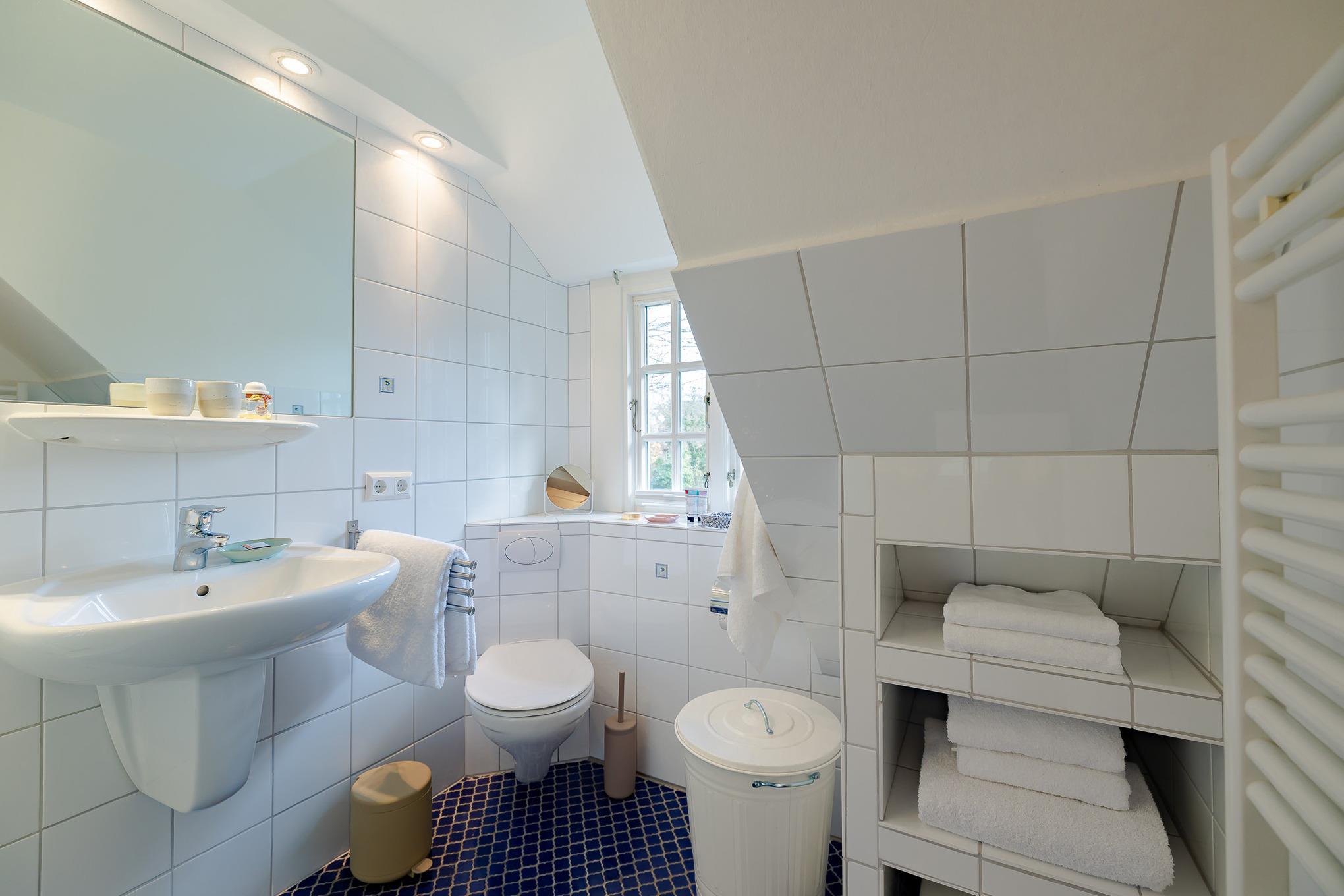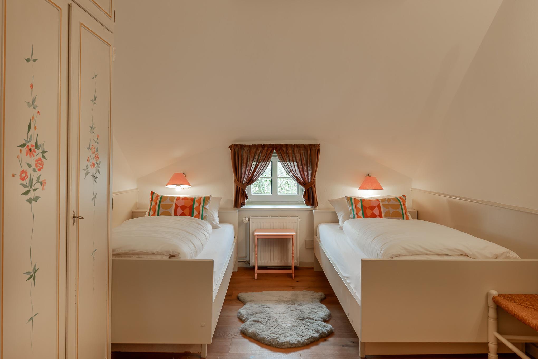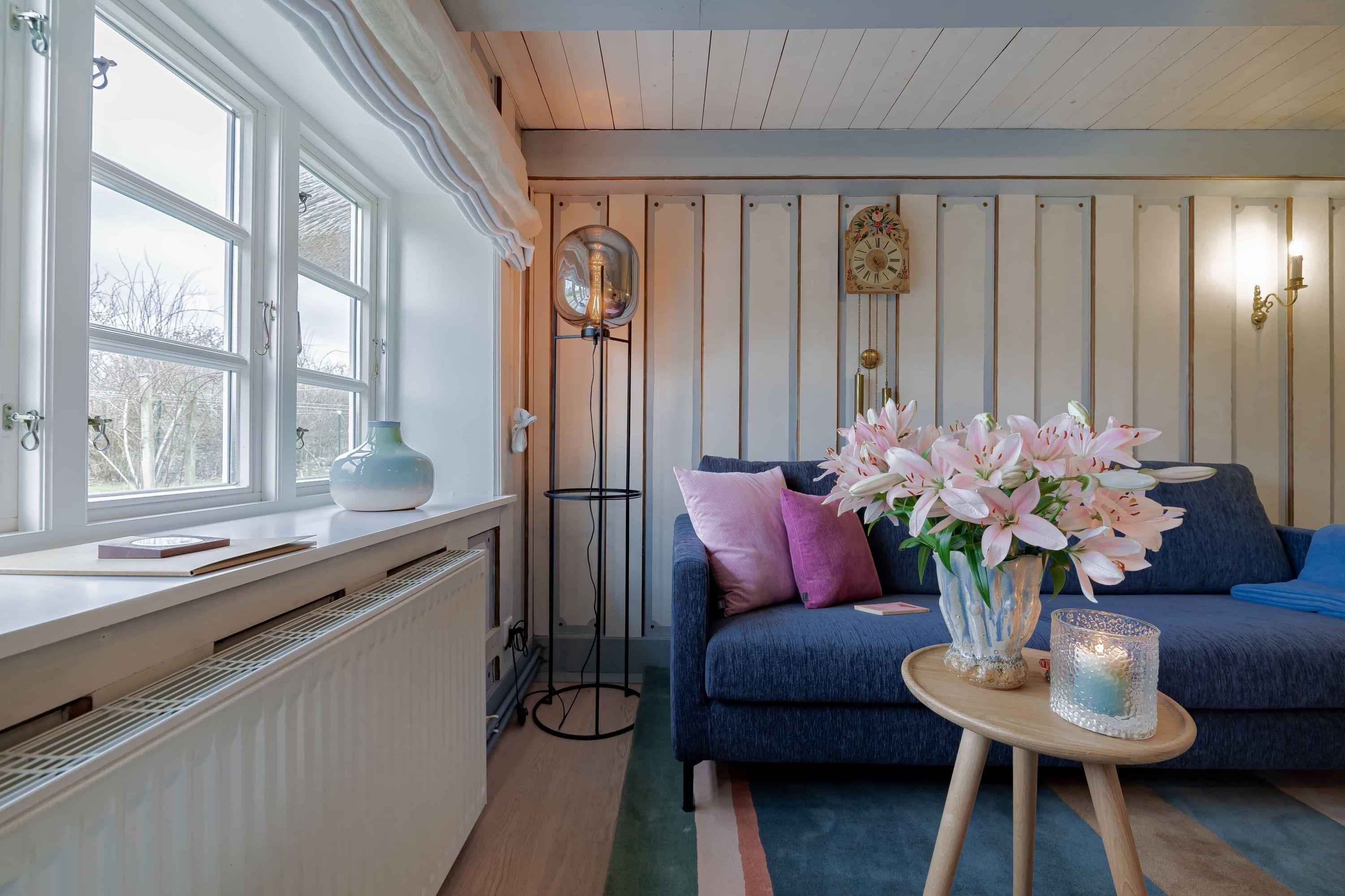 Auf zwei Stockwerken kommt die Mischung des alten Charmes und der modernen Einrichtung gut zur Geltung. Wenn Sie hereinkommen, stehen Sie direkt im Flur, wo sich auch die Küchenzeile befindet. Weiter durch können sie es sich im Wohnzimmer auf dem hellblauen Samtsofa gemütlich machen. Die wunderschöne, alte Junghans Uhr verleiht dem Raum einen ganz besonderen Charme und ist ein echter Hingucker. Auf der oberen Etage finden Sie das Schlafzimmer mit zwei gemütlichen Einzelbetten, direkt gegenüber befindet sich das Badezimmer mit Fenster und einer Dusche.