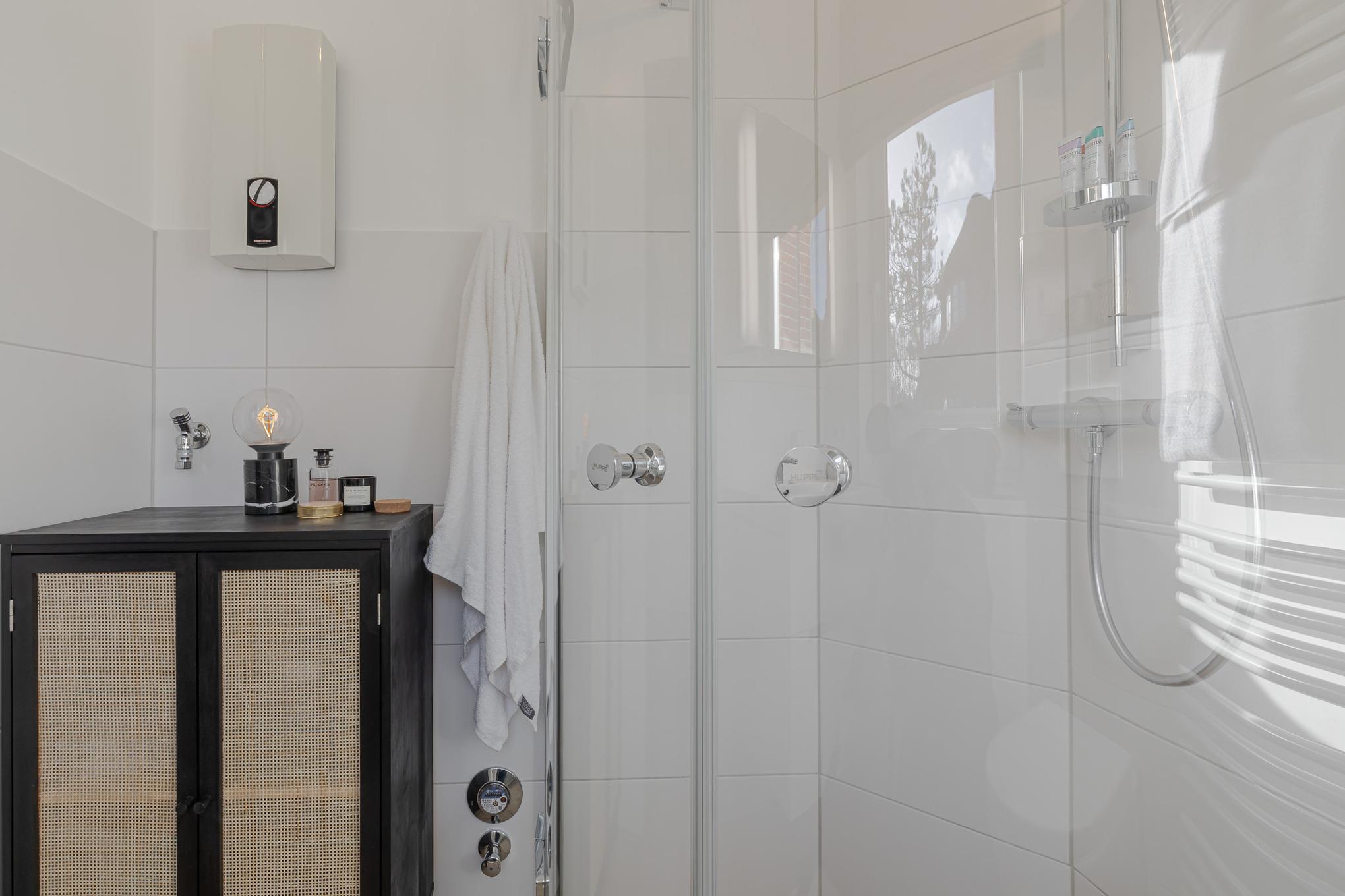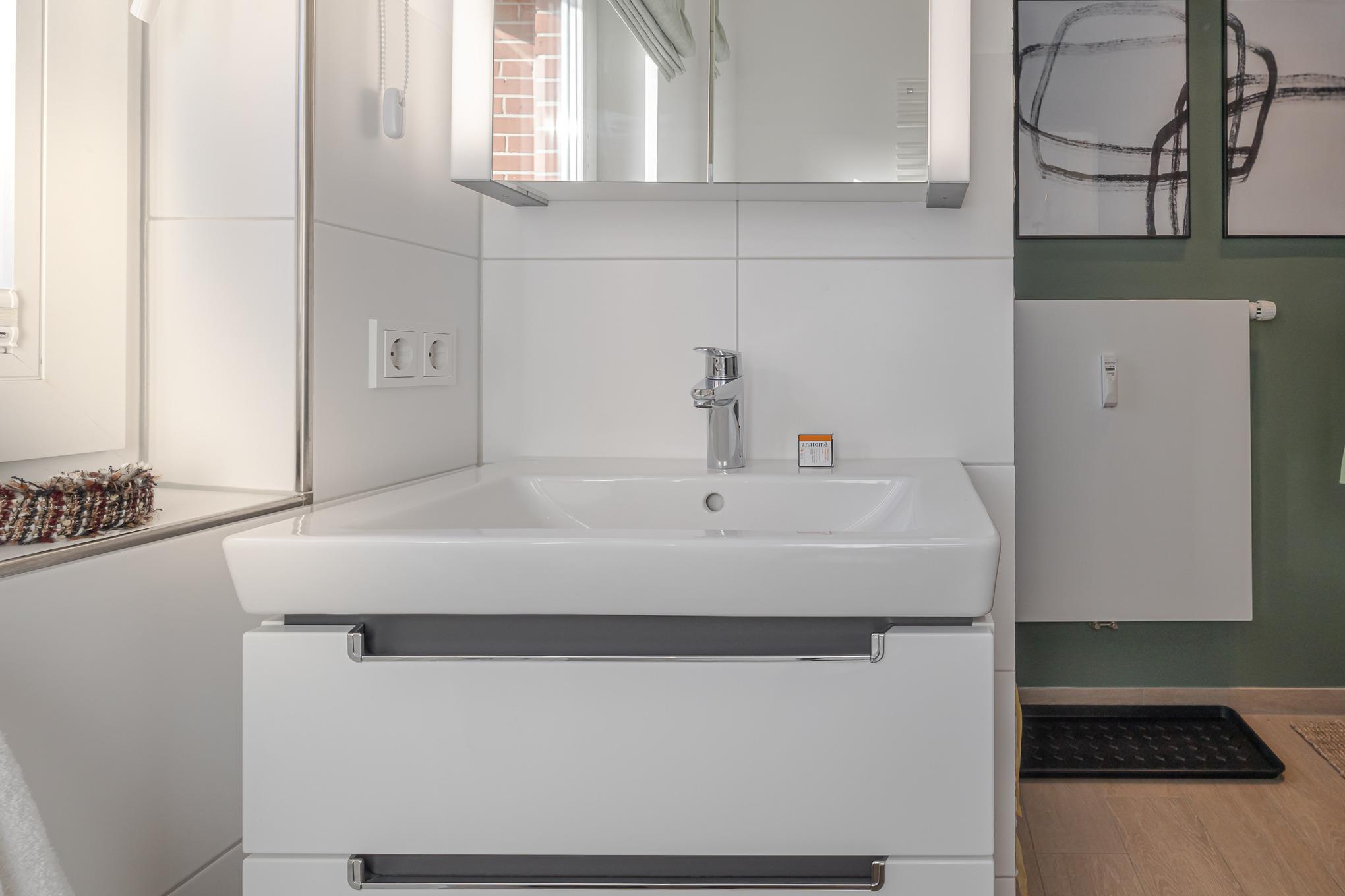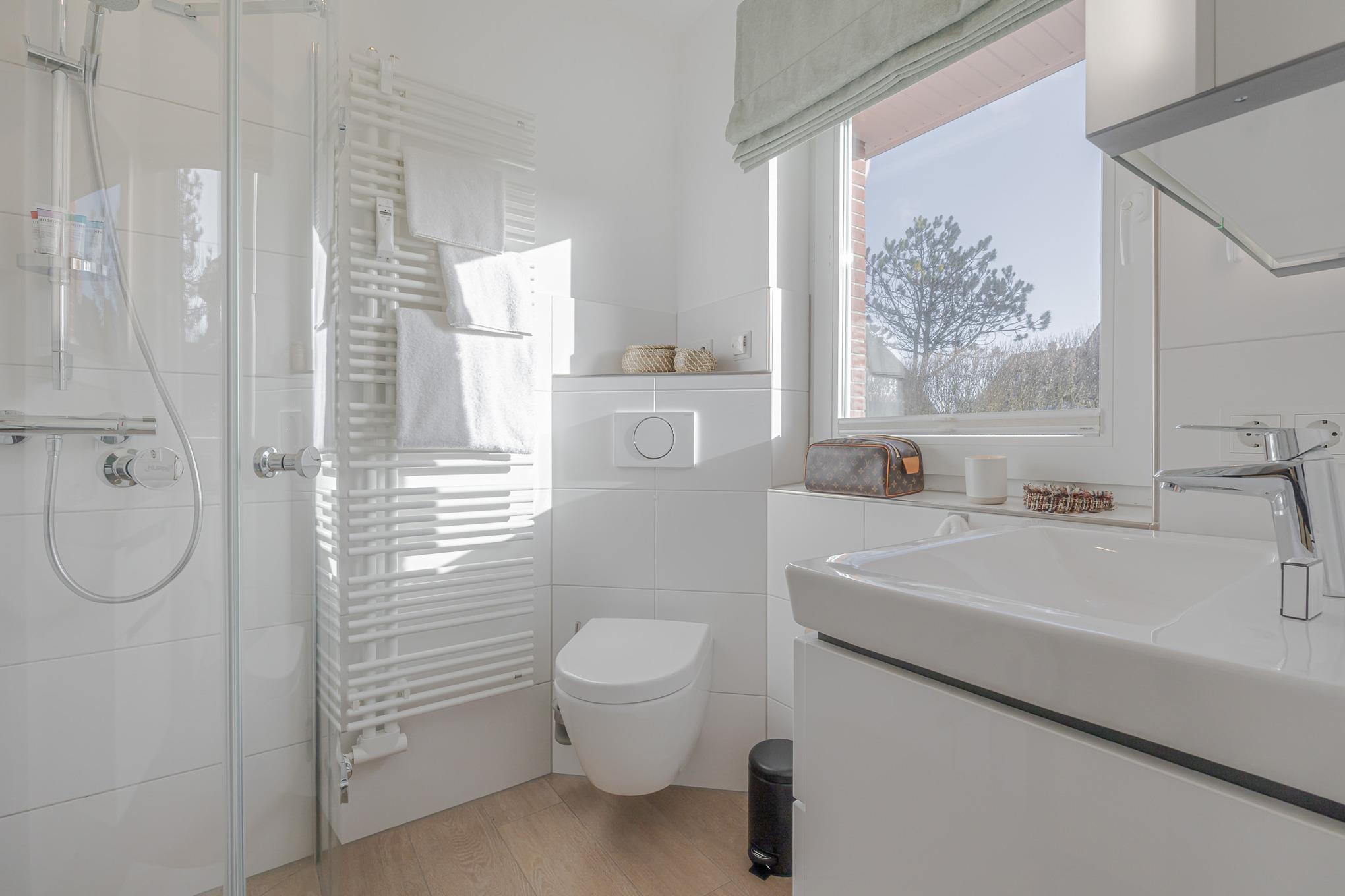 Schon beim Eintreten empfängt Sie ein heller Flur mit Akustikpaneelen, Garderobe und Ganzkörperspiegel, der direkt in den offenen Wohn- und Essbereich führt. Gleich daneben liegt das moderne Tageslichtbad mit ebenerdiger Dusche, viel Ablagefläche und warmen, scandinavisch anmutenden Holzoptik-Fliesen.
