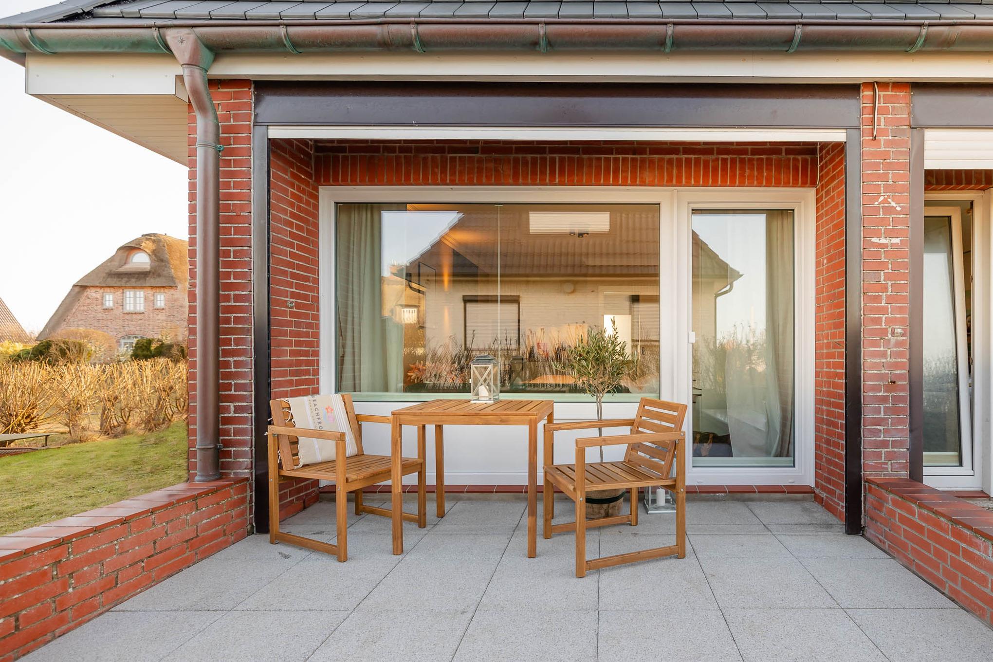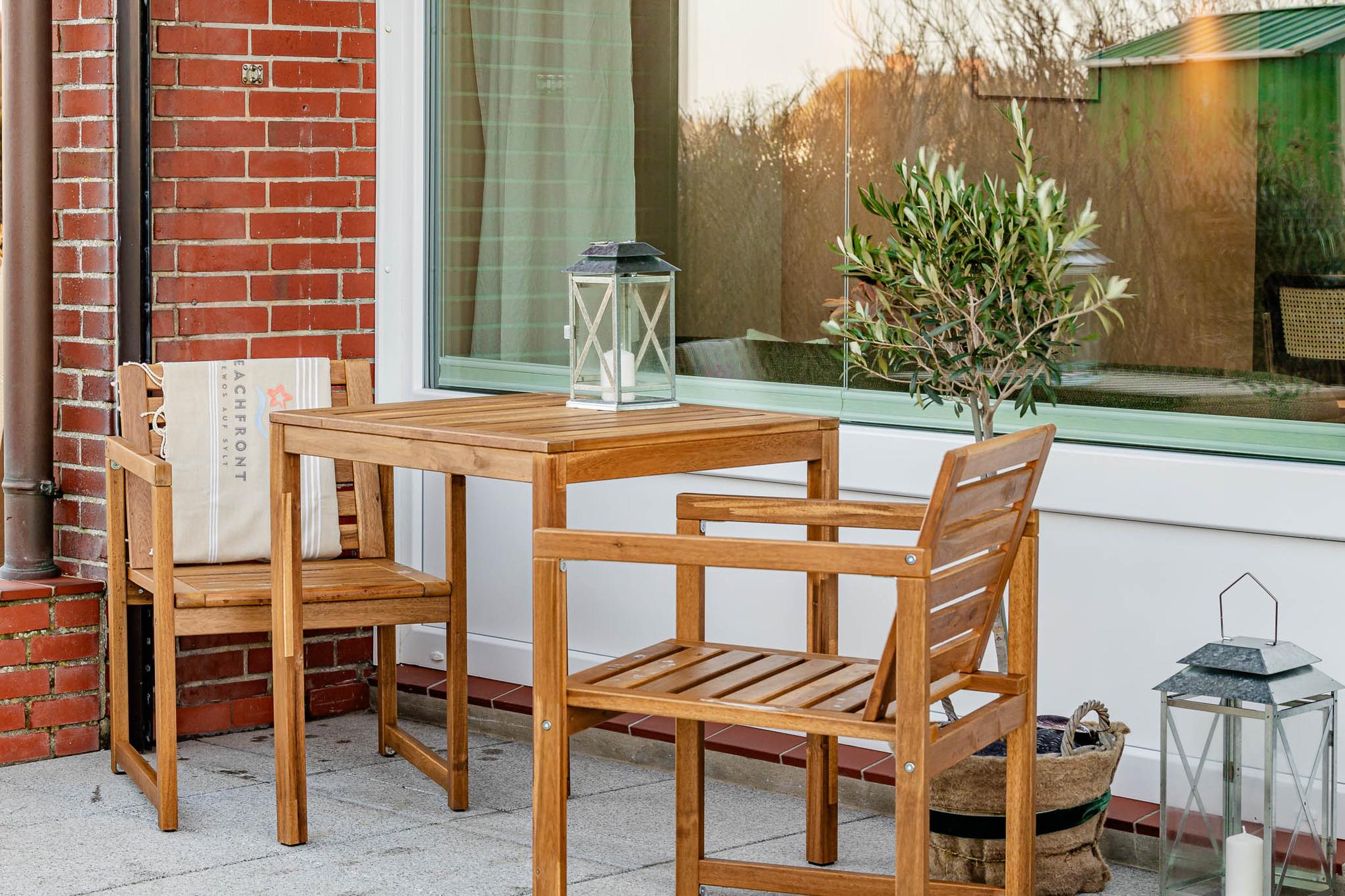 Draußen erwartet Sie Ihre eigene Terrasse mit Gartenteil und Strandkorb (Mai–Oktober). Hier lassen Sie den Tag mit einem Glas Wein ausklingen oder starten morgens mit Sonnenfrühstück – bei guter Sicht sogar mit kleinem Meerblick.