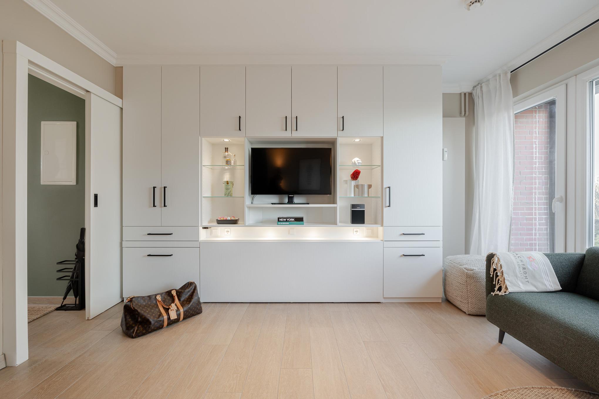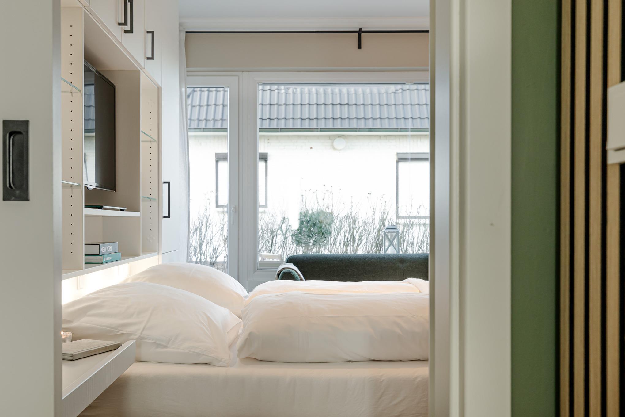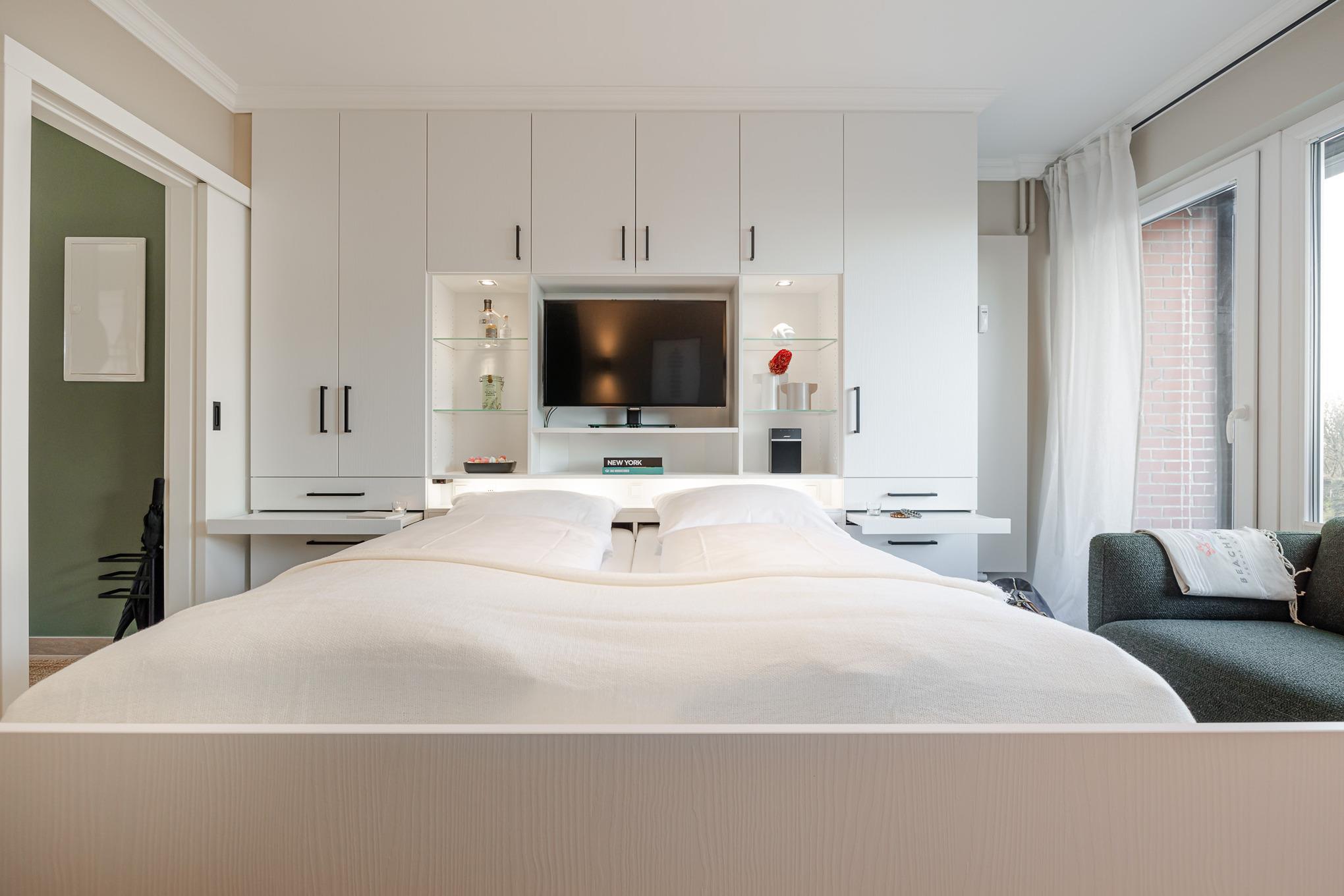 Im Wohnbereich genießen Sie den Blick Richtung Meer, entspannen auf der bequemen Couch, schauen Smart-TV oder hören Musik über die Bose-Bluetooth-Box. Abends verwandelt sich der Raum per Knopfdruck in einen Schlafbereich: Ein 1,80 m breites Bett fährt elegant aus dem Schranksystem, ergänzt durch ausziehbare Nachttische und clever integrierten Stauraum für Kleidung.