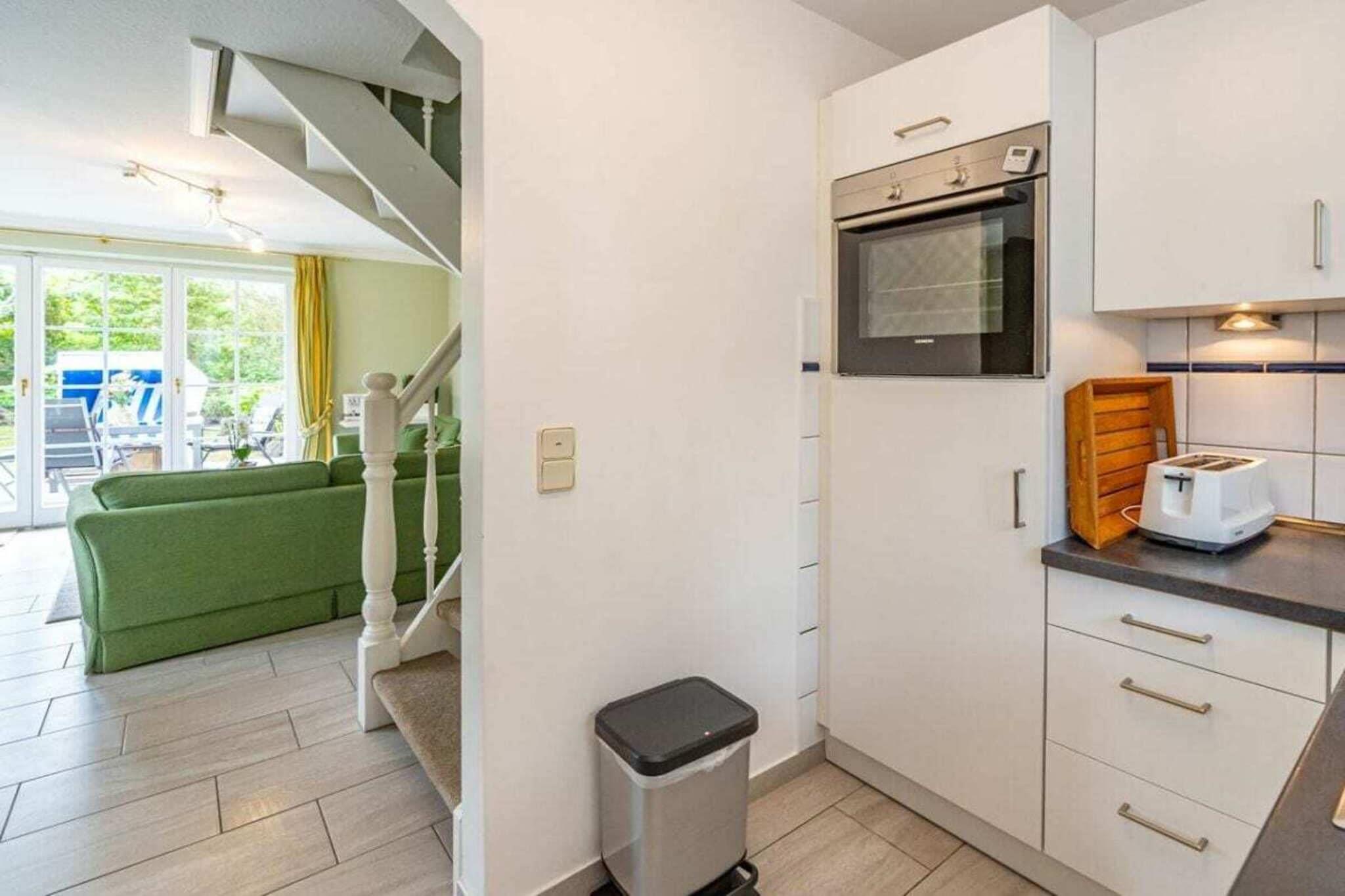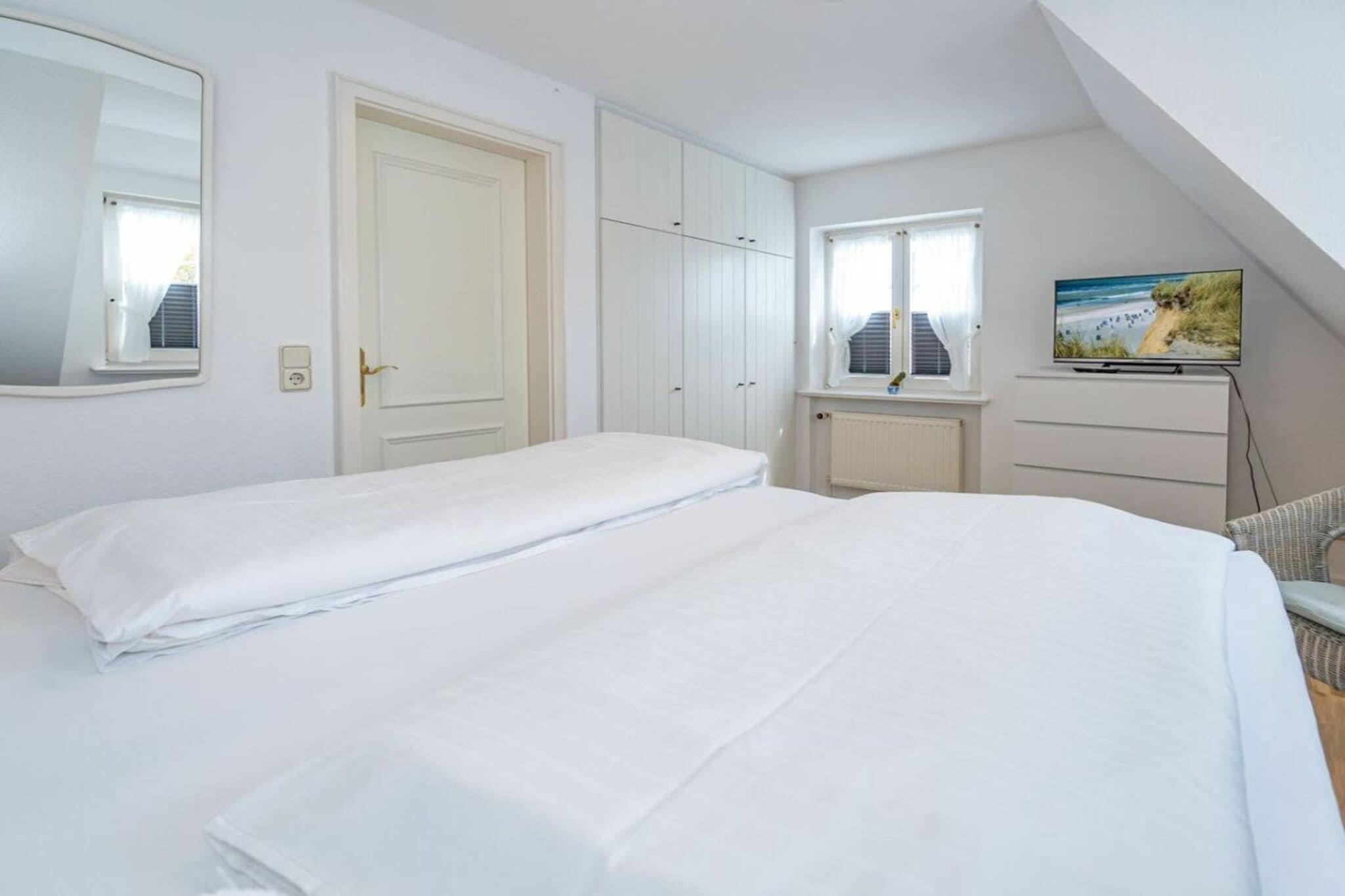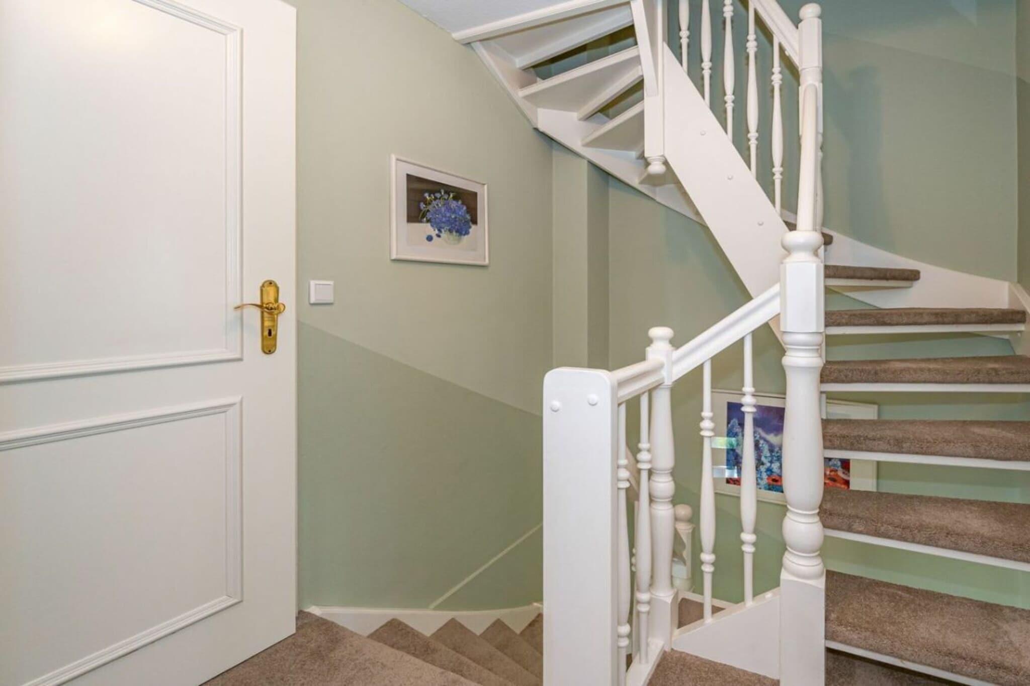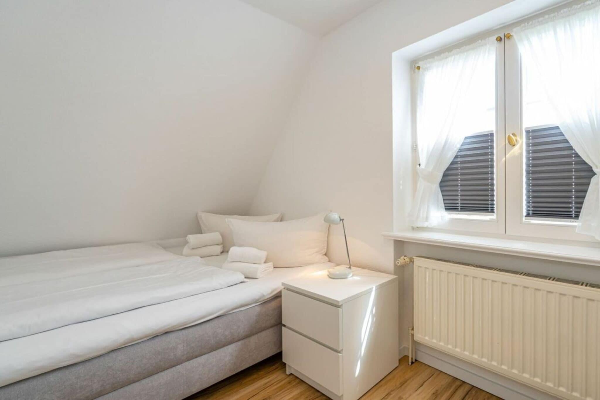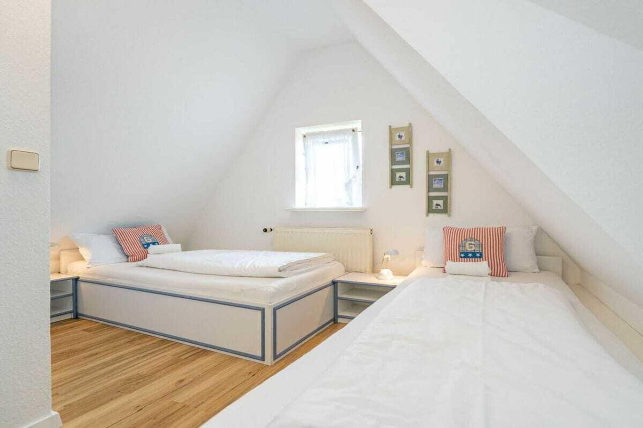 Frisian House "Inselperle im Horsatal" Bright Frisian house on three levels without a basement. On the ground floor, a vestibule leads to a tastefully furnished living-dining room, the heart of the apartment, with a sofa corner and a large dining table for 6 people. The property also features underfloor heating, a cable flat-screen TV, a DVD player, a radio, a telephone, and Wi-Fi. A separate kitchen with a ceramic hob, dishwasher, oven, microwave, and refrigerator is available. A guest toilet is on the ground floor, a shower room on the first floor, and a toilet on the second floor. A Nordic white wooden staircase leads to the upper floor, where there are two bedrooms and a bathroom. The master bedroom has a double bed (2 x 90 cm wide), built-in wardrobes, a cable flat-screen TV, and a desk. The smaller bedroom has a French bed (1.50 m wide) and a built-in wardrobe. The bathroom with shower, toilet, and sink has underfloor heating. Attic with two separate beds (each 90 cm wide) and a toilet with a sink. One small dog is allowed for a fee.