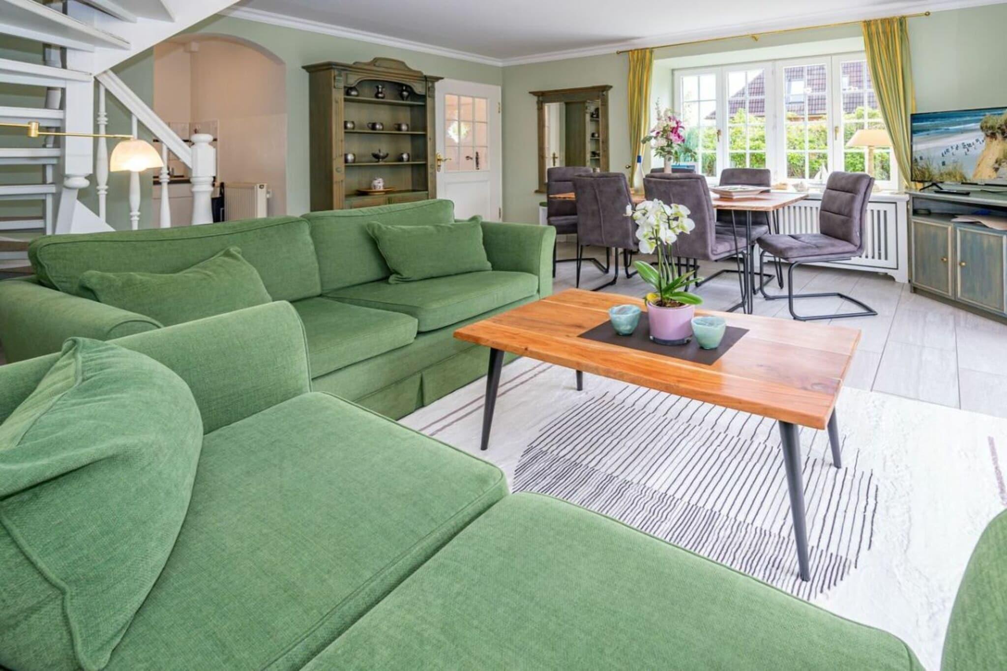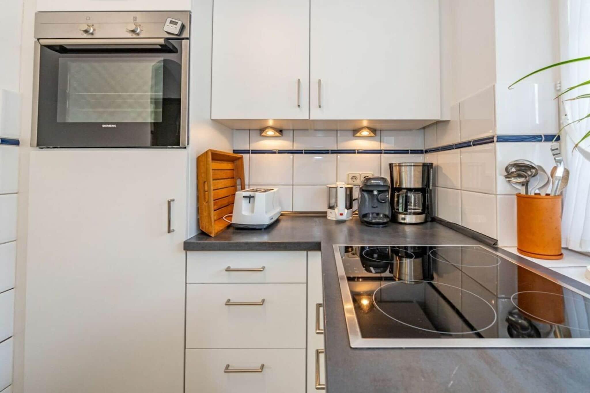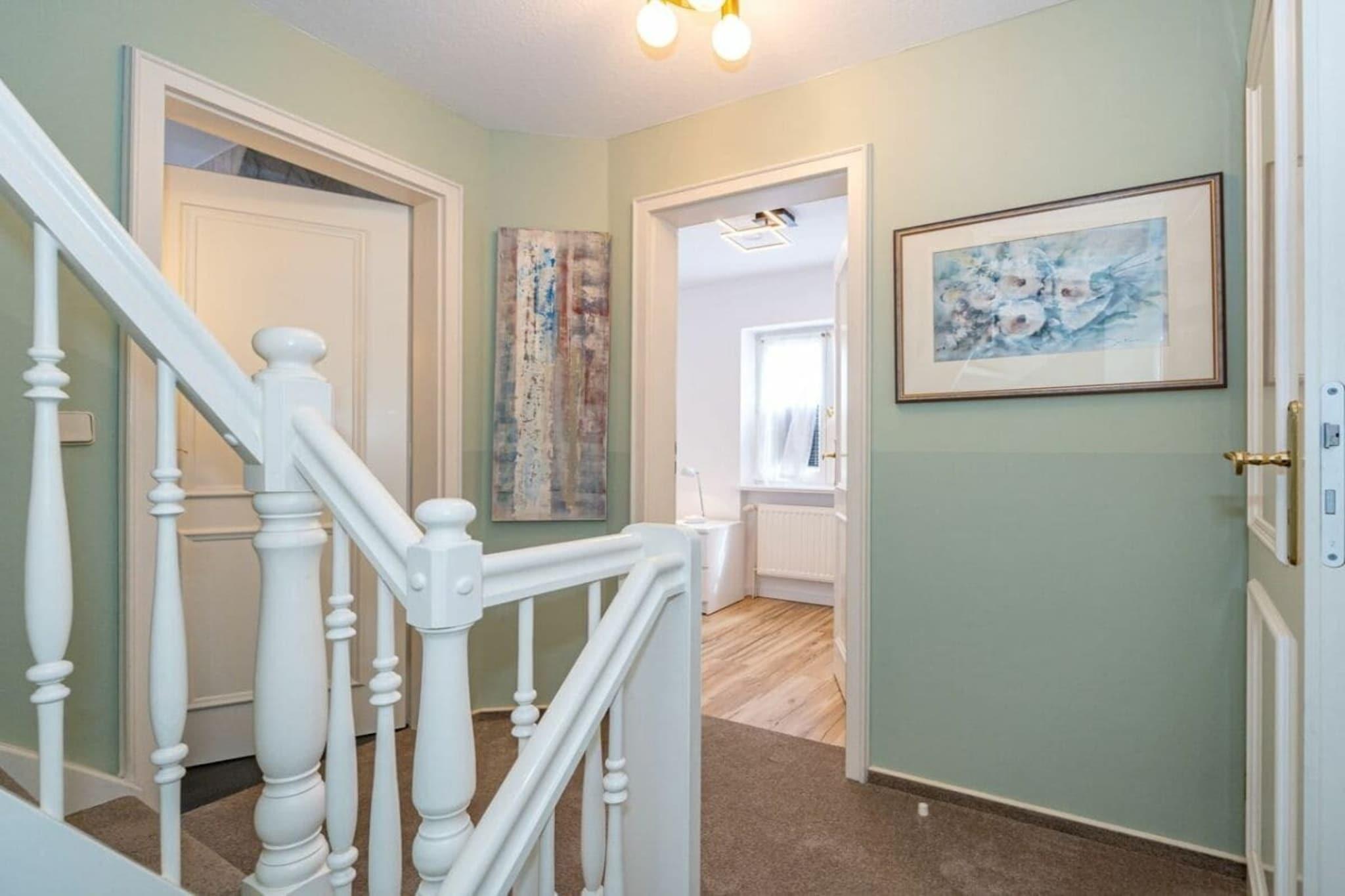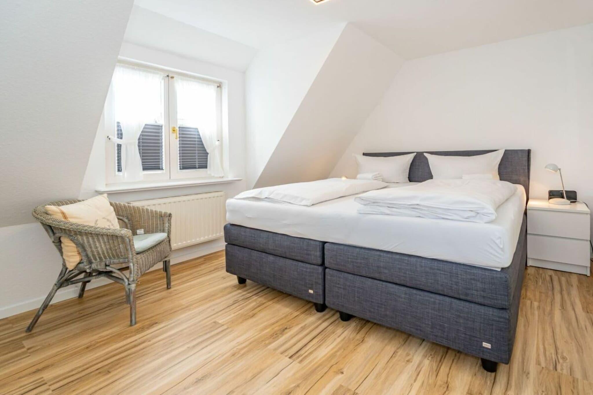 Frisian House "Inselperle im Horsatal" Bright Frisian house on three levels without a basement. On the ground floor, a vestibule leads to a tastefully furnished living-dining room, the heart of the apartment, with a sofa corner and a large dining table for 6 people. The property also features underfloor heating, a cable flat-screen TV, a DVD player, a radio, a telephone, and Wi-Fi. A separate kitchen with a ceramic hob, dishwasher, oven, microwave, and refrigerator is available. A guest toilet is on the ground floor, a shower room on the first floor, and a toilet on the second floor. A Nordic white wooden staircase leads to the upper floor, where there are two bedrooms and a bathroom. The master bedroom has a double bed (2 x 90 cm wide), built-in wardrobes, a cable flat-screen TV, and a desk. The smaller bedroom has a French bed (1.50 m wide) and a built-in wardrobe. The bathroom with shower, toilet, and sink has underfloor heating. Attic with two separate beds (each 90 cm wide) and a toilet with a sink. One small dog is allowed for a fee.