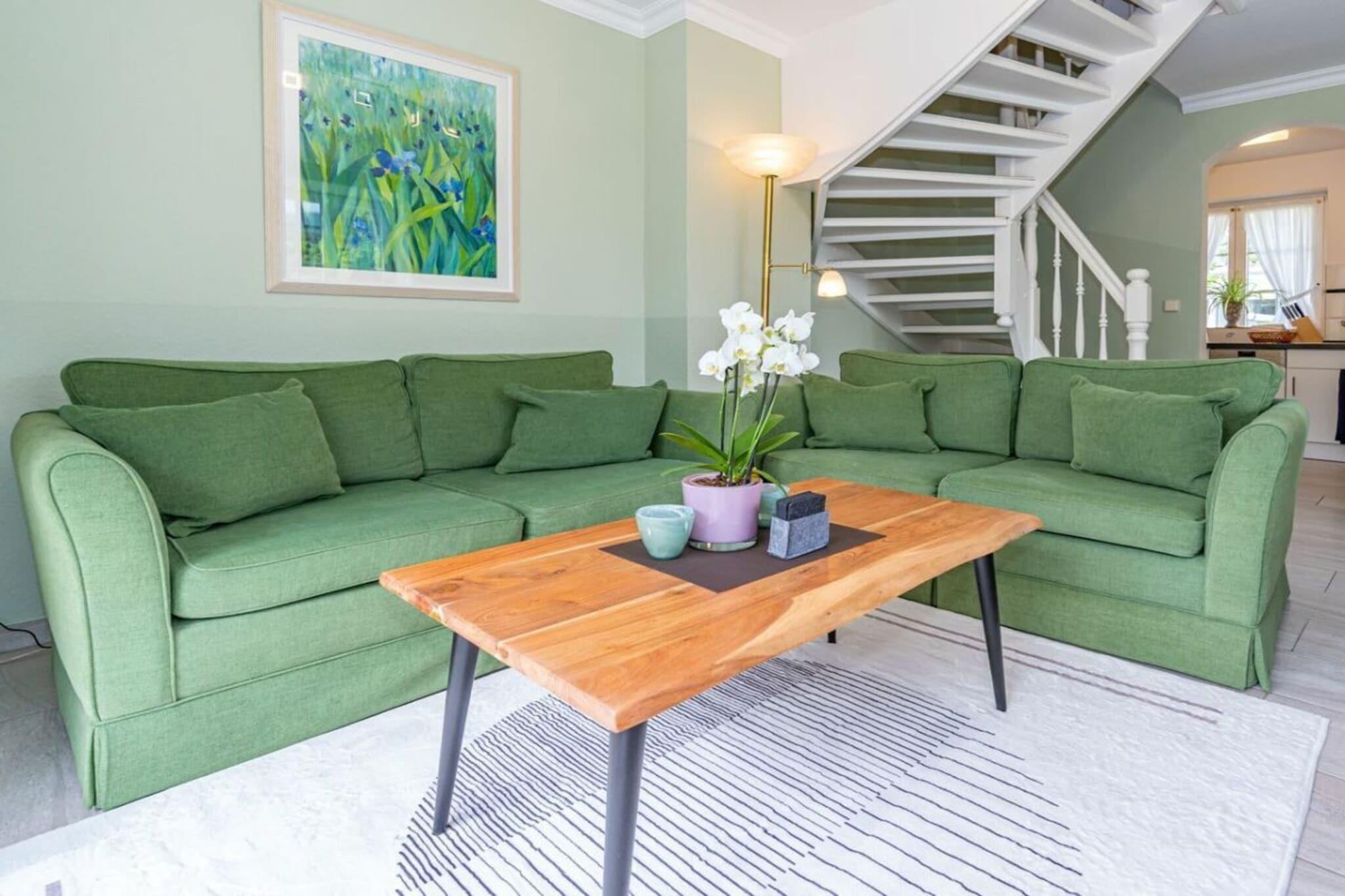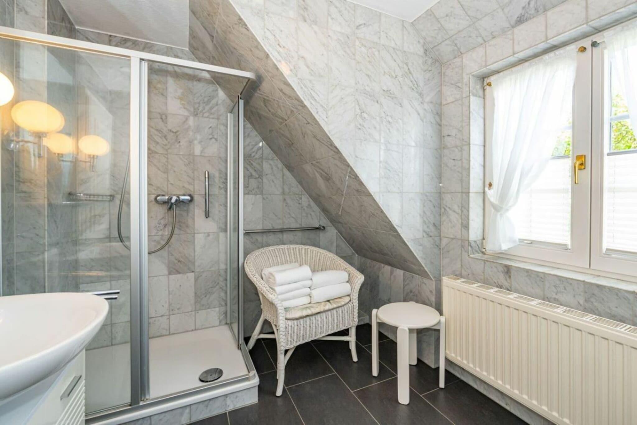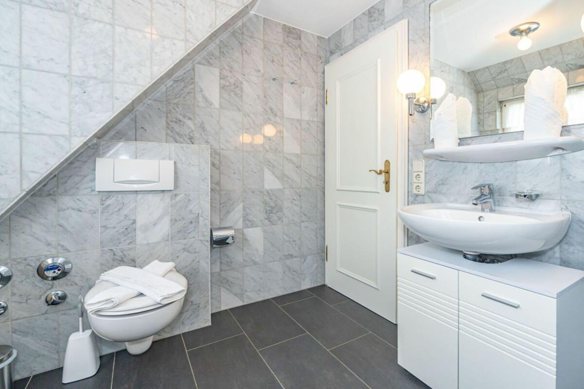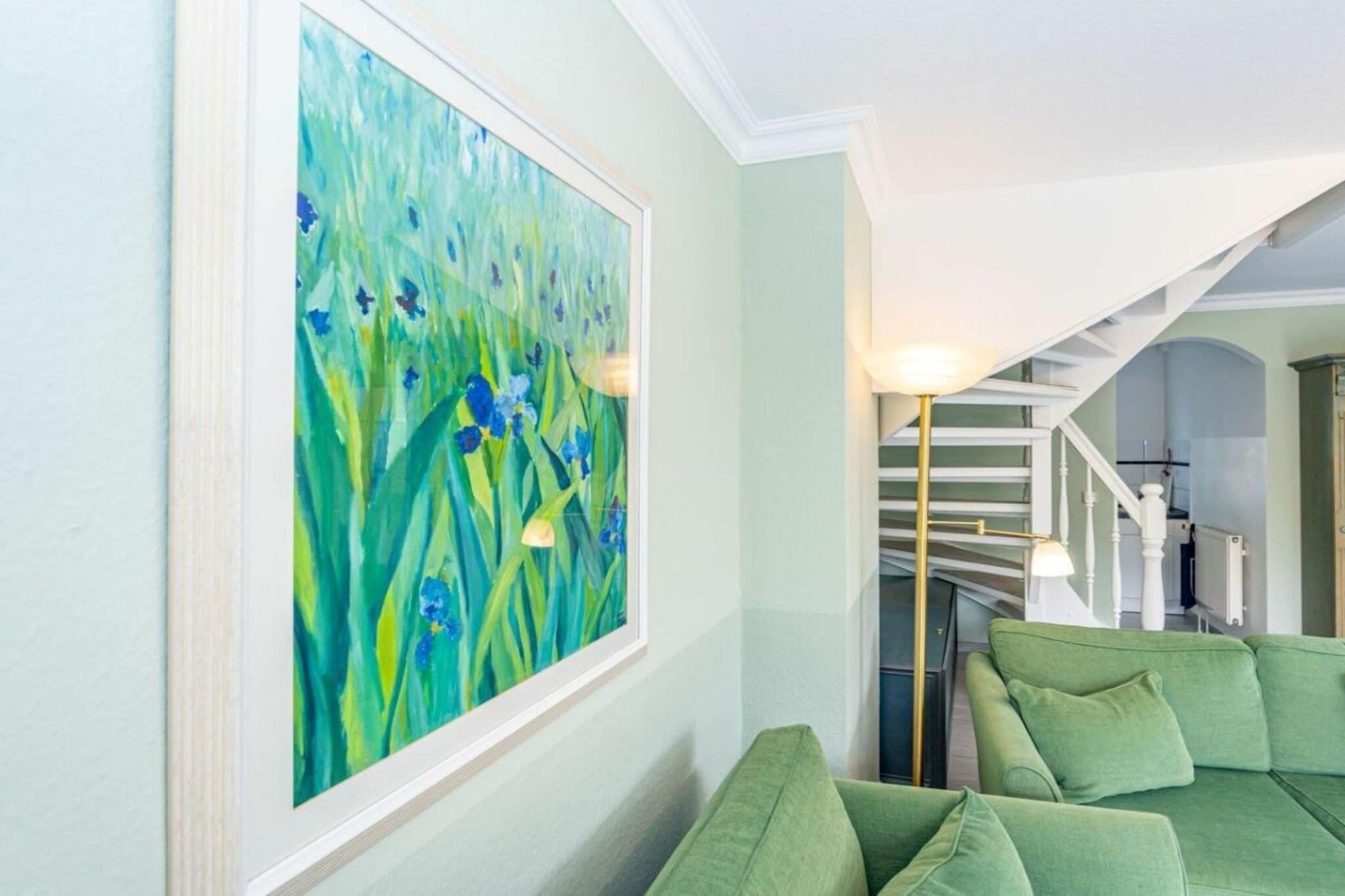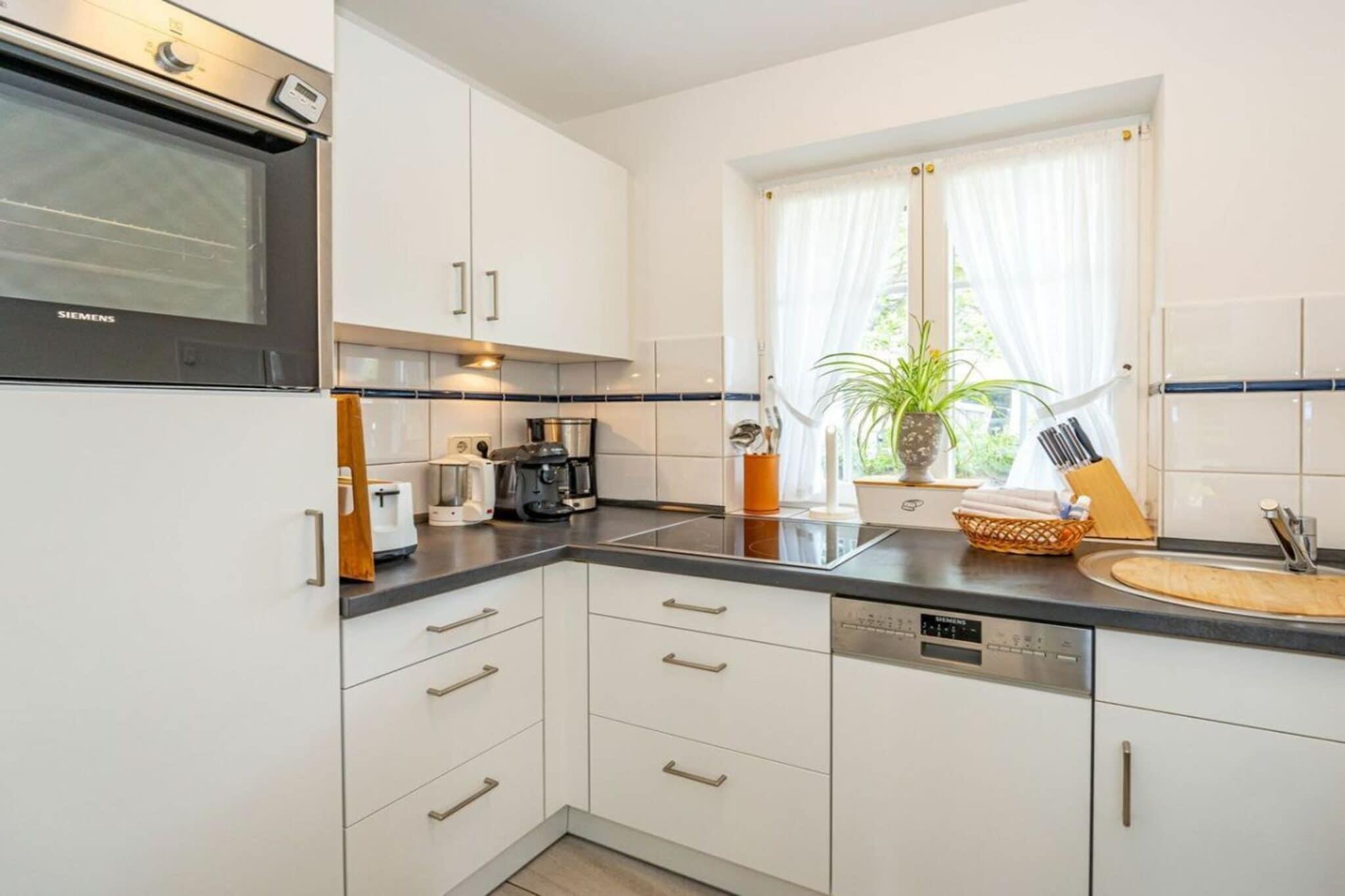 Frisian House "Inselperle im Horsatal" Bright Frisian house on three levels without a basement. On the ground floor, a vestibule leads to a tastefully furnished living-dining room, the heart of the apartment, with a sofa corner and a large dining table for 6 people. The property also features underfloor heating, a cable flat-screen TV, a DVD player, a radio, a telephone, and Wi-Fi. A separate kitchen with a ceramic hob, dishwasher, oven, microwave, and refrigerator is available. A guest toilet is on the ground floor, a shower room on the first floor, and a toilet on the second floor. A Nordic white wooden staircase leads to the upper floor, where there are two bedrooms and a bathroom. The master bedroom has a double bed (2 x 90 cm wide), built-in wardrobes, a cable flat-screen TV, and a desk. The smaller bedroom has a French bed (1.50 m wide) and a built-in wardrobe. The bathroom with shower, toilet, and sink has underfloor heating. Attic with two separate beds (each 90 cm wide) and a toilet with a sink. One small dog is allowed for a fee.