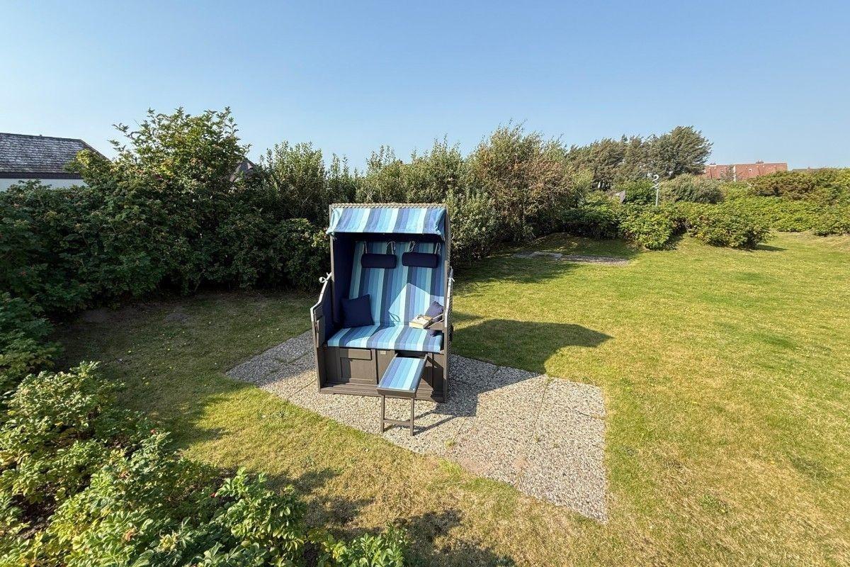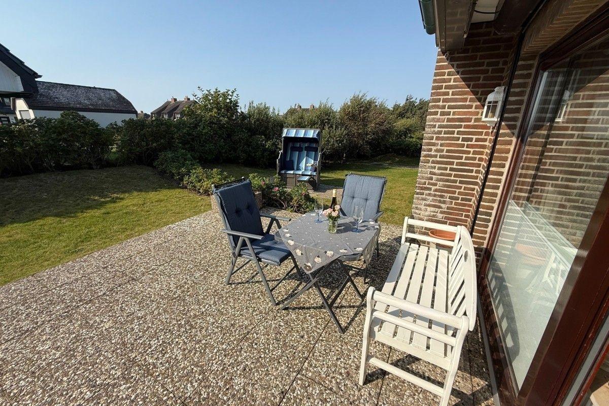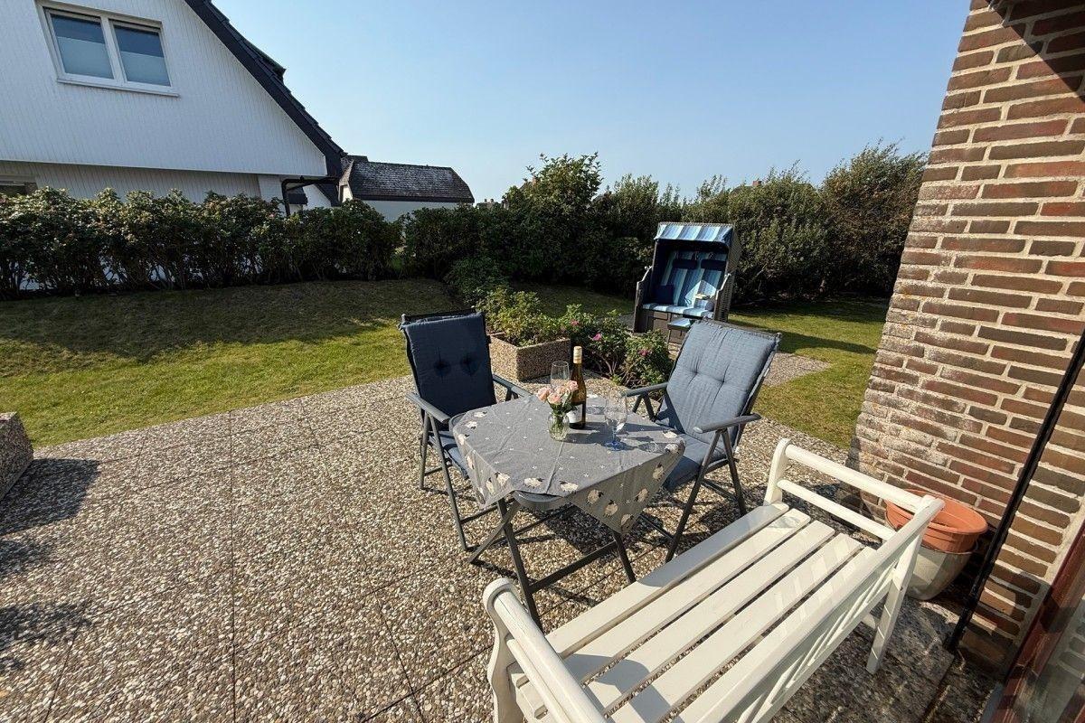 Die große Terrasse mit Strandkorb lädt zu entspannten Stunden unter freiem Himmel ein. Genießen Sie Ihren Kaffee mit Blick ins Grüne oder lassen Sie nach einem Strandtag die salzige Luft auf sich wirken – einfach Urlaub!
