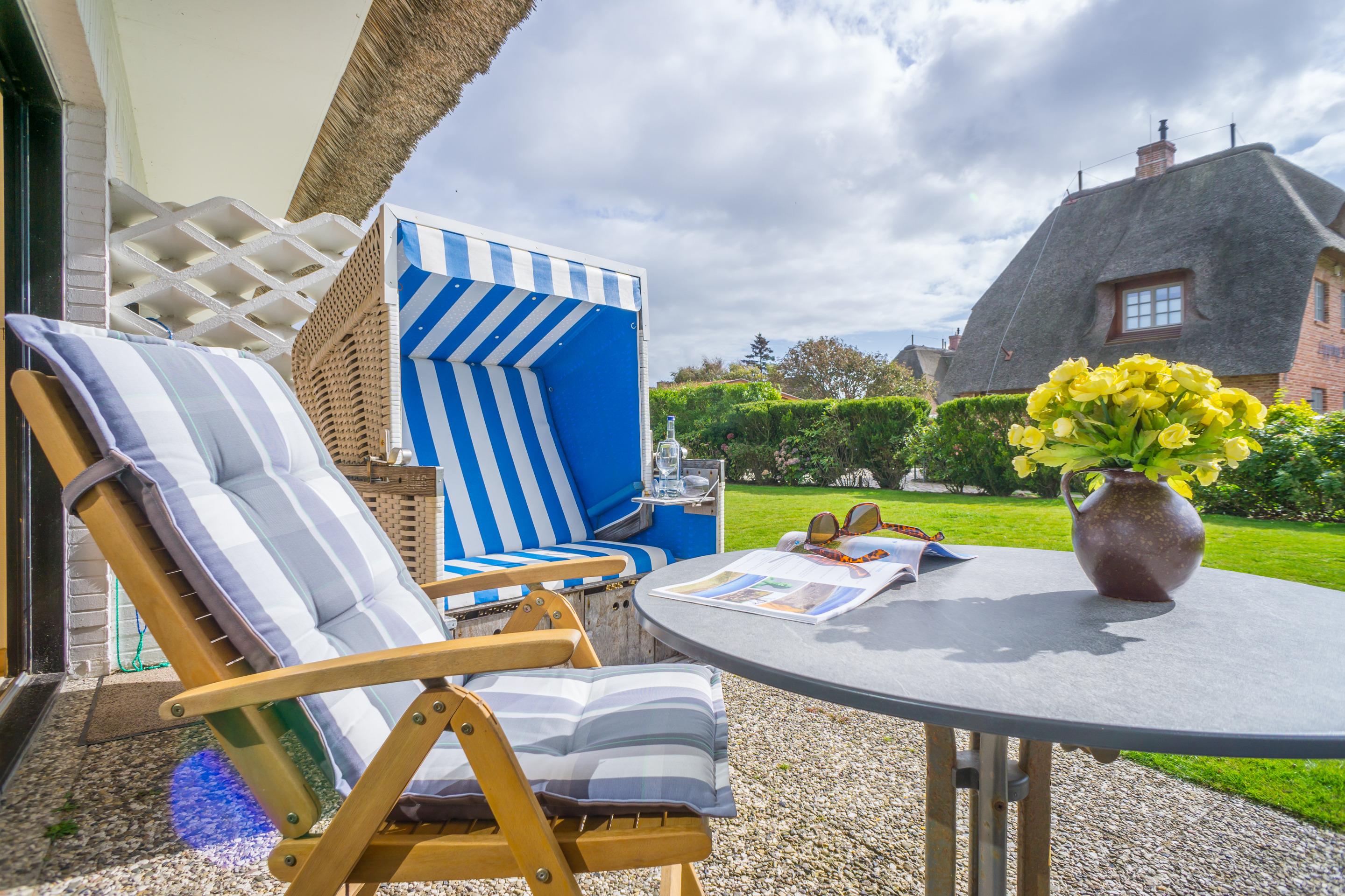 Gemütliche 1,5 Zimmer-Nichtraucher-Ferienwohnung, ca. 40 qm im Parterre zur Südseite mit Südterrasse und Gartenanteil (Strandkorb, Terrassenmöbel mit Auflagen) für max. 2 Personen.