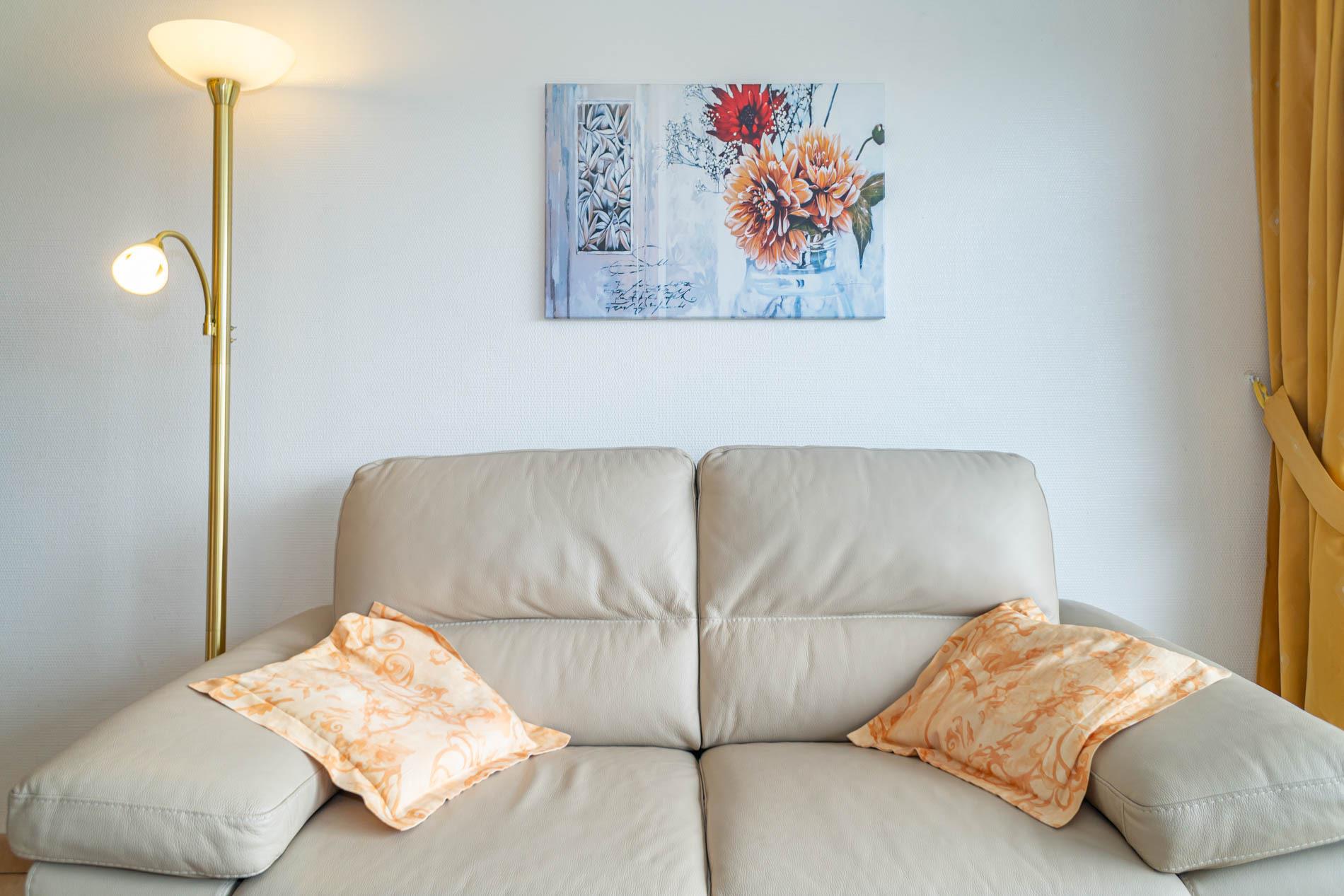 Das Wohnzimmer besteht aus einer Sitzgarnitur (Zweisitzer-Couch, 1 Sessel), einem Essplatz, Kabel-TV, Telefon, W-Lan (ohne Gewähr).