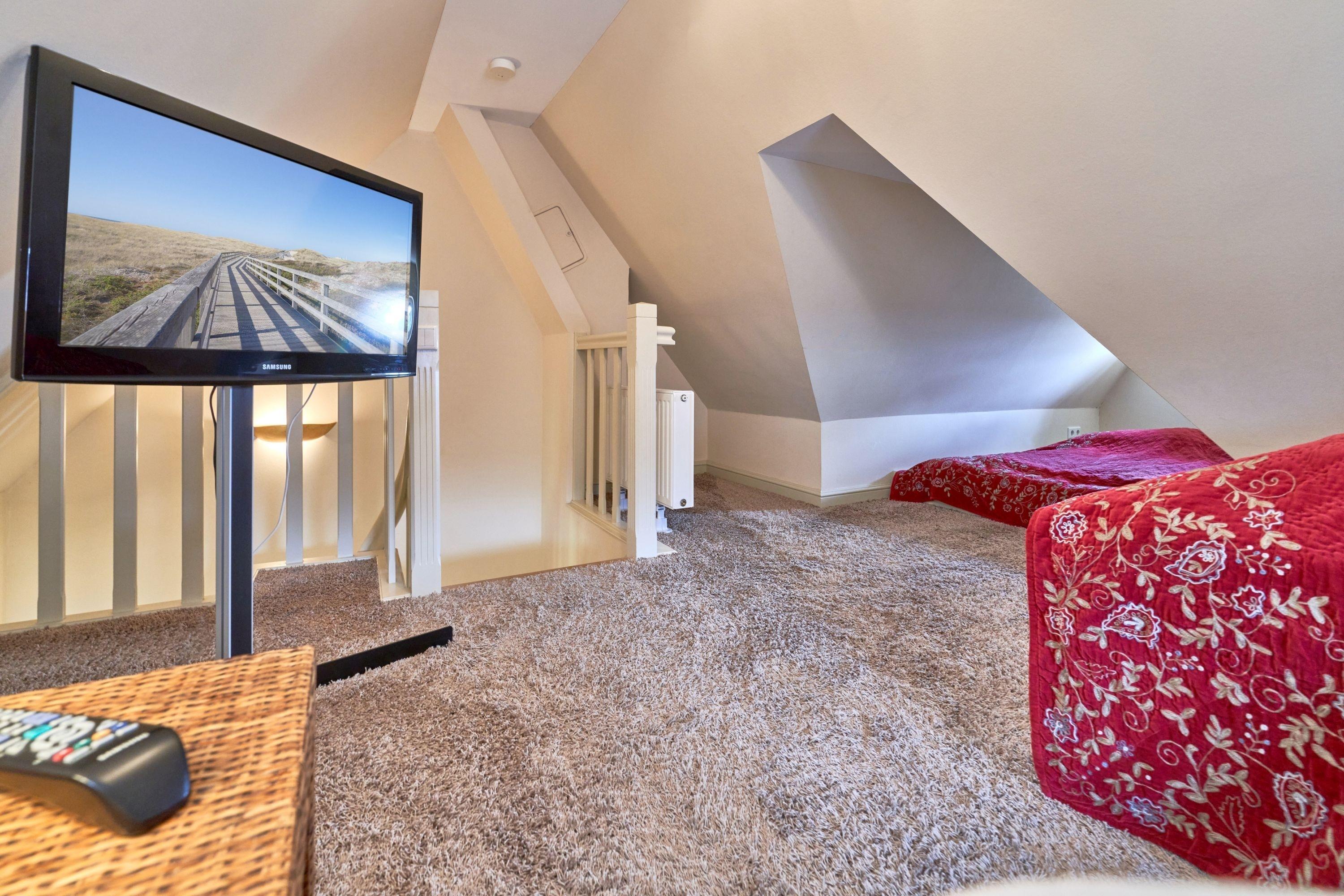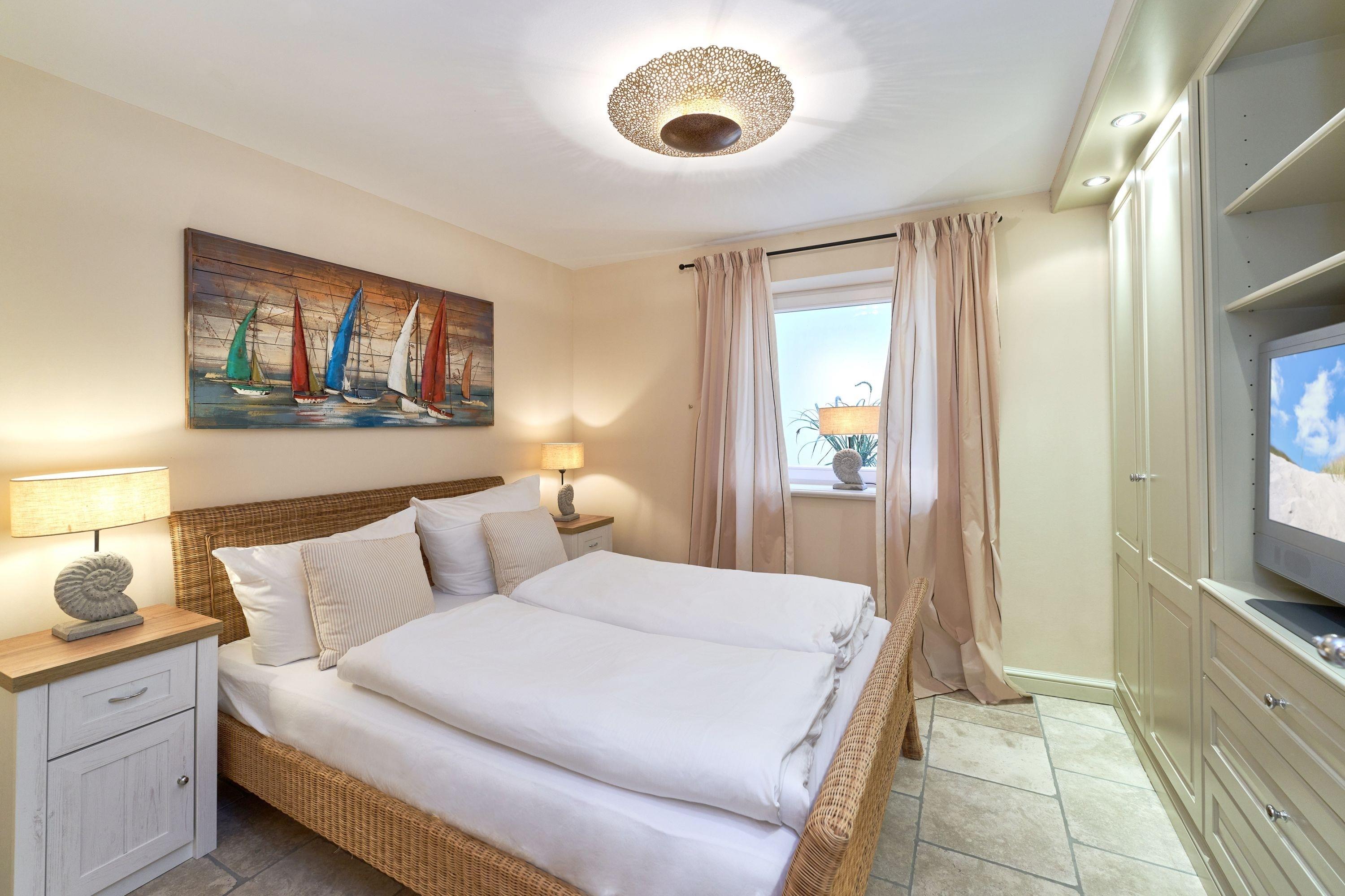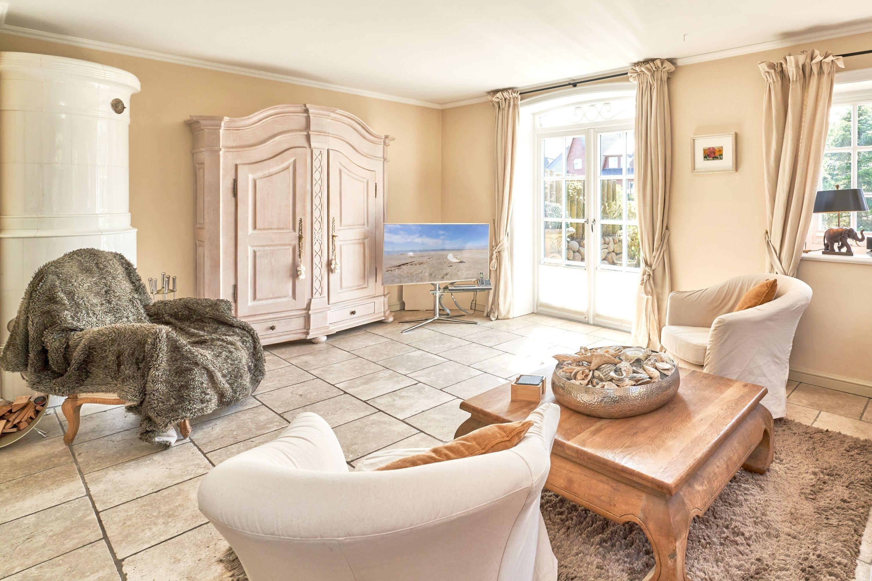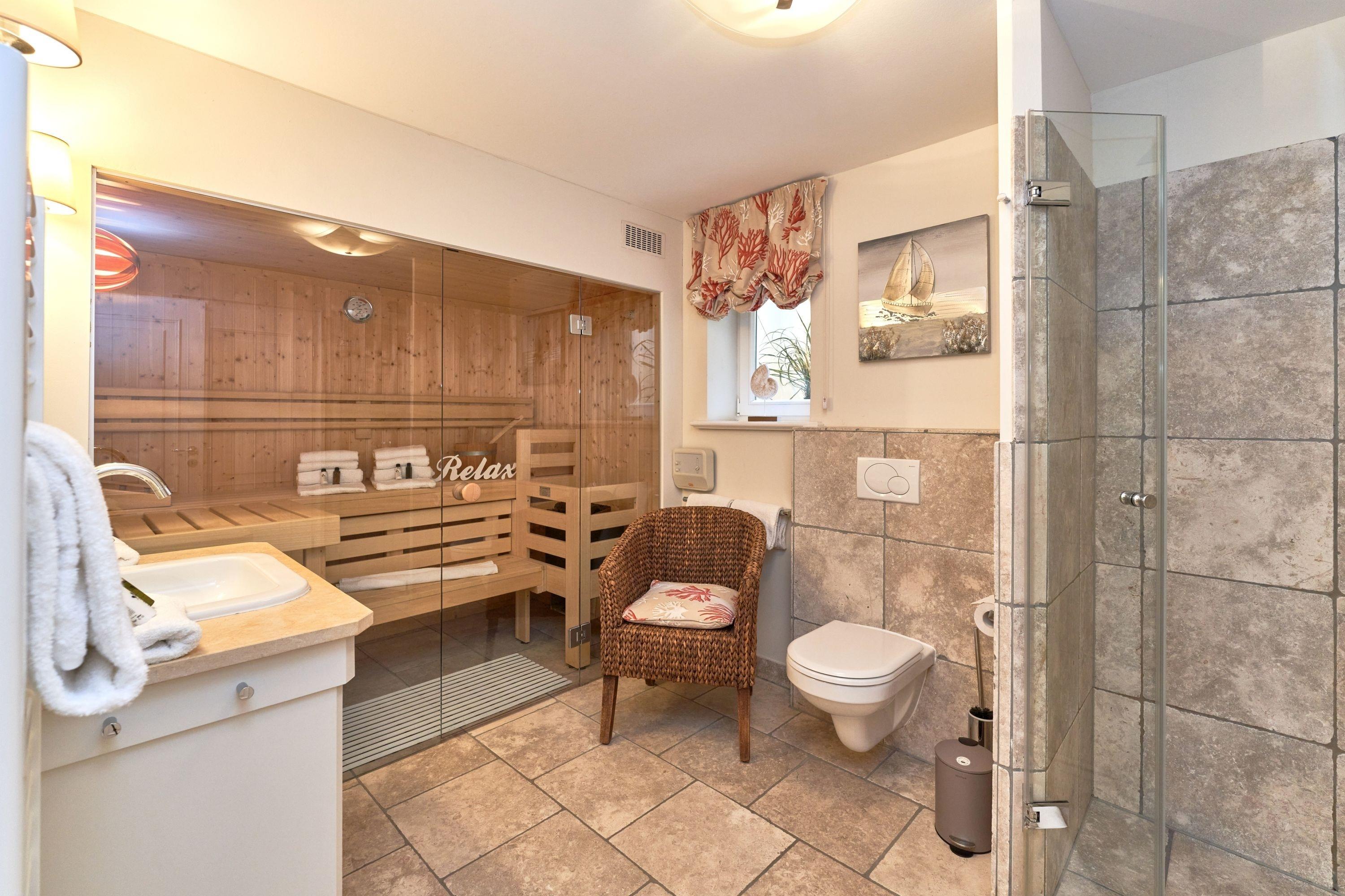 Das Ambiente auf den drei Ebenen des Hauses erfreut durch liebevoll ausgesuchte Ausstattung und im modernen Landhaus Stil. Der lichtdurchflutete Wohnraum, die herrliche Süd-West Terrasse tragen zu ihrem Wohlbefinden bei. Das Sunny Hüs wurde mit sehr viel Liebe zum Detail eingerichtet. Im Erdgeschoss befindet sich die Diele mit seinen großzügigen Garderobenschrank und das angrenzende Gäste - WC. Durch eine Doppeltür betreten Sie ein helles und großzügiges Wohnzimmer mit einem antiken, nordischen Kachelofen, eine offene Küche mit angrenzender Essecke für 6 Personen ist ebenfalls vorhanden. Im Obergeschoss erwartet Sie ein geräumiges Schlafzimmer mit Doppelbett und Schrankeinbauten und der Fußboden ist mit gekelchten Echthausdielen ausgestattet. Außerdem hat das Schlafzimmer noch einen Elektrokamin und verfügt über einen Fernseher. Das angrenzende große Badezimmer mit Dusche und Wanne verfügt noch über ein Waschtisch mit zwei aufgesetzten Waschbecken. Die Diele im Obergeschoss verfügt über einen kleinen separaten Arbeitsplatz und ein Bucherregal. Im Untergeschoss befinden jeweils zwei Schlafzimmer mit einen Doppelbett und Einbauschränken. sowie ein Badzimmer mit Dusche und WC. Für Ihr Wohlbefinden gibt es hier noch eine Sauna mit Glasfront mit Blick in das Badezimmer. Ein kleiner separater Hauswirtschaftraum mit Waschmaschine und Trockner ist ebenfalls vorhanden.