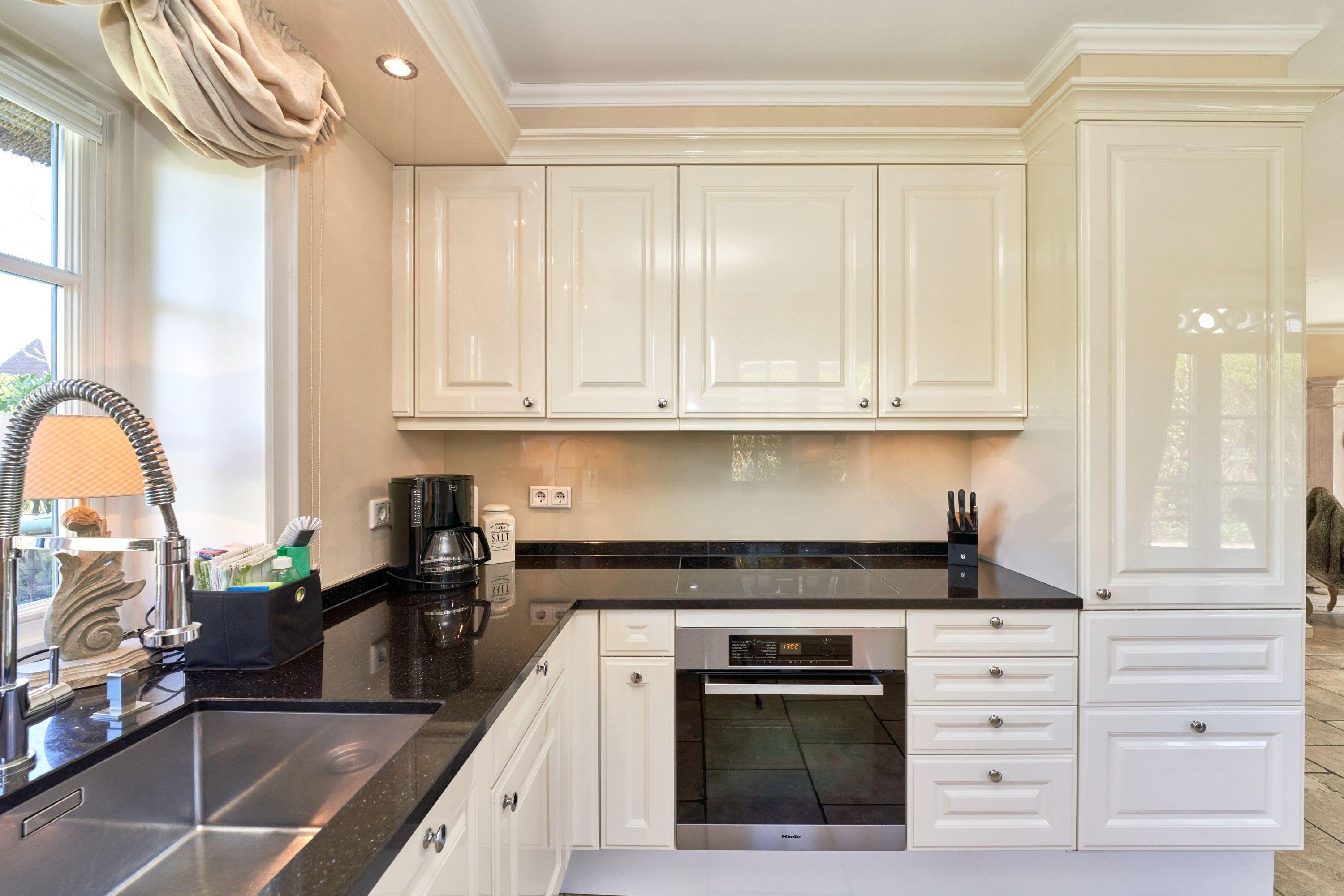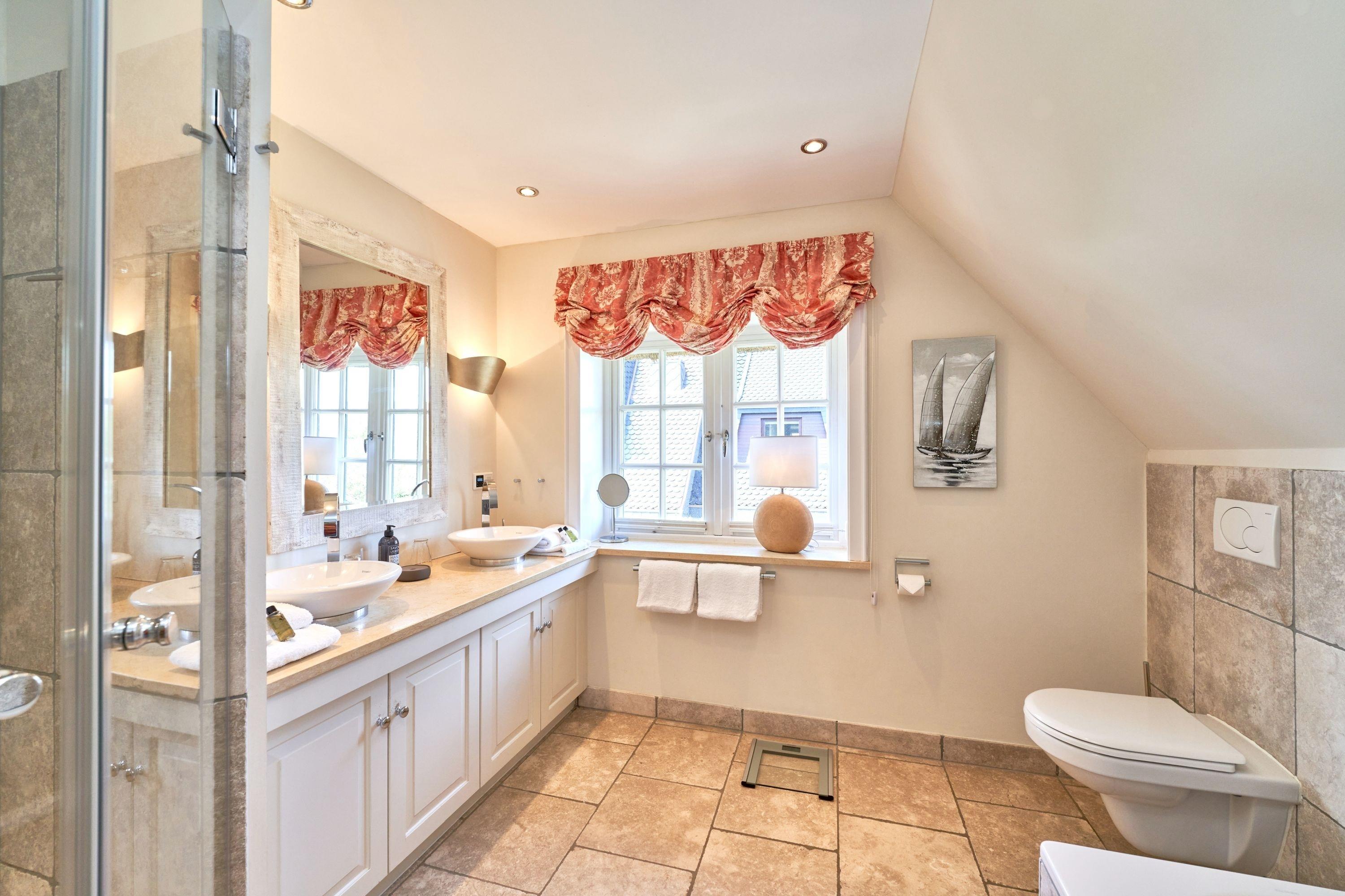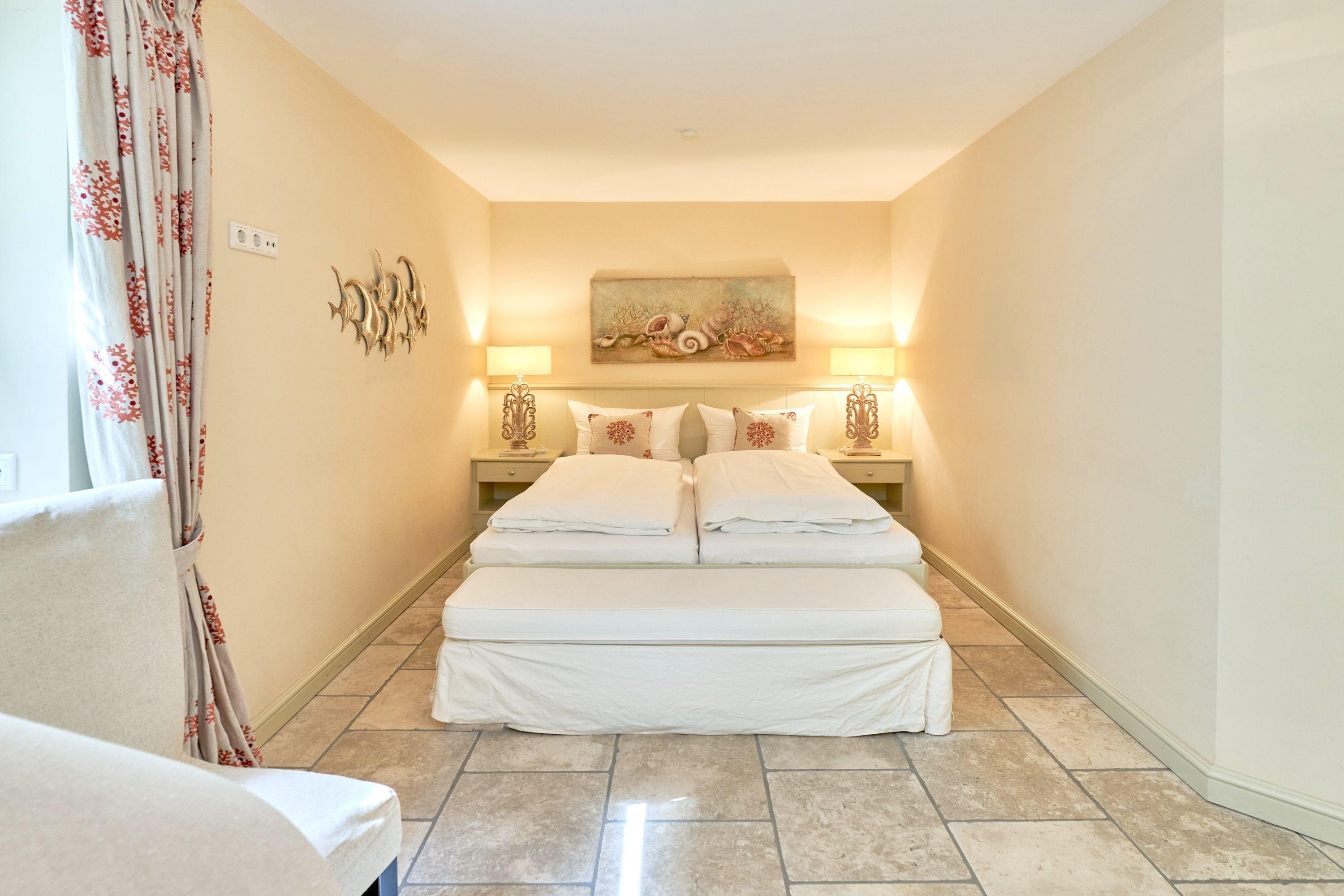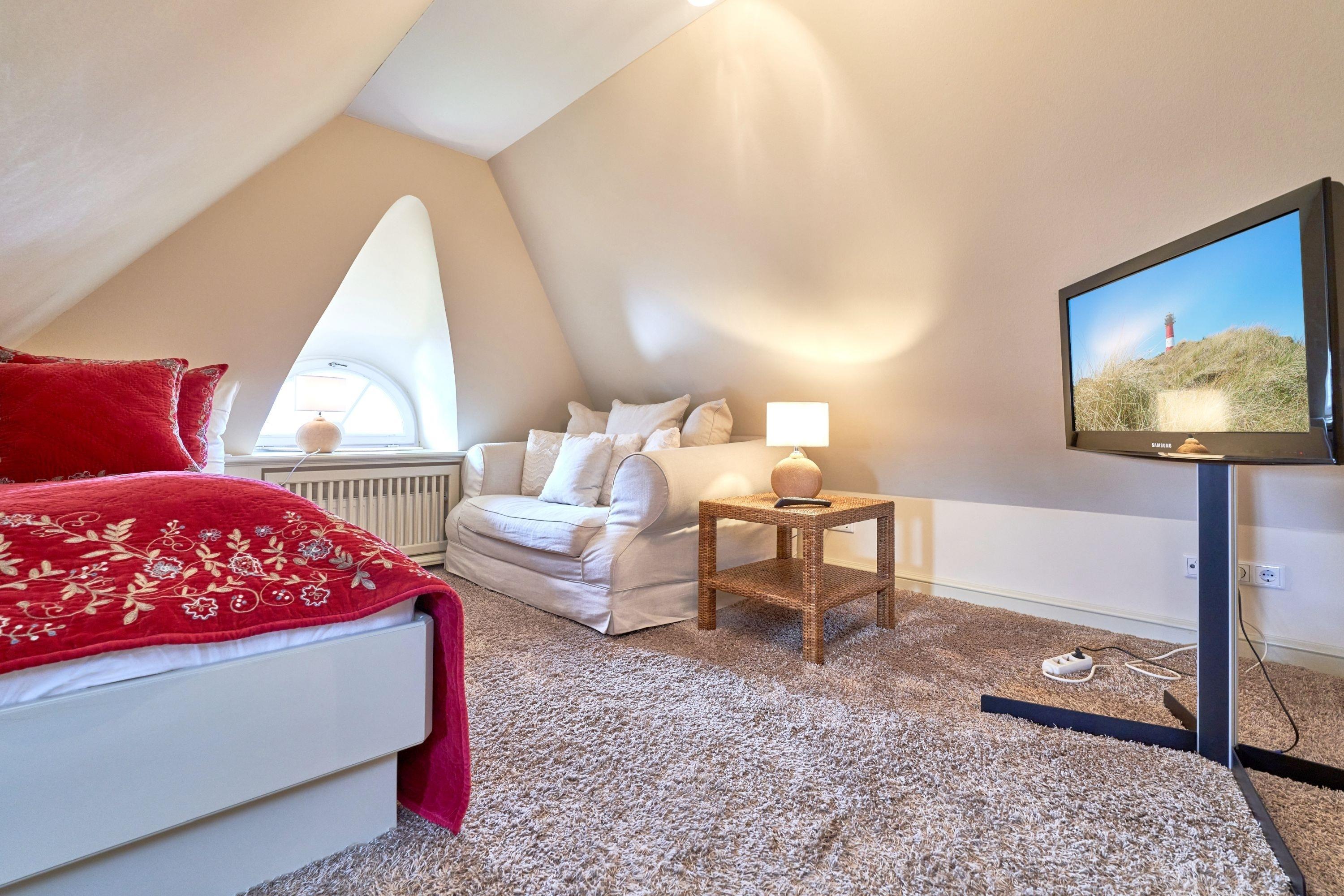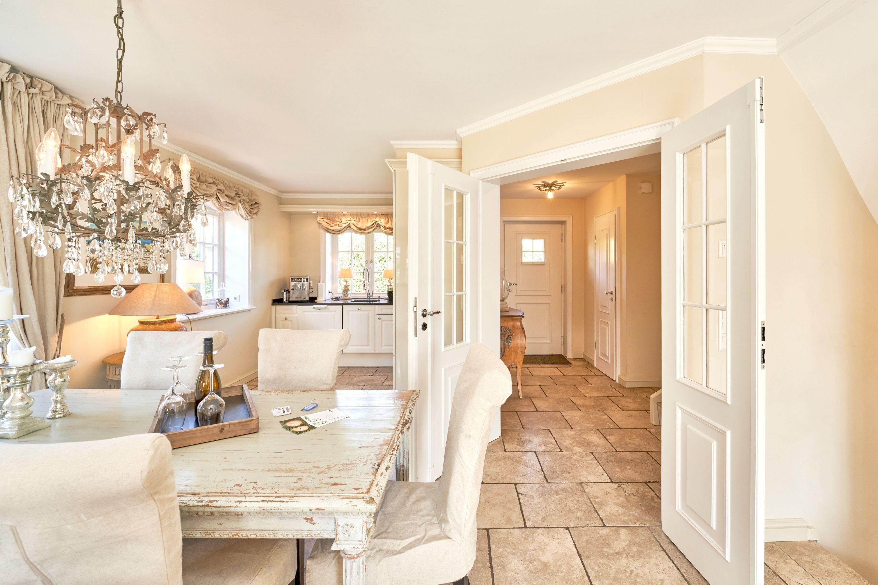 Das Ambiente auf den drei Ebenen des Hauses erfreut durch liebevoll ausgesuchte Ausstattung und im modernen Landhaus Stil. Der lichtdurchflutete Wohnraum, die herrliche Süd-West Terrasse tragen zu ihrem Wohlbefinden bei. Das Sunny Hüs wurde mit sehr viel Liebe zum Detail eingerichtet. Im Erdgeschoss befindet sich die Diele mit seinen großzügigen Garderobenschrank und das angrenzende Gäste - WC. Durch eine Doppeltür betreten Sie ein helles und großzügiges Wohnzimmer mit einem antiken, nordischen Kachelofen, eine offene Küche mit angrenzender Essecke für 6 Personen ist ebenfalls vorhanden. Im Obergeschoss erwartet Sie ein geräumiges Schlafzimmer mit Doppelbett und Schrankeinbauten und der Fußboden ist mit gekelchten Echthausdielen ausgestattet. Außerdem hat das Schlafzimmer noch einen Elektrokamin und verfügt über einen Fernseher. Das angrenzende große Badezimmer mit Dusche und Wanne verfügt noch über ein Waschtisch mit zwei aufgesetzten Waschbecken. Die Diele im Obergeschoss verfügt über einen kleinen separaten Arbeitsplatz und ein Bucherregal. Im Untergeschoss befinden jeweils zwei Schlafzimmer mit einen Doppelbett und Einbauschränken. sowie ein Badzimmer mit Dusche und WC. Für Ihr Wohlbefinden gibt es hier noch eine Sauna mit Glasfront mit Blick in das Badezimmer. Ein kleiner separater Hauswirtschaftraum mit Waschmaschine und Trockner ist ebenfalls vorhanden.